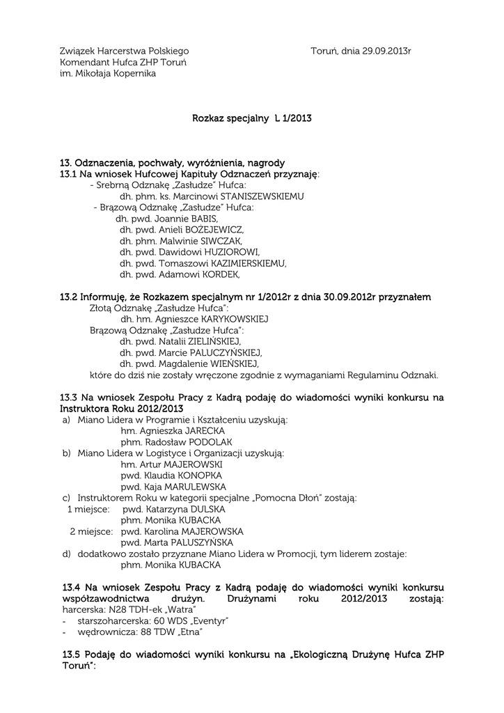 17.Rozkaz LS1 z 29.09.13r - ZHP Hufiec Toruń im. Mikołaja Kopernika