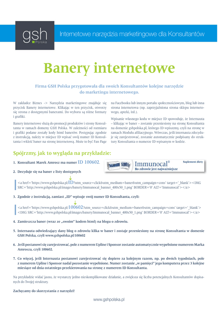 Internetowe narzędzia marketingowe dla Konsultantów Banery internetowe Firma GSH Polska przygotowała dla swoich Konsultantów kolejne narzędzie do marketingu internetowego. W zakładce Biznes -> Narzędzia marketingowe znajduje się przycisk Banery internetowe. Klikając w ten przycisk, otworzy się strona z dostępnymi banerami. Do wyboru są różne formaty i grafiki. Banery internetowe służą do promocji produktów i strony Konsultanta w ramach domeny GSH Polska. W zależności od rozmiaru i grafiki podane zostały kody html banerów. Postępując zgodnie z instrukcją, należy w miejsce ID wpisać swój numer ID Konsultanta i wkleić baner na stronę internetową. Może to być Fan Page na Facebooku lub innym portalu społecznościowym, blog lub inna strona internetowa (np. zaprzyjaźniona strona sklepu internetowego, apteki, itd.). Wpisanie własnego kodu w miejsce ID spowoduje, że Internauta – klikając w baner – zostanie przeniesiony na stronę Konsultanta na domenie gshpolska.pl, którego ID wpiszemy, czyli na stronę w ramach Modułu afiliacyjnego. Wówczas, jeśli internauta zdecyduje się zarejestrować, zostanie automatycznie podpisany do struktury Konsultanta o numerze ID wpisanym w kodzie. Spójrzmy, jak to wygląda na przykładzie: 1. Konsultant Marek Amrosz ma numer ID 100602. 2. Decyduje się na baner z listy dostępnych <a href=’https://www.gshpolska.pl/ID?utm_source=click&utm_medium=baner&utm_campaign=cons’ target=’_blank’><IMG SRC=’http://www.gshpolska.pl/images/banery/Immunocal_banner_400x50_1.png’ BORDER=’0’ ALT=’Immunocal’></a> 3. Zgodnie z instrukcją, zamiast „ID” wpisuje swój numer ID Konsultanta, czyli: <a href=’https://www.gshpolska.pl/100602?utm_source=click&utm_medium=baner&utm_campaign=cons’ target=’_blank’> <IMG SRC=’http://www.gshpolska.pl/images/banery/Immunocal_banner_400x50_1.png’ BORDER=’0’ ALT=’Immunocal’></a> 4. Zamieszcza baner (wraz ze „swoim” kodem html) na blogu o zdrowiu. 5. Internauta odwiedzający dany blog o zdrowiu klika w baner i zostaje przeniesiony na stronę Konsultanta w domenie GSH Polska, czyli www.gshpolska.pl/100602 6. Jeśli postanowi się zarejestrować, pole z numerem Upline i Sponsor zostanie automatycznie wypełnione numerem Marka Amrosza, czyli 100602. 7. Co więcej, jeśli Internauta postanowi zarejestrować się dopiero za kolejnym razem, np. po dwóch tygodniach, pole z numerem Upline i Sponsor nadal pozostanie wypełnione. Numer zostanie „w pamięci” jego komputera przez 3 kolejne miesiące od dnia ostatniego przekierowania na stronę z numerem ID Konsultanta. Na przykładzie widać jasno, że wystarczy jedno nieskomplikowane działanie, a zwiększa się liczba potencjalnych Konsultantów dopisanych do Twojej struktury. Zachęcamy do skorzystania z narzędzi! www.gshpolska.pl