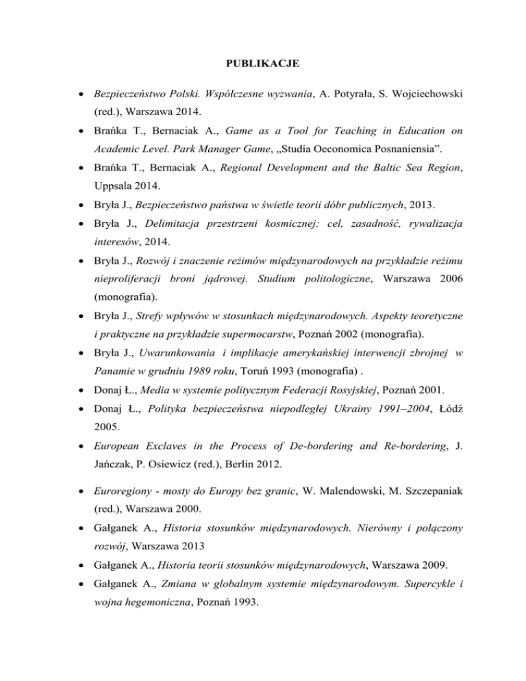 PUBLIKACJE Bezpieczeństwo Polski. Współczesne wyzwania, A. Potyrała, S. Wojciechowski (red.), Warszawa 2014. Brańka T., Bernaciak A., Game as a Tool for Teaching in Education on Academic Level. Park Manager Game, „Studia Oeconomica Posnaniensia”. Brańka T., Bernaciak A., Regional Development and the Baltic Sea Region, Uppsala 2014. Bryła J., Bezpieczeństwo państwa w świetle teorii dóbr publicznych, 2013. Bryła J., Delimitacja przestrzeni kosmicznej: cel, zasadność, rywalizacja interesów, 2014. Bryła J., Rozwój i znaczenie reżimów międzynarodowych na przykładzie reżimu nieproliferacji broni jądrowej. Studium politologiczne, Warszawa 2006 (monografia). Bryła J., Strefy wpływów w stosunkach międzynarodowych. Aspekty teoretyczne i praktyczne na przykładzie supermocarstw, Poznań 2002 (monografia). Bryła J., Uwarunkowania i implikacje amerykańskiej interwencji zbrojnej w Panamie w grudniu 1989 roku, Toruń 1993 (monografia) . Donaj Ł., Media w systemie politycznym Federacji Rosyjskiej, Poznań 2001. Donaj Ł., Polityka bezpieczeństwa niepodległej Ukrainy 1991–2004, Łódź 2005. European Exclaves in the Process of De-bordering and Re-bordering, J. Jańczak, P. Osiewicz (red.), Berlin 2012. Euroregiony - mosty do Europy bez granic, W. Malendowski, M. Szczepaniak (red.), Warszawa 2000. Gałganek A., Historia stosunków międzynarodowych. Nierówny i połączony rozwój, Warszawa 2013 Gałganek A., Historia teorii stosunków międzynarodowych, Warszawa 2009. Gałganek A., Zmiana w globalnym systemie międzynarodowym. Supercykle i wojna hegemoniczna, Poznań 1993. Indie w XXI wieku. Wybrane problemy, A. Potyrała, M. Skobrtal (red.), Poznań 2009. Jan Paweł II – w kręgu myśli politycznej i dyplomacji, M. Wilk, Ł. Donaj (red.), Łódź 2009. Leksykon współczesnych międzynarodowych stosunków politycznych, W. Malendowski, C. Mojsiewicz, Wrocław 2004. Lorenc M., Banksy a sprawa palestyńska - przypadek jednego politycznego muralu w Betlejem, „Środkowoeuropejskie Studia Polityczne” 2013, nr 4. Lorenc M., EUJUST LEX – zintegrowana misja Unii Europejskiej w Iraku dotycząca państwa prawnego, w: B. Przybylska-Maszner (red.), Misje cywilne Unii Europejskiej, Poznań 2010. Lorenc M., Obok. Polska – Niemcy. 1000 lat historii w sztuce jako przykład wystawy politycznej, „Przegląd Politologiczny” 2013, nr 3. Lorenc M., Pierwsza wojna arabsko-izraelska, w: A. Potyrała, J. Raubo (red.), Problemy bezpieczeństwa na Bliskim Wschodzie, Poznań 2010. Lorenc M., Polityczność sztuki. Analiza pracy Zbigniewa Libery pt. LEGO. Obóz koncentracyjny z 1996 roku, „Przegląd Politologiczny” 2012, nr 3. Lorenc M., Potyrała A., Brańka T., Osiewicz P., Irak – między wojną a pokojem, Toruń 2010. Lorenc M., Subject in contemporary feminism, w: I. Andruszkeiwicz, A. Balczyńska-Kosman (red.), The participation of women in the media and in politics – an international dimension, Poznań 2010. Lorenc M., Temat polityczny w sztuce krytycznej na przykładzie „Fear and Trembling” Grzegorza Klamana, „Środkowoeuropejskie Studia Polityczne” 2012, nr 4. Lorenc M., The Arab Spring in Libya, w: B. Przybylska-Maszner (red.), The Arab Spring, Poznań 2011. Malendowski W., Kobiety w polityce. Wybrane problemy, Poznań 1996. Malendowski W., Polityka bezpieczeństwa RP. Uwarunkowania – strategia kierunki działania, Poznań 1998. Malendowski W., Ratajczak M., Euroregiony: polski krok do integracji, Wrocław 2000. Malendowski W., Zimna wojna: sprzeczności, konflikty i punkty kulminacyjne w radziecko-amerykańskiej rywalizacji, Poznań 2004. Media a Polityka. Materiały z międzynarodowej konferencji naukowej Media a Polityka, A. M. Zarychta, Ł. Donaj, M. Kosiarz, A. Barański (red.), Łódź 2007. Nowy ład międzynarodowy in statu nascendi, W. Malendowski (red.), Poznań 1993. Osiewicz P., Iran: Regional Policy After 2005, „The Polish Quarterly of International Affairs” 2008, Vol. 17, No. 3. Osiewicz P., Konflikt cypryjski, Warszawa 2013. Osiewicz P., Pokojowa regulacja kwestii cypryjskiej. Aspekty prawne i polityczne, Toruń 2008. Osiewicz P., Schweers P., Die Militärs - Hüter der Republik?, „WeltTrends” 2008, No. 62. Osiewicz P., Wstęp, w: Konstytucja Republiki Cypryjskiej, Warszawa 2013. Poland's Security. Contemporary Domestic and International Issues, A. Potyrała, S. Wojciechowski (red.), Berlin 2013. Poland-Turkey: 600 Years of Friendship, M. Kural, V. Ayhan, P. Osiewicz (red.), Ankara 2014. Potyrała A., Działania zewnętrzne Unii Europejskiej wobec państw nieuznawanych, „Przegląd Zachodni” 2013, nr 1. Potyrała A., Ochrona w przypadku usunięcia z terytorium państwa, wydalenia lub ekstradycji, w: Karta Praw Podstawowych Unii Europejskiej, A. Wróbel (red.), Warszawa 2013. Potyrała A., Partnership between the European Union and Russia: Reality or Illusion?, w: Ρоссия-Пољша: актуаљные вопросы сотрудничества, Moskwa 2013. Potyrała A., Prawne aspekty bezpieczeństwa Polski, w: Kluczowe determinanty bezpieczeństwa Polski na początku XXI wieku, S. Wojciechowski, A. Wejkszner (red.), Warszawa 2013. Potyrała A., Prawo do azylu, w: Karta Praw Podstawowych Unii Europejskiej, A. Wróbel (red.), Warszawa 2013. Problemy bezpieczeństwa na Bliskim Wschodzie, A. Potyrała, J. Raubo, Poznań 2010. Spory - konflikty zbrojne - terroryzm. Dysfunkcjonalne czynniki współczesnych stosunków międzynarodowych, W. Malendowski (red.), Poznań 2006. Spory i konflikty międzynarodowe. Aspekty prawne i polityczne, W. Malendowski (red.), Wrocław 1999. Stosunki międzynarodowe, W. Malendowski, C. Mojsiewicz, Wrocław 2004. Świat współczesny. Wyzwania, zagrożenia i współzależności w procesie budowy nowego porządku międzynarodowego, W. Malendowski (red.), Poznań 2008. Turcja w stosunkach międzynarodowych, Ł. Donaj, M. Sempach (red.), Łódź 2011. Unia Europejska we współczesnym świecie. Wybran