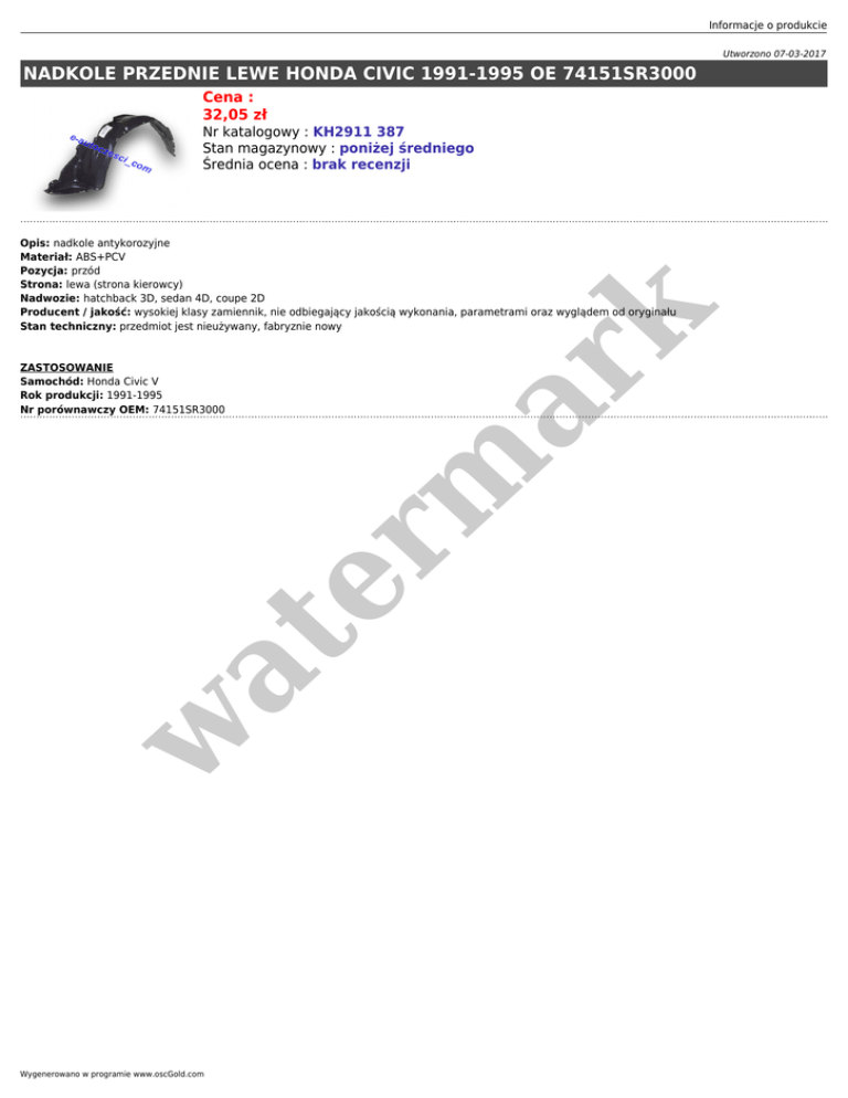 Informacje o produkcie Utworzono 07-03-2017 NADKOLE PRZEDNIE LEWE HONDA CIVIC 1991-1995 OE 74151SR3000 Cena : 32,05 zł Nr katalogowy : KH2911 387 Stan magazynowy : poniżej średniego Średnia ocena : brak recenzji w at ZASTOSOWANIE Samochód: Honda Civic V Rok produkcji: 1991-1995 Nr porównawczy OEM: 74151SR3000 er m ar k Opis: nadkole antykorozyjne Materiał: ABS+PCV Pozycja: przód Strona: lewa (strona kierowcy) Nadwozie: hatchback 3D, sedan 4D, coupe 2D Producent / jakość: wysokiej klasy zamiennik, nie odbiegający jakością wykonania, parametrami oraz wyglądem od oryginału Stan techniczny: przedmiot jest nieużywany, fabryznie nowy Wygenerowano w programie www.oscGold.com