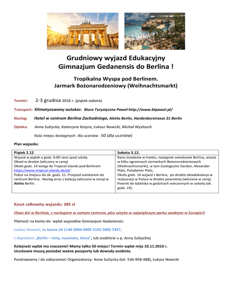 Grudniowy wyjazd Edukacyjny Gimnazjum Gedanensis do Berlina ! Tropikalna Wyspa pod Berlinem. Jarmark Bożonarodzeniowy (Weihnachtsmarkt) Termin: 2-3 grudnia 2016 r. (piątek-sobota) Transport: Klimatyzowany autokar. Biuro Turystyczne Paweł http://www.btpawel.pl/ Nocleg: Hotel w centrum Berlina Zachodniego, Aletto Berlin, Hardenberstrasse 21 Berlin Opieka: Anna Sulżycka, Katarzyna Kozyra, Łukasz Nowicki, Michał Wysłouch Ilość miejsc dostępnych dla uczniów : 50 (dla uczniów) Plan wyjazdu: Piątek 2.12 Sobota 3.12. Wyjazd w piątek o godz. 6:00 rano spod szkoły. Obiad w drodze (wliczony w cenę). Około godz. 14 wstęp do Tropical Islands pod Berlinem https://www.tropical-islands.de/pl/ Pobyt na miejscu do ok. godz. 21. Przejazd autokarem do centrum Berlina. Nocleg wraz z kolacją (wliczona w cenę) w Aletto Berlin. Rano śniadanie w hotelu, następnie zwiedzanie Berlina, wizyta w kilku ogromnych Jarmarkach Bożonarodzeniowych (Weihnachtsmarkt), w tym Zoologische Garden, Alexander Platz, Potsdamer Platz, Około godz. 16 wyjazd z Berlina, po drodze obiadokolacja w restauracji w Polsce w drodze powrotnej (wliczona w cenę). Powrót do Gdańska w godzinach wieczornych w sobotę (ok. godz. 23). Koszt całkowity wyjazdu: 385 zł (Dwa dni w Berlinie, z noclegiem w samym centrum, plus wizyta w największym parku wodnym w Europie!) Płatność na konto do wpłat wyjazdów Gimnazjum Gedanensis: Łukasz Nowicki, nr konta 24 1140 2004 0000 3102 3085 7457, z dopiskiem „Berlin – Imię, nazwisko, klasa”, lub osobiście u p. Anny Sulżyckiej Kolejność wpłat ma znaczenie! Mamy tylko 50 miejsc! Termin wpłat mija 10.11.2016 r. Uczniowie muszą posiadać ważne paszporty lub dowody osobiste. Pozdrawiamy i do zobaczenia! Organizatorzy: Anna Sulżycka (tel. 536-958-488), Łukasz Nowicki Berlin, Gimnazjum Gedanensis 2-3.12.2016 r. Jak się spakować? Bagaż powinien składać się z trzech odrębnych części. A. Torba główna - bagaż do luku bagażowego w autobusie, wkładamy ją w Gdańsku przed wyjazdem, wyjmujemy wieczorem w Berlinie pod hotelem. B. Plecak (torba) na Tropikalną Wyspę. bagaż do luku bagażowego w autobusie, wkładamy ją w Gdańsku przed wyjazdem, wyjmujemy przed wejściem do Tropikalnej Wyspy. Bierzemy do niej wszystko co potrzebne nam będzie przez kilka godzin pobytu na wyspie. Strój kąpielowy, okularki (przydadzą się, nie są obowiązkowe), ręcznik, klapki (obowiązkowe!), lekki strój do chodzenia po terenie (krótkie spodenki, koszulka) - to ogromny teren i nie każdy będzie cały czas pływał;). Na tropikalnej wyspie są bezpieczne przebieralnie, także proszę abyście nie zakładali strojów do pływania już w Gdańsku (wiem, że mogą zdążyć się takie pomysły;)). Będzie takie pytanie, więc odpowiadamy: na wyspie nie obowiązują czepki! Wewnątrz hali panuje temperatura 26°C, co w połączeniu z wilgotnością powietrza wynoszącą około 64% przyczynia się do ciepłego, „tropikalnego” mikroklimatu, także na pewni nie zmarzniemy!;) W plecak dobrze jest spakować również dodatkowy posiłek. Cena posiłków na Wyspie w restauracjach i barach znajdujących się tam zaczyna się od 7-8 euro, więc dobrze mieć coś własnego do spożycia. C. Mały plecak, reklamówka, torba z rzeczami potrzebnymi na drogę w autobusie (mały posiłek na drogę, telefon itd). Proszę mocno przemyśleć sposób spakowania trzech bagaży, żeby nie było później problemów z wzięciem odpowiedniego w danej chwili;). Nie będzie możliwości przepakowania się w drodze lub na postojach. Jak wygląda pobyt ta Tropikalnej wyspie? Wchodzimy całą grupą. Ruszamy do przebieralni. Następnie wszyscy razem udajemy się na obchód wyspy (poznajemy ją, aby nikt się później nie zgubił). Po wszystkim zajmujemy centralne miejsce na plaży (leżaki), organizujemy sobie "bazę", w której zawsze będzie ktoś z wychowawców, Ustalamy godzinę zbiórki. Wszyscy uczniowie dostają specjalne identyfikatory w postaci zegarków na rękę, identyfikatorami tymi można płacić za dodatkowe atrakcje (posiłki, napoje, sauna, zakupy w sklepach na miejscu) - limit zegarku na wydatki to 35 euro. Przy wyjściu, każdy indywidualnie jest rozliczany z identyfikatora i płaci za to co wydał dodatkowo ponad program wycieczki (płatność w euro w kasie). W cenie wyjazdu mamy wszystko co potrzebujemy (miedzy innymi w dniu zabawy na Wyspie kolacja w hotelu), także wydatki dodatkowe są tylko inwencją własną uczestnika, lojalnie o tym ostrzegamy:) Miłego pakowania, Organizatorzy!