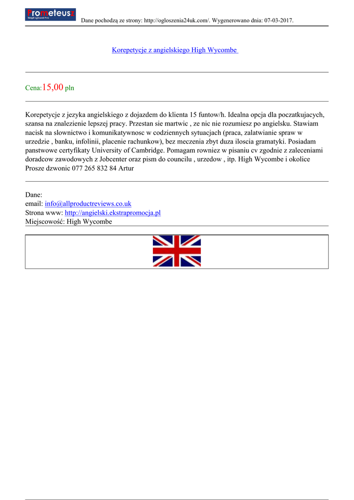 Dane pochodzą ze strony: http://ogloszenia24uk.com/. Wygenerowano dnia: 07-03-2017. Korepetycje z angielskiego High Wycombe Cena:15,00 pln Korepetycje z jezyka angielskiego z dojazdem do klienta 15 funtow/h. Idealna opcja dla poczatkujacych, szansa na znalezienie lepszej pracy. Przestan sie martwic , ze nic nie rozumiesz po angielsku. Stawiam nacisk na slownictwo i komunikatywnosc w codziennych sytuacjach (praca, zalatwianie spraw w urzedzie , banku, infolinii, placenie rachunkow), bez meczenia zbyt duza iloscia gramatyki. Posiadam panstwowe certyfikaty University of Cambridge. Pomagam rowniez w pisaniu cv zgodnie z zaleceniami doradcow zawodowych z Jobcenter oraz pism do councilu , urzedow , itp. High Wycombe i okolice Prosze dzwonic 077 265 832 84 Artur Dane: email: [email protected] Strona www: http://angielski.ekstrapromocja.pl Miejscowość: High Wycombe