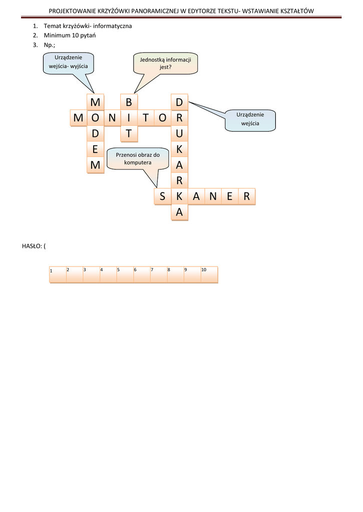 PROJEKTOWANIE KRZYŻÓWKI PANORAMICZNEJ W EDYTORZE TEKSTU- WSTAWIANIE KSZTAŁTÓW 1. Temat krzyżówki- informatyczna 2. Minimum 10 pytań 3. Np.; Urządzenie wejścia- wyjścia Jednostką informacji jest? M B M O N I T O D T E Przenosi obraz do komputera M D Urządzenie R wejścia U K A R S K A N E R A HASŁO: ( 1 2 3 4 5 6 7 8 9 10