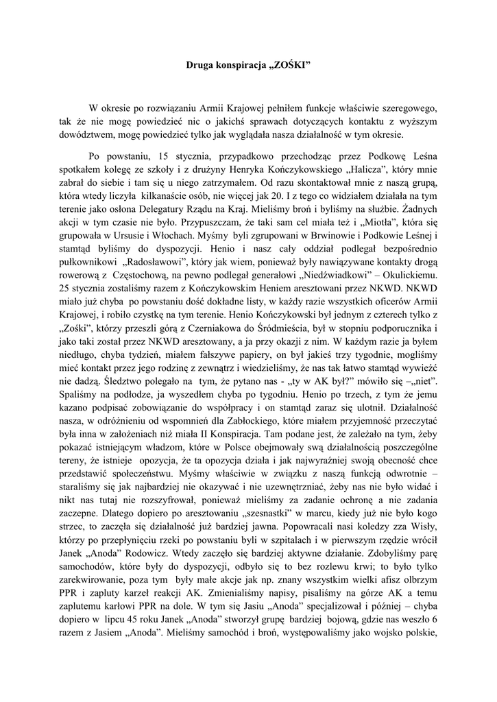 Druga konspiracja „ZOŚKI” W okresie po rozwiązaniu Armii Krajowej pełniłem funkcje właściwie szeregowego, tak że nie mogę powiedzieć nic o jakichś sprawach dotyczących kontaktu z wyższym dowództwem, mogę powiedzieć tylko jak wyglądała nasza działalność w tym okresie. Po powstaniu, 15 stycznia, przypadkowo przechodząc przez Podkowę Leśna spotkałem kolegę ze szkoły i z drużyny Henryka Kończykowskiego „Halicza”, który mnie zabrał do siebie i tam się u niego zatrzymałem. Od razu skontaktował mnie z naszą grupą, która wtedy liczyła kilkanaście osób, nie więcej jak 20. I z tego co widziałem działała na tym terenie jako osłona Delegatury Rządu na Kraj. Mieliśmy broń i byliśmy na służbie. Żadnych akcji w tym czasie nie było. Przypuszczam, że taki sam cel miała też i „Miotła”, która się grupowała w Ursusie i Włochach. Myśmy byli zgrupowani w Brwinowie i Podkowie Leśnej i stamtąd byliśmy do dyspozycji. Henio i nasz cały oddział podlegał bezpośrednio pułkownikowi „Radosławowi”, który jak wiem, ponieważ były nawiązywane kontakty drogą rowerową z Częstochową, na pewno podlegał generałowi „Niedźwiadkowi” – Okulickiemu. 25 stycznia zostaliśmy razem z Kończykowskim Heniem aresztowani przez NKWD. NKWD miało już chyba po powstaniu dość dokładne listy, w każdy razie wszystkich oficerów Armii Krajowej, i robiło czystkę na tym terenie. Henio Kończykowski był jednym z czterech tylko z „Zośki”, którzy przeszli górą z Czerniakowa do Śródmieścia, był w stopniu podporucznika i jako taki został przez NKWD aresztowany, a ja przy okazji z nim. W każdym razie ja byłem niedługo, chyba tydzień, miałem fałszywe papiery, on był jakieś trzy tygodnie, mogliśmy mieć kontakt przez jego rodzinę z zewnątrz i wiedzieliśmy, że nas tak łatwo stamtąd wywieźć nie dadzą. Śledztwo polegało na tym, że pytano nas - „ty w AK był?” mówiło się –„niet”. Spaliśmy na podłodze, ja wyszedłem chyba po tygodniu. Henio po trzech, z tym że jemu kazano podpisać zobowiązanie do współpracy i on stamtąd zaraz się ulotnił. Działalność nasza, w odróżnieniu od wspomnień dla Zabłockiego, które miałem przyjemność przeczytać była inna w założeniach niż miała II Konspiracja. Tam podane jest, że zależało na tym, żeby pokazać istniejącym władzom, które w Polsce obejmowały swą działalnością poszczególne tereny, że istnieje opozycja, że ta opozycja działa i jak najwyraźniej swoją obecność chce przedstawić społeczeństwu. Myśmy właściwie w związku z naszą funkcją odwrotnie – staraliśmy się jak najbardziej nie okazywać i nie uzewnętrzniać, żeby nas nie było widać i nikt nas tutaj nie rozszyfrował, ponieważ mieliśmy za zadanie ochronę a nie zadania zaczepne. Dlatego dopiero po aresztowaniu „szesnastki” w marcu, kiedy już nie było kogo strzec, to zaczęła się działalność już bardziej jawna. Popowracali nasi koledzy zza Wisły, którzy po przepłynięciu rzeki po powstaniu byli w szpitalach i w pierwszym rzędzie wrócił Janek „Anoda” Rodowicz. Wtedy zaczęło się bardziej aktywne działanie. Zdobyliśmy parę samochodów, które były do dyspozycji, odbyło się to bez rozlewu krwi; to było tylko zarekwirowanie, poza tym były małe akcje jak np. znany wszystkim wielki afisz olbrzym PPR i zapluty karzeł reakcji AK. Zmienialiśmy napisy, pisaliśmy na górze AK a temu zaplutemu karłowi PPR na dole. W tym się Jasiu „Anoda” specjalizował i później – chyba dopiero w lipcu 45 roku Janek „Anoda” stworzył grupę bardziej bojową, gdzie nas weszło 6 razem z Jasiem „Anoda”. Mieliśmy samochód i broń, występowaliśmy jako wojsko polskie, do tego stopnia, że osłona Rzymowskiego z nami tez rozmawiała i nie traktowała jako przeciwników. Tam też Jasio zadawał pytania co do Katynia Rzymowskiemu, na które otrzymał odpowiedź, że historia to nam pokaże. Dopiero z chwilą aresztowania w sierpniu pułkownika „Radosława” musieliśmy zacząć jakąś działalność i postanowiono żeby zdobyć jakiegoś zakładnika, żeby móc go ewentualnie wymienić. Przedtem musielibyśmy zdobyć dodatkowe samochody, musieliśmy zdobyć broń, chcieliśmy rozbroić paru ruskich, ale nie było, musieliśmy rozbroić polskich żołnierzy żeby mieć odpowiedni zapas. Była też w międzyczasie próba zlikwidowania Grosfelda jako szefa informacji w wojsku, ale do tego nie doszło. W związku z aresztowaniem „Radosława” próbowaliśmy złapać jako zakładnika ambasadora rosyjskiego Lebiediewa. Zostało zrobione rozpoznanie. Dowiedzieliśmy się, że jakiś wyższy funkcjonariusz z okolic Lasów Kabackich przyjeżdża codziennie do Warszawy i informacje wskazywały, że jest to właśnie Lebiediew. Koło Powsina mieliśmy zrobić zasadzkę, żeby tego właśnie naszego zakładnika złapać do „worka”; miał to wykonać najmniejszy z nas, czyli kolega Wit Sieradzki. Był do tego przygotowany a my mieliśmy go obstawiać. Jadąc na akcje przypadkowo wziąłem gazetę do ręki i przeczytałem, że Lebiediew poprzedniego dnia wyleciał do Moskwy. Zapytałem czy nasze rozpoznanie w dniu wczorajszym widziało jeszcze Lebiediewa na tej trasie. Powiedzieli, ze tak. No to się okazało – rzecz jasna – że to nie Lebiediew. Ale później uznaliśmy, że to wszystko jedno Lebiediew nie Lebiediew, jakaś szycha jest, więc łapać trzeba. Dopiero później się okazało, że był to generał Masłow, który tam pełnił jakąś funkcje w tych siłach armii, które okupowały ziemie wszystkich państw zajętych przez Związek Radziecki. Niestety tak jak akcja na Koppego – jak sobie mogę porównać w Krakowie – gdzie Koppe, miał drogę zastawioną ciężarówką i objechał bokiem, trawnikiem nad Wisłą i dopiero w pogoni zastrzelił adiutanta, ale już Koppemu nic nie zrobili. Tak i tutaj, nasza akcja na sz