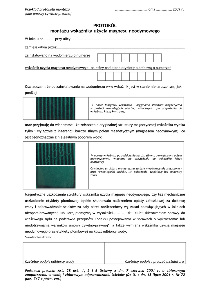 Przykład protokołu montażu jako umowy cywilno-prawnej ………………………………, dnia ……………… 2009 r. PROTOKÓŁ montażu wskaźnika użycia magnesu neodymowego W lokalu nr……………………… przy ulicy………………………………………………………………………………………………………………………………………………………………………………………………………………………………………… zamieszkałym przez……………………………………………………………………………………………………………………………………………………………………………………………………………………………………………………………………… zainstalowano na wodomierzu o numerze wskaźnik użycia magnesu neodymowego, na który naklejono etykietę plombową o numerze* Oświadczam, że po zainstalowaniu na wodomierzu w/w wskaźnik jest w stanie nienaruszonym, jak poniżej Å obraz fabryczny wskaźnika - oryginalna struktura magnetyczna w postaci równoległych pasków, widocznych po przyłożeniu do wskaźnika kliszy kontrolnej oraz przyjmuję do wiadomości, że zniszczenie oryginalnej struktury magnetycznej wskaźnika wynika tylko i wyłącznie z ingerencji bardzo silnym polem magnetycznym (magnesem neodymowym), co jest jednoznaczne z nielegalnym poborem wody: Å obrazy wskaźnika po zadziałaniu bardzo silnym, zewnętrznym polem magnetycznym, widoczne po przyłożeniu do wskaźnika kliszy kontrolnej Oryginalna struktura magnetyczna zostaje nieodwracalnie zniszczona – brak równoległości pasków, ich połączenie, częściowy lub całkowity zanik Magnetyczne uszkodzenie struktury wskaźnika użycia magnesu neodymowego, czy też mechaniczne uszkodzenie etykiety plombowej będzie skutkowało naliczeniem opłaty zaliczkowej za dostawę wody i odprowadzanie ścieków za cały okres rozliczeniowy wg zasad obowiązujących w lokalach nieopomiarowanych* lub karą pieniężną w wysokości.......... zł* i/lub* skierowaniem sprawy do właściwego sądu na podstawie przepisów Kodeksu postępowania w sprawach o wykroczenia* lub niedotrzymania warunków umowy cywilno-prawnej*, a także wymianą wskaźnika użycia magnesu neodymowego oraz etykiety plombowej na koszt odbiorcy wody. *niewłaściwe skreślić Czytelny podpis odbiorcy wody Czytelny podpis i pieczęć instalatora Podstawa prawna: Art. 28 ust. 1, 2 i 6 Ustawy z dn. 7 czerwca 2001 r. o zbiorowym zaopatrzeniu w wodę i zbiorowym odprowadzaniu ścieków (Dz.U. z dn. 13 lipca 2001 r. Nr 72 poz. 747 z późn. zm.)