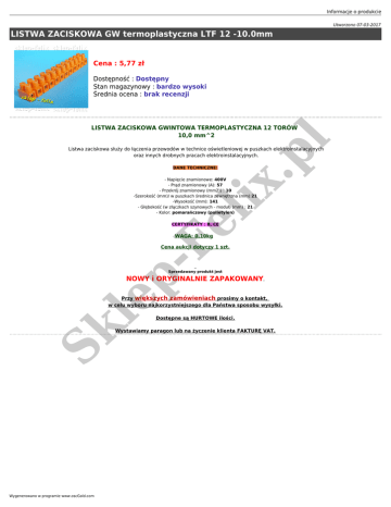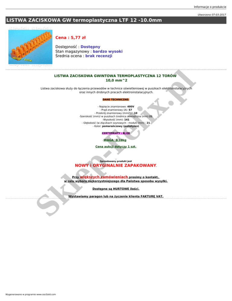 Informacje o produkcie Utworzono 07-03-2017 LISTWA ZACISKOWA GW termoplastyczna LTF 12 -10.0mm Cena : 5,77 zł Dostępność : Dostępny Stan magazynowy : bardzo wysoki Średnia ocena : brak recenzji .p l LISTWA ZACISKOWA GWINTOWA TERMOPLASTYCZNA 12 TORÓW 10,0 mm^2 Listwa zaciskowa służy do łączenia przewodów w technice oświetleniowej w puszkach elektroinstalacyjnych oraz innych drobnych pracach elektroinstalacyjnych. DANE TECHNICZNE: Fe lix - Napięcie znamionowe: 400V - Prąd znamionowy (A): 57 - Przekrój znamionowy (mm2)) : 10 -Szerokość (mm)/ w puszkach średnica zewnętrzna (mm):21 -Wysokość (mm): 141 - Głębokość (w złączkach szynowych - moduł) (mm) : 21 - Kolor: pomarańczowy (polietylen) CERTYFIKATY : B, CE WAGA: 0,10kg> Sk le p- Cena aukcji dotyczy 1 szt. Sprzedawany produkt jest NOWY i ORYGINALNIE ZAPAKOWANY. Przy większych zamówieniach prosimy o kontakt, w celu wyboru najkorzystniejszego dla Państwa sposobu wysyłki. Dostępne są HURTOWE ilości. Wystawiamy paragon lub na życzenie klienta FAKTURĘ VAT. Wygenerowano w programie www.oscGold.com