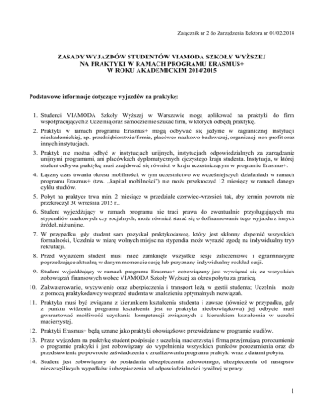 Załącznik nr 2 do Zarządzenia Rektora nr 01/02/2014 ZASADY WYJAZDÓW STUDENTÓW VIAMODA SZKOŁY WYŻSZEJ NA PRAKTYKI W RAMACH PROGRAMU ERASMUS+ W ROKU AKADEMICKIM 2014/2015 Podstawowe informacje dotyczące wyjazdów na praktykę: 1. Studenci VIAMODA Szkoły Wyższej w Warszawie mogą aplikować na praktyki do firm współpracujących z Uczelnią oraz samodzielnie szukać firm, w których odbędą praktykę. 2. Praktyki w ramach programu Erasmus+ mogą odbywać się jedynie w zagranicznej instytucji nieakademickiej, np. przedsiębiorstwie/firmie, placówce naukowo-badawczej, organizacji non-profit oraz innych instytucjach. 3. Praktyk nie można odbyć w instytucjach unijnych, instytucjach odpowiedzialnych za zarządzanie unijnymi programami, ani placówkach dyplomatycznych ojczystego kraju studenta. Instytucja, w której student odbywa praktykę musi znajdować się również w kraju uczestniczącym w programie Erasmus+. 4. Łączny czas trwania okresu mobilności, w tym uczestnictwo we wcześniejszych działaniach w ramach programu Erasmus+ (tzw. „kapitał mobilności”) nie może przekroczyć 12 miesięcy w ramach danego cyklu studiów. 5. Pobyt na praktyce trwa min. 2 miesiące w przedziale czerwiec-wrzesień tak, aby termin powrotu nie przekroczył 30 września 2015 r.. 6. Student wyjeżdżający w ramach programu nie traci prawa do ewentualnie przysługujących mu stypendiów naukowych czy socjalnych, może również starać się o dofinansowanie tego wyjazdu z innych źródeł, niż unijne. 7. W przypadku, gdy student sam pozyskał praktykodawcę, który jest skłonny dopełnić wszystkich formalności, Uczelnia w miarę wolnych miejsc na stypendia może wyrazić zgodę na indywidualny tryb rekrutacji. 8. Przed wyjazdem student musi mieć zamknięte wszystkie sesje zaliczeniowe i egzaminacyjne poprzedzające aktualną w danym momencie sesję lub przyznany indywidualny rozkład sesji. 9. Student wyjeżdżający w ramach programu Erasmus+ zobowiązany jest wywiązać się ze wszystkich zobowiązań finansowych wobec VIAMODA Szkoły Wyższej za okres pobytu za granicą. 10. Zakwaterowanie, wyżywienie oraz ubezpieczenia i transport leżą w gestii studenta; Uczelnia może z pomocą praktykodawcy wesprzeć studenta w znalezieniu optymalnych rozwiązań. 11. Praktyka musi być związana z kierunkiem kształcenia studenta i zawsze (również w przypadku, gdy z punktu widzenia programu kształcenia jest to praktyka nieobowiązkowa) jej odbycie musi gwarantować możliwość uzyskania kompetencji związanych z kierunkiem kształcenia w uczelni macierzystej. 12. Praktyki Erasmus+ będą uznane jako praktyki obowiązkowe przewidziane w programie studiów. 13. Przez wyjazdem na praktykę student podpisuje z uczelnią macierzystą i firmą przyjmującą porozumienie o programie praktyki i jest zobowiązany do wypełnienia wszystkich punktów porozumienia oraz do przedstawienia po powrocie zaświadczenia o zrealizowaniu programu praktyki wraz z datami pobytu. 14. Student jest zobowiązany do posiadania ubezpieczenia zdrowotnego, ubezpieczenia od następstw nieszczęśliwych wypadków i ubezpieczenia od odpowiedzialności cywilnej w pracy. 1 Wysokość stypendium 1. Stypendium Erasmus+, przyznawane studentowi wyjeżdżającemu na okres praktyki, jest z założenia dofinansowaniem kosztów związanych z podróżą i utrzymaniem za granicą. Kwota grantu nie jest wysoka i zależy od puli środków, jakie Uczelnia otrzymała od Narodowej Agencji Programu Erasmus na dany rok akademicki. Dokładne wysokości stawek stypendiów na rok 2014/15 ustala Polska Narodowa Agencja programu Erasmus+. 2. Stypendium jest zwolnione z podatku dochodowego od osób fizycznych. 3. Student podpisuje umowę z VIAMODA Szkołą Wyższą, otrzymuje przed wyjazdem stypendium w wysokości 90%. 4. Po złożeniu przez studenta raportu w wyjazdu (ankiety stypendysty) w systemie on-line (on-line EU survey), dostarczeniu zaświadczenia o zrealizowaniu programu praktyki wraz z dokładnymi datami pobytu ustalana i wypłacana jest ostateczna wysokość stypendium (z dokładnością do jednego dnia). Warunki uczestnictwa w praktykach Do wyjazdów na praktyki w ramach programu Erasmus+ uprawnieni są tylko i wyłącznie studenci VIAMODA Szkoły Wyższej (stacjonarni i niestacjonarni), którzy spełniają następujące warunki: w momencie wyjazdu są studentami co najmniej drugiego roku studiów, nie mogą przebywać (w trakcie stypendium) na urlopie dziekańskim. wykazują dobre wyniki w nauce, dobrą znajomość języka obcego, aktywnie uczestniczą w życiu szkoły oraz potrafią przekonać komisje kwalifikacyjną, iż to właśnie oni najlepiej spośród wszystkich kandydatów wykorzystają pobyt na stypendium. Kryteria kwalifikacji studentów 1. Kwalifikacji studentów dokonuje Komisja złożona z Prorektora ds. Dydaktycznych, Uczelnianego Koordynatora programu Erasmus oraz Sekretarza komisji. W procesie rekrutacji studenci mogą otrzymać maksymalnie 100 punktów. Do kwalifikacji na wyjazd na praktyki uprawnia uzyskanie co najmniej 70 punktów. 2. Podstawowe kryteria, które będą brane pod uwagę podczas kwalifikacji kandydatów: średnia ocen z poprzednich lat studiów (min. 4,0; w wyjątkowych przypadkach pod uwagę mogą być brane również osoby z niższą średnią); za średnią ocen kandydat może otrzymać do 50 punktów; dobra znajomość języka angielskiego, potwierdzona odpowiednimi certyfikatami językowymi. Studenci posiadający certyfikat potwierdzający znajomość języka obcego na poziomie C1 otrzymują 20 punktów. Kandydaci z certyfikatem językowym na poziomie B2 otrzymują 10 punktów; portfolio - kandydaci mogą otrzymać do 20 punktów; aktywność studencka - kandydaci mogą otrzymać do 10 punktów (działalność na rzecz Uczelni, uczestnictwo w programie „Erasmus Buddy”). 3. Po zakwalifikowaniu studenta na praktyki przez Uczelnianą Komisje, rozmowę przeprowadza reprezentant bezpośrednie