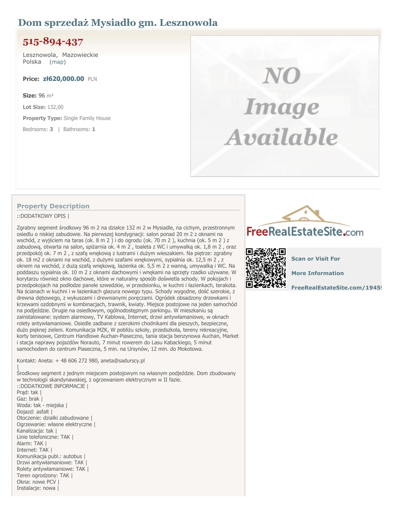Dom sprzedaż Mysiadło gm. Lesznowola 515-894-437 Lesznowola, Mazowieckie Polska (map) Price: zł620,000.00 PLN Size: 96 m² Lot Size: 132,00 Property Type: Single Family House Bedrooms: 3 | Bathrooms: 1 Property Description ::DODATKOWY OPIS | Zgrabny segment środkowy 96 m 2 na działce 132 m 2 w Mysiadle, na cichym, przestronnym osiedlu o niskiej zabudowie. Na pierwszej kondygnacji: salon ponad 20 m 2 z oknami na wschód, z wyjściem na taras (ok. 8 m 2 ) i do ogrodu (ok. 70 m 2 ), kuchnia (ok. 5 m 2 ) z zabudową, otwarta na salon, spiżarnia ok. 4 m 2 , toaleta z WC i umywalką ok. 1,8 m 2 , oraz przedpokój ok. 7 m 2 , z szafą wnękową z lustrami i dużym wieszakiem. Na piętrze: zgrabny ok. 18 m2 z oknami na wschód, z dużymi szafami wnękowymi, sypialnia ok. 12,5 m 2 , z oknem na wschód, z dużą szafą wnękową, łazienka ok. 5,5 m 2 z wanną, umywalką i WC. Na poddaszu sypialnia ok. 10 m 2 z oknami dachowymi i wnękami na sprzęty rzadko używane. W korytarzu również okno dachowe, które w naturalny sposób doświetla schody. W pokojach i przedpokojach na podłodze panele szwedzkie, w przedsionku, w kuchni i łazienkach, terakota. Na ścianach w kuchni i w łazienkach glazura nowego typu. Schody wygodne, dość szerokie, z drewna dębowego, z wykuszami i drewnianymi poręczami. Ogródek obsadzony drzewkami i krzewami ozdobnymi w kombinacjach, trawnik, kwiaty. Miejsce postojowe na jeden samochód na podjeździe. Drugie na osiedlowym, ogólnodostępnym parkingu. W mieszkaniu są zainstalowane: system alarmowy, TV Kablowa, Internet, drzwi antywłamaniowe, w oknach rolety antywłamaniowe. Osiedle zadbane z szerokimi chodnikami dla pieszych, bezpieczne, dużo pięknej zieleni. Komunikacja MZK, W pobliżu szkoły, przedszkola, tereny rekreacyjne, korty tenisowe, Centrum Handlowe Auchan-Piaseczno, tania stacja benzynowa Auchan, Market i stacja naprawy pojazdów Norauto, 7 minut rowerem do Lasu Kabackiego, 5 minut samochodem do centrum Piaseczna, 5 min. na Ursynów, 12 min. do Mokotowa. Kontakt: Aneta: + 48 606 272 980, [email protected] | Środkowy segment z jednym miejscem postojowym na własnym podjeździe. Dom zbudowany w technologii skandynawskiej, z ogrzewaniem elektrycznym w II fazie. ::DODATKOWE INFORMACJE | Prąd: tak | Gaz: brak | Woda: tak - miejska | Dojazd: asfalt | Otoczenie: działki zabudowane | Ogrzewanie: własne elektryczne | Kanalizacja: tak | Linie telefoniczne: TAK | Alarm: TAK | Internet: TAK | Komunikacja publ.: autobus | Drzwi antywłamaniowe: TAK | Rolety antywłamaniowe: TAK | Teren ogrodzony: TAK | Okna: nowe PCV | Instalacje: nowa | Scan or Visit For More Information FreeRealEstateSite.com/194596 Tarasy: taras | Powierzchnia ogródka [m2]: 70,00 | Zagosp. działki: zagospodarowana | Ukształtowanie działki: płaska | Kształt działki: prostokąt | Rodzaj domu: segment | Stan wybudowania: Pod klucz | Typ elewacji: klinkier | Podst. materiał budowlany: mieszany | Pokrycie dachu: papa | Powierzchnia użytkowa [m2]: 80,40 | Stan budynku: do zamieszkania | Podpiwniczenie: nie | Rok budowy: 2000 | Ilość pokoi: 4 | Ilość sypialni: 3 | Powierzchnia pokoi [m2]: 20; 18; 12; 10 | Podłogi pokoi: panele | Ściany pokoi: tynk ozdobny, zwykłe | Wystawa okien - pokoje : Wsch | Typ kuchni: aneks kuchenny - połączony z salonem | Rodzaj kuchni: umeblowana i wyposażona | Powierzchnia kuchni [m2]: 5 | Podłoga kuchni: terakota | Wystawa okien - kuchnia: Wsch | Typ łazienki: razem z WC | Ilość łazienek: 1 | Powierzchnia łazienki [m2]: 5,5 | Glazura łazienki: nowego typu | Podłoga łazienki: terakota | Wyposażenie łazienki: wanna | Ściany łazienki: glazura | Ilość WC: 1 | Powierzchnia WC: 1,8 | Glazura WC: nowego typu | Podłoga WC: terakota | Ściany WC: glazura | Ilość przedpokoi: 3 | Powierzchnia przedpokoi [m2]: 6,5; 5; 2 | Podłoga przedpokoi: panele | Ściany przedpokoi: zwykłe | ::LINK DO STRONY | http://sadurscy.pl/oferta.aspx?id=87090 ::KONTAKT DO AGENTA | Małgorzata Zębala | 515-894-437 | [email protected] ::DANE BIURA | Bracia Sadurscy Czarnowiejska | Czarnowiejska 51/5 | 30-049 Kraków | 12 630-90-45 | sadurscy.pl Pośrednik odpowiedzialny zawodowo za wykonanie umowy pośrednictwa: Darius Security: alarm ,break-prooven doors Year Built: 2000