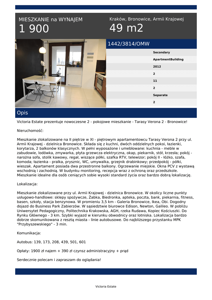 Kraków, Bronowice, Armii Krajowej MIESZKANIE na WYNAJEM 49 m2 1 900 1442/3814/OMW Secondary ApartmentBuilding 2012 2 11 2 Separate 2 Opis Victoria Estate prezentuje nowoczesne 2 - pokojowe mieszkanie - Tarasy Verona 2 - Bronowice! Nieruchomość: Mieszkanie zlokalizowane na II piętrze w XI - piętrowym apartamentowcu Tarasy Verona 2 przy ul. Armii Krajowej - dzielnica Bronowice. Składa się z kuchni, dwóch oddzielnych pokoi, łazienki, korytarza, 2 balkonów klasycznych. W pełni wyposażone i umeblowane: kuchnia - meble w zabudowie, lodówka, zmywarka, płyta grzewcza elektryczna, okap, piekarnik, stół, krzesła; pokój narożna sofa, stolik kawowy, regał, wiszące półki, szafka RTV, telewizor; pokój II - łóżko, szafa, komoda; łazienka - pralka, prysznic, WC, umywalka, grzejnik drabinkowy; przedpokój - półki, wieszak. Apartament posiada dwa przestronne balkony. Ogrzewanie miejskie. Okna PCV z wystawą wschodnią i zachodnią. W budynku monitoring, recepcja wraz z ochroną oraz przedszkole. Mieszkanie idealne dla osób ceniących sobie wysoki standard życia oraz bardzo dobrą lokalizację. Lokalizacja: Mieszkanie zlokalizowane przy ul. Armii Krajowej - dzielnica Bronowice. W okolicy liczne punkty usługowo-handlowe: sklepy spożywcze, Żabka, Biedronka, apteka, poczta, bank, piekarnia, fitness, basen, szkoły, stacja benzynowa. W promieniu 3,5 km - Galeria Bronowice, Ikea, Obi. Dogodny dojazd do Business Park Zabierzów. W sąsiedztwie biurowce Edison, Newton, Galileo. W pobliżu Uniwersytet Pedagogiczny, Politechnika Krakowska, AGH, rzeka Rudawa, Kopiec Kościuszki. Do Rynku Głównego - 3 km. Szybki wyjazd w kierunku obwodnicy oraz lotniska. Lokalizacja bardzo dobrze skomunikowana z resztą miasta - linie autobusowe. Do najbliższego przystanku MPK "Przybyszewskiego" - 3 min. Komunikacja: Autobus: 139, 173, 208, 439, 501, 601 Opłaty: 1900 zł najem + 390 zł czynsz administracyjny + prąd Serdecznie polecam i zapraszam do oglądania! Victoria Estate Paulina Zajdel tel. +48 789 453 049 email: [email protected] Victoria Estate Powered by TCPDF (www.tcpdf.org)