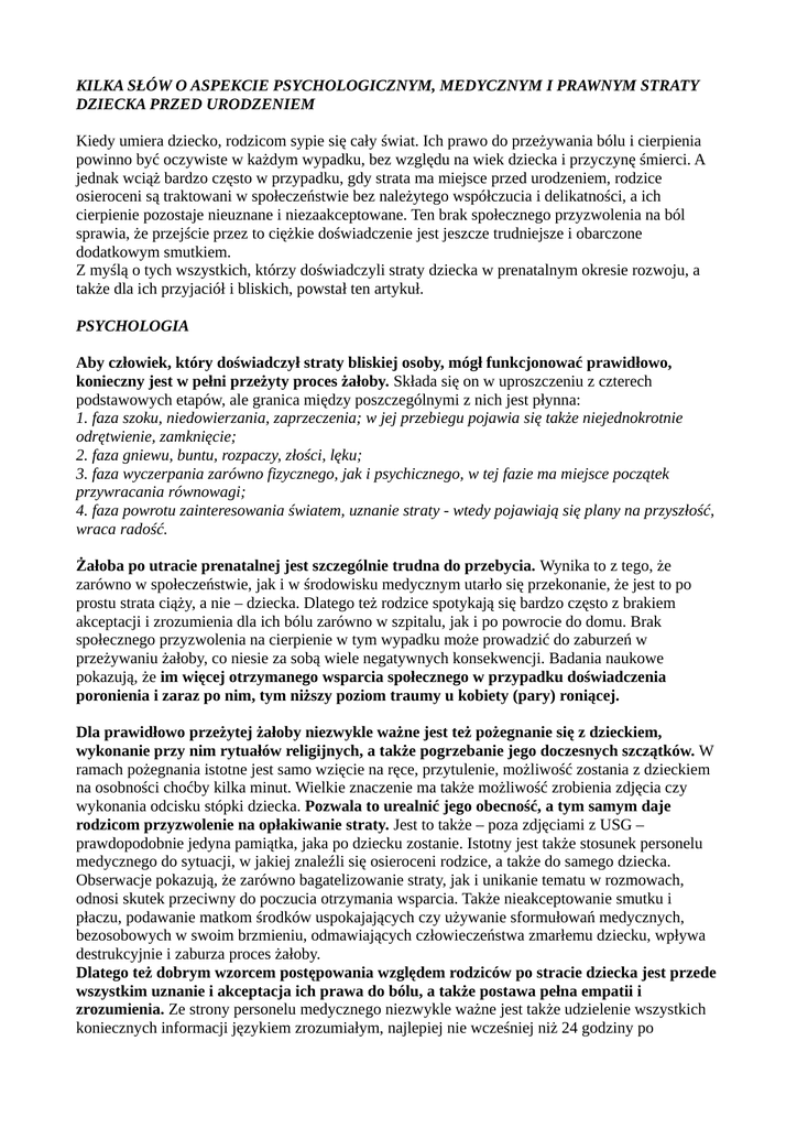 KILKA SŁÓW O ASPEKCIE PSYCHOLOGICZNYM, MEDYCZNYM I PRAWNYM STRATY DZIECKA PRZED URODZENIEM Kiedy umiera dziecko, rodzicom sypie się cały świat. Ich prawo do przeżywania bólu i cierpienia powinno być oczywiste w każdym wypadku, bez względu na wiek dziecka i przyczynę śmierci. A jednak wciąż bardzo często w przypadku, gdy strata ma miejsce przed urodzeniem, rodzice osieroceni są traktowani w społeczeństwie bez należytego współczucia i delikatności, a ich cierpienie pozostaje nieuznane i niezaakceptowane. Ten brak społecznego przyzwolenia na ból sprawia, że przejście przez to ciężkie doświadczenie jest jeszcze trudniejsze i obarczone dodatkowym smutkiem. Z myślą o tych wszystkich, którzy doświadczyli straty dziecka w prenatalnym okresie rozwoju, a także dla ich przyjaciół i bliskich, powstał ten artykuł. PSYCHOLOGIA Aby człowiek, który doświadczył straty bliskiej osoby, mógł funkcjonować prawidłowo, konieczny jest w pełni przeżyty proces żałoby. Składa się on w uproszczeniu z czterech podstawowych etapów, ale granica między poszczególnymi z nich jest płynna: 1. faza szoku, niedowierzania, zaprzeczenia; w jej przebiegu pojawia się także niejednokrotnie odrętwienie, zamknięcie; 2. faza gniewu, buntu, rozpaczy, złości, lęku; 3. faza wyczerpania zarówno fizycznego, jak i psychicznego, w tej fazie ma miejsce początek przywracania równowagi; 4. faza powrotu zainteresowania światem, uznanie straty - wtedy pojawiają się plany na przyszłość, wraca radość. Żałoba po utracie prenatalnej jest szczególnie trudna do przebycia. Wynika to z tego, że zarówno w społeczeństwie, jak i w środowisku medycznym utarło się przekonanie, że jest to po prostu strata ciąży, a nie – dziecka. Dlatego też rodzice spotykają się bardzo często z brakiem akceptacji i zrozumienia dla ich bólu zarówno w szpitalu, jak i po powrocie do domu. Brak społecznego przyzwolenia na cierpienie w tym wypadku może prowadzić do zaburzeń w przeżywaniu żałoby, co niesie za sobą wiele negatywnych konsekwencji. Badania naukowe pokazują, że im więcej otrzymanego wsparcia społecznego w przypadku doświadczenia poronienia i zaraz po nim, tym niższy poziom traumy u kobiety (pary) roniącej. Dla prawidłowo przeżytej żałoby niezwykle ważne jest też pożegnanie się z dzieckiem, wykonanie przy nim rytuałów religijnych, a także pogrzebanie jego doczesnych szczątków. W ramach pożegnania istotne jest samo wzięcie na ręce, przytulenie, możliwość zostania z dzieckiem na osobności choćby kilka minut. Wielkie znaczenie ma także możliwość zrobienia zdjęcia czy wykonania odcisku stópki dziecka. Pozwala to urealnić jego obecność, a tym samym daje rodzicom przyzwolenie na opłakiwanie straty. Jest to także – poza zdjęciami z USG – prawdopodobnie jedyna pamiątka, jaka po dziecku zostanie. Istotny jest także stosunek personelu medycznego do sytuacji, w jakiej znaleźli się osieroceni rodzice, a także do samego dziecka. Obserwacje pokazują, że zarówno bagatelizowanie straty, jak i unikanie tematu w rozmowach, odnosi skutek przeciwny do poczucia otrzymania wsparcia. Także nieakceptowanie smutku i płaczu, podawanie matkom środków uspokajających czy używanie sformułowań medycznych, bezosobowych w swoim brzmieniu, odmawiających człowieczeństwa zmarłemu dziecku, wpływa destrukcyjnie i zaburza proces żałoby. Dlatego też dobrym wzorcem postępowania względem rodziców po stracie dziecka jest przede wszystkim uznanie i akceptacja ich prawa do bólu, a także postawa pełna empatii i zrozumienia. Ze strony personelu medycznego niezwykle ważne jest także udzielenie wszystkich koniecznych informacji językiem zrozumiałym, najlepiej nie wcześniej niż 24 godziny po stwierdzeniu zgonu, dlatego, że przed upływem tego czasu mechanizmy obronne, wytworzone w momencie diagnozy, uniemożliwią usłyszenie ich i przyjęcie. Ze strony bliskich i przyjaciół bardzo istotne są słowa kierowane do osieroconych rodziców. Warto zapoznać się z poniższą „Listą życzeń osieroconych rodziców”. Lista życzeń osieroconych rodziców 1. Chciałabym, by moje dziecko nie umarło. Chciałabym je mieć z powrotem. 2. Chciałbym, byś się nie bał wymawiając imię mojego dziecka. Moje dziecko istniało i było dla mnie bardzo ważne. Potrzebuję usłyszeć, że było ono ważne także dla Ciebie. 3. Jeśli płaczę lub reaguję emocjonalnie, gdy mówisz o moim dziecku chciałabym, byś wiedział, że to nie dlatego, że mnie ranisz. Czuję wówczas, że pamiętasz; czuję twoją troskę! Śmierć mojego dziecka jest przyczyną moich łez. Rozmawiasz ze mną o moim dziecku, pozwoliłeś mi podzielić się smutkiem. Dziękuję Ci za to 4. Chciałbym, byś nie „zabijał” ponownie mego dziecka usuwając jego zdjęcia, rysunki, pamiątki ze swojego domu. 5. Bycie rodzicem w żałobie nie jest zaraźliwe, więc chciałbym byś mnie nie unikał. Potrzebuję Cię teraz bardziej niż kiedykolwiek. 6. Potrzebuje urozmaicenia, chcę usłyszeć co u Ciebie, lecz chcę, byś także słuchał mnie. Mogę być smutna. Mogę płakać, lecz chciałabym, byś pozwolił mi mówić o moim dziecku; to mój ulubiony temat. 7. Wiem, że często o mnie myślisz i się modlisz. Wiem, że śmierć mojego dziecka boli Cię także. Chciałabym o tym wiedzieć: powiedz mi to przez telefon, napisz list lub uściśnij mnie. 8. Chciałbym żebyś nie oczekiwał, że moja żałoba skończy się wraz z upływem sześciu miesięcy. Pierwsze miesiące są dla mnie szczególnie traumatyczne; chciałbym jednak być zrozumiał, że mój żal nie będzie mieć końca. Będę cierpiała z powodu śmierci mojego dziecka aż do ostatniego dnia mego życia. 9. Naprawdę staram się „zaleczyć”, chciałabym jednak byś zrozumiał, że nigdy nie będę w pełni wyleczona. Zawsze będę tęskniła za moim dzieckiem i będę pełna żalu, że już nie żyje.