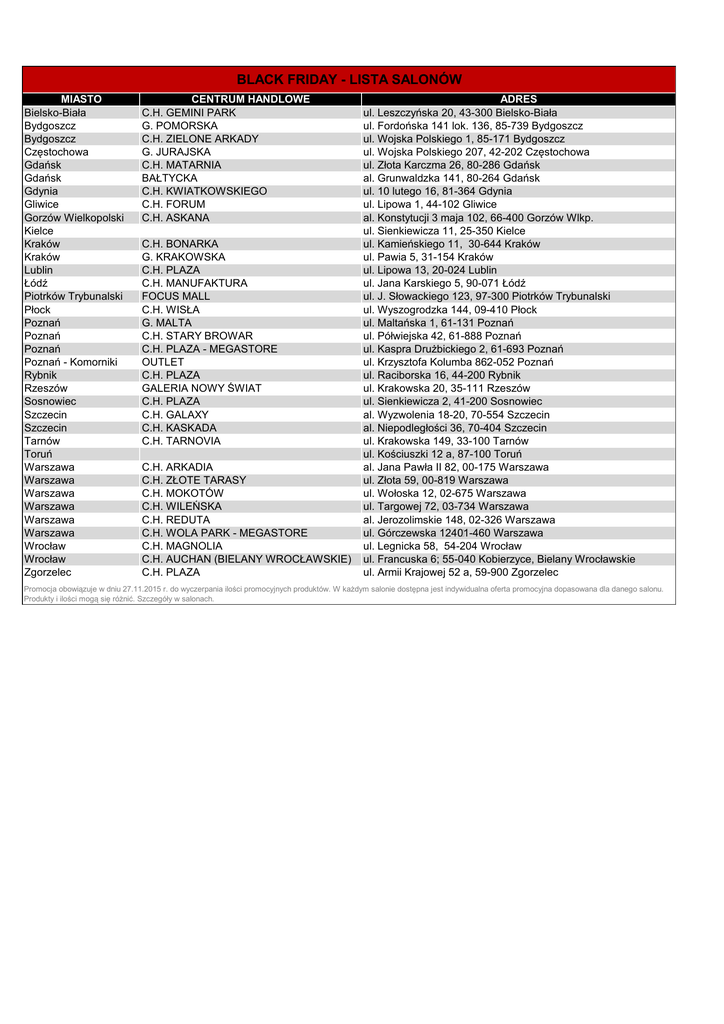 BLACK FRIDAY - LISTA SALONÓW MIASTO Bielsko-Biała Bydgoszcz Bydgoszcz Częstochowa Gdańsk Gdańsk Gdynia Gliwice Gorzów Wielkopolski Kielce Kraków Kraków Lublin Łódź Piotrków Trybunalski Płock Poznań Poznań Poznań Poznań - Komorniki Rybnik Rzeszów Sosnowiec Szczecin Szczecin Tarnów Toruń Warszawa Warszawa Warszawa Warszawa Warszawa Warszawa Wrocław Wrocław Zgorzelec CENTRUM HANDLOWE C.H. GEMINI PARK G. POMORSKA C.H. ZIELONE ARKADY G. JURAJSKA C.H. MATARNIA BAŁTYCKA C.H. KWIATKOWSKIEGO C.H. FORUM C.H. ASKANA C.H. BONARKA G. KRAKOWSKA C.H. PLAZA C.H. MANUFAKTURA FOCUS MALL C.H. WISŁA G. MALTA C.H. STARY BROWAR C.H. PLAZA - MEGASTORE OUTLET C.H. PLAZA GALERIA NOWY ŚWIAT C.H. PLAZA C.H. GALAXY C.H. KASKADA C.H. TARNOVIA C.H. ARKADIA C.H. ZŁOTE TARASY C.H. MOKOTÓW C.H. WILEŃSKA C.H. REDUTA C.H. WOLA PARK - MEGASTORE C.H. MAGNOLIA C.H. AUCHAN (BIELANY WROCŁAWSKIE) C.H. PLAZA ADRES ul. Leszczyńska 20, 43-300 Bielsko-Biała ul. Fordońska 141 lok. 136, 85-739 Bydgoszcz ul. Wojska Polskiego 1, 85-171 Bydgoszcz ul. Wojska Polskiego 207, 42-202 Częstochowa ul. Złota Karczma 26, 80-286 Gdańsk al. Grunwaldzka 141, 80-264 Gdańsk ul. 10 lutego 16, 81-364 Gdynia ul. Lipowa 1, 44-102 Gliwice al. Konstytucji 3 maja 102, 66-400 Gorzów Wlkp. ul. Sienkiewicza 11, 25-350 Kielce ul. Kamieńskiego 11, 30-644 Kraków ul. Pawia 5, 31-154 Kraków ul. Lipowa 13, 20-024 Lublin ul. Jana Karskiego 5, 90-071 Łódź ul. J. Słowackiego 123, 97-300 Piotrków Trybunalski ul. Wyszogrodzka 144, 09-410 Płock ul. Maltańska 1, 61-131 Poznań ul. Półwiejska 42, 61-888 Poznań ul. Kaspra Drużbickiego 2, 61-693 Poznań ul. Krzysztofa Kolumba 8 62-052 Poznań ul. Raciborska 16, 44-200 Rybnik ul. Krakowska 20, 35-111 Rzeszów ul. Sienkiewicza 2, 41-200 Sosnowiec al. Wyzwolenia 18-20, 70-554 Szczecin al. Niepodległości 36, 70-404 Szczecin ul. Krakowska 149, 33-100 Tarnów ul. Kościuszki 12 a, 87-100 Toruń al. Jana Pawła II 82, 00-175 Warszawa ul. Złota 59, 00-819 Warszawa ul. Wołoska 12, 02-675 Warszawa ul. Targowej 72, 03-734 Warszawa al. Jerozolimskie 148, 02-326 Warszawa ul. Górczewska 124 01-460 Warszawa ul. Legnicka 58, 54-204 Wrocław ul. Francuska 6; 55-040 Kobierzyce, Bielany Wrocławskie ul. Armii Krajowej 52 a, 59-900 Zgorzelec Promocja obowiązuje w dniu 27.11.2015 r. do wyczerpania ilości promocyjnych produktów. W każdym salonie dostępna jest indywidualna oferta promocyjna dopasowana dla danego salonu. Produkty i ilości mogą się różnić. Szczegóły w salonach.