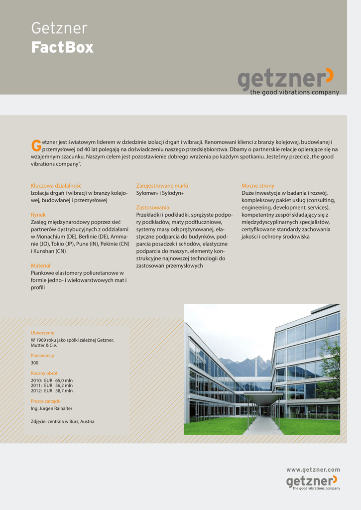 Getzner FactBox G etzner jest światowym liderem w dziedzinie izolacji drgań i wibracji. Renomowani klienci z branży kolejowej, budowlanej i przemysłowej od 40 lat polegają na doświadczeniu naszego przedsiębiorstwa. Dbamy o partnerskie relacje opierające się na wzajemnym szacunku. Naszym celem jest pozostawienie dobrego wrażenia po każdym spotkaniu. Jesteśmy przecież „the good vibrations company”. Kluczowa działalność Izolacja drgań i wibracji w branży kolejowej, budowlanej i przemysłowej Rynek Zasięg międzynarodowy poprzez sieć partnerów dystrybucyjnych z oddziałami w Monachium (DE), Berlinie (DE), Ammanie (JO), Tokio (JP), Pune (IN), Pekinie (CN) i Kunshan (CN) Materiał Piankowe elastomery poliuretanowe w formie jedno- i wielowarstwowych mat i proili Zarejestrowane marki Sylomer® i Sylodyn® Zastosowania Przekładki i podkładki, sprężyste podpory podkładów, maty podtłuczniowe, systemy masy odsprężynowanej, elastyczne podparcia do budynków, podparcia posadzek i schodów, elastyczne podparcia do maszyn, elementy konstrukcyjne najnowszej technologii do zastosowań przemysłowych Mocne strony Duże inwestycje w badania i rozwój, kompleksowy pakiet usług (consulting, engineering, development, services), kompetentny zespół składający się z międzydyscyplinarnych specjalistów, certyikowane standardy zachowania jakości i ochrony środowiska Utworzenie W 1969 roku jako spółki zależnej Getzner, Mutter & Cie. Pracownicy 300 Roczny obrót 2010: EUR 65,0 mln 2011: EUR 56,2 mln 2012: EUR 58,7 mln Prezes zarządu Ing. Jürgen Rainalter Zdjęcie: centrala w Bürs, Austria www.getzner.com Getzner FactBox etzner is the world’s leading specialist for the insulation and mitigation of vibrations. Top-name customers from the rail, construction and industrial sectors have trusted our company’s expertise for 40 years now, and we pride ourselves on close partnerships and mutual respect. Our objective is to leave every meeting on an upbeat note: after all, we’re „the good vibrations company“. G Core competency Insulation of vibrations in rail, construction engineering and industrial applications Market areas International presence, via a network of distribution partners and company ofices in Munich (DE), Berlin (DE), Amman (JO), Tokyo (JP), Pune (IN), Beijing (CN), Kunshan (CN) Registered trademarks Sylomer® and Sylodyn® Applications Rail pads and baseplate pads, sleeper pads, ballast mats, mass-spring systems, elastic building mounting, elastic mounting of loors and stairs, elastic mounting of machinery, hightech components for industrial applications Strengths Strong investment in R&D, full range of services (consulting, engineering, development, customer service), highly competent team of interdisciplinary experts, certiied quality and environmental standards Materials Foamed polyurethane elastomers in the form of multi-layer mats and formed components DB FB pl/en © Copyright by getzner Werkstoffe gmbH l 02-2013 Founded 1969 as a subsidiary of getzner, Mutter & Cie Employees 300 Annual turnover 2010: EuR 65.0 Mio. 201 1 : EuR 56.2 Mio. 201 2: EuR 58.7 Mio. Chief Executive Oficer Ing. Jürgen Rainalter Picture: Headquarters in Bürs, Austria www.getzner.com AuSTRIA — Bürs gERMANy — Berlin — Munich JORDAN — Amman JAPAN — Tokyo INDIA — Pune CHINA — Beijing