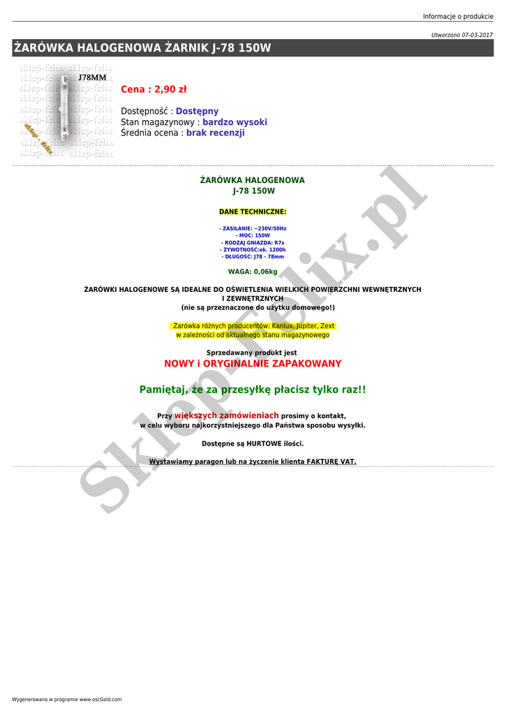 Informacje o produkcie Utworzono 07-03-2017 ŻARÓWKA HALOGENOWA ŻARNIK J-78 150W Cena : 2,90 zł Dostępność : Dostępny Stan magazynowy : bardzo wysoki Średnia ocena : brak recenzji DANE TECHNICZNE: Fe lix - ZASILANIE: ~230V/50Hz - MOC: 150W - RODZAJ GNIAZDA: R7s - ŻYWOTNOŚĆ:ok. 1200h - DŁUGOŚĆ: J78 - 78mm .p l ŻARÓWKA HALOGENOWA J-78 150W WAGA: 0,06kg ŻARÓWKI HALOGENOWE SĄ IDEALNE DO OŚWIETLENIA WIELKICH POWIERZCHNI WEWNĘTRZNYCH I ZEWNĘTRZNYCH (nie są przeznaczone do użytku domowego!) Żarówka różnych producentów: Kanlux, Jupiter, Zext w zależności od aktualnego stanu magazynowego Sprzedawany produkt jest Sk le p- NOWY i ORYGINALNIE ZAPAKOWANY Pamiętaj, że za przesyłkę płacisz tylko raz!! Przy większych zamówieniach prosimy o kontakt, w celu wyboru najkorzystniejszego dla Państwa sposobu wysyłki. Dostępne są HURTOWE ilości. Wystawiamy paragon lub na życzenie klienta FAKTURĘ VAT. Wygenerowano w programie www.oscGold.com