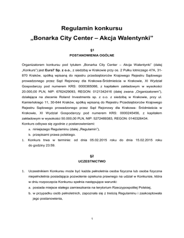 Regulamin konkursu „Bonarka City Center – Akcja Walentynki” §1 POSTANOWIENIA OGÓLNE Organizatorem konkursu pod tytułem „Bonarka City Center – Akcja Walentynki” (dalej „Konkurs”) jest Eura7 Sp. z o.o., z siedzibą w Krakowie przy os. 2 Pułku lotniczego 47A, 31870 Kraków, spółką wpisaną do rejestru przedsiębiorców Krajowego Rejestru Sądowego prowadzonego przez Sąd Rejonowy dla Krakowa-Śródmieścia w Krakowie, XI Wydział Gospodarczy pod numerem KRS: 0000365066, z kapitałem zakładowym w wysokości 20.000,00 PLN, NIP: 6762429093, REGON: 0121342416 (dalej zwana „Organizatorem”), działająca na zlecenie Roland Investments sp. z o.o. z siedzibą w Krakowie, przy ul. Kamieńskiego 11, 30-644 Kraków, spółką wpisaną do Rejestru Przedsiębiorców Krajowego Rejestru Sądowego prowadzonego przez Sąd Rejonowy dla Krakowa- Śródmieścia w Krakowie, XI Wydział Gospodarczy pod numerem KRS: 0000245456, z kapitałem zakładowym w wysokości 50.000,00 PLN, NIP: 5272489383, REGON: 0140326434. Konkurs odbywa się zgodnie z postanowieniami: a. niniejszego Regulaminu (dalej „Regulamin”), b. przepisami prawa polskiego. 1. Konkurs trwa w terminie: od dnia 05.02.2015 roku do dnia 15.02.2015 roku do godziny 23:59. §2 UCZESTNICTWO 1. Uczestnikiem Konkursu może być każda pełnoletnia osoba fizyczna lub osoba fizyczna niepełnoletnia posiadająca pozwolenie opiekuna prawnego na udział w Konkursie, która w dniu rozpoczęcia Konkursu spełnia następujące warunki: a. posiada miejsce stałego zamieszkania na terytorium Rzeczypospolitej Polskiej, b. w przypadku osób pełnoletnich, zapoznała się z treścią Regulaminu i zaakceptowała jego postanowienia, 1 c. w przypadku osób niepełnoletnich, z zasadami Konkursu zapoznał się opiekun prawny, d. w przypadku osób niepełnoletnich, posiada zgodę opiekuna prawnego na udział w Konkursie, e. zapoznała się z Regulaminem Konkursu. 2. Ponadto warunkami wzięcia udziału w Konkursie są: a. Prawidłowe dopisanie się i aktywowanie swojego adresu e-mail w newsletterze serwisu http://bonarkacitycenter.pl/walentynki. b. posiadanie aktywnego konta w portalu Facebook.com 3. W Konkursie nie mogą brać udziału pracownicy i przedstawiciele Organizatora, osoby obsługujące oraz inne podmioty zaangażowane w przeprowadzenie Konkursu, a także członkowie najbliższej rodziny wyżej wymienionych osób (w szczególności małżonkowie, dzieci, rodzice, rodzeństwo), zleceniodawca, fundator nagród. §3 ZASADY KONKURSU 1. Aby wziąć udział w Konkursie, uczestnik Konkursu musi dobrowolnie zapisać się i aktywować swoje konto w newsletterze Bonarka City Center poprzez serwis http://bonarkacitycenter.pl/walentynki lub za pomocą linka aktywującego przesłanego przez newsletter Bonarka City Center w wiadomości e-mail. 2. Zadaniem uczestnika Konkursu jest zamieszczenie na swoim profilu w portalu Facebook.com linku z kodem referencyjnym, otrzymanym za pomocą e-mail od newslettera Bonarka City Center. 3. Publikacja linku referencyjnego na profilu w portalu Facebook.com musi być dokonana za pomocą przycisku „Udostępnij na Facebooku” z otrzymanego e-maila newsletter Bonarka City Center, po uprzedniej aktywacji swojego konta w newsletterze. 4. Komisja Konkursowa ma prawo usuwać zgłoszenia, które zostały uznane przez Komisję jako dodane w sposób automatyczny. Równocześnie ma prawo do edycji rankingu. 5. Organizator ma możliwość wprowadzenia ograniczenia rejestracji do newslettera Konkursowego z jednego adresu IP. 6. Uczestnik zgłaszający się do Konkursu oświadcza, że przysługują mu prawa do korzystania ze zgłoszonego adresu e-mail oraz prawa do zgłoszenia tego adresu bez ograniczeń lub obciążeń na rzecz osób trzecich. 2 7. Wszystkie przesłane zgłoszenia mogą zostać zamieszczone w rankingu profilu Bonarka City Center w portalu Facebook.com oraz rankingu w serwisie http://bonarkacitycenter.pl/walentynki. 8. Uczestnicy Konkursu ponoszą pełną odpowiedzialność wobec Organizatora w przypadku zgłoszenia przez osoby trzecie roszczeń z tytułu naruszenia ich praw wskutek wykorzystania przez Organizatora danych o uczestniku Konkursu zgodnie z niniejszym Regulaminem. 9. W Konkursie przewidziano nagrody dla Zwycięzców Konkursu, którzy w rankingu zbiorą największą liczbę uzyskanych wpisów do newslettera Bonarka City Center, za pomocą udostepnienia w swoim profilu w portalu Facebook, otrzymanego kodu referencyjnego. W przypadku zebrania przez więcej niż jednego uczestnika Konkursu takiej samej liczby wpisów do newslettera Bonarka City Center na zasadach opisanych powyżej, o miejscu uczestnika Konkursu w rankingu decyduje czas uzyskania tej liczby wpisów, im krótszy czas, tym wyższe miejsce w rankingu. §4 NAGRODY 1. Nagrodami w Konkursie są 23 karty podarunkowe na zakupy bezgotówkowe w centrum handlowym Bonarka City Center, mieszczącym się w Krakowie, ul. Kamieńskiego 11, 30-644 Kraków, z odbiorem w punkcie informacji Bonarka City Center. Powyższy punkt informacji znajduje się naprzeciwko głównego wejścia do ww. centrum handlowego, pod zegarem. 2. Zwycięzca w Konkursie może otrzymać tylko jedną kartę podarunkową 3. Nagrody w Konkursie przydzielane są na podstawie miejsca zajętego w rankingu, przyjmując następujący podział: a) 1 karta podarunkowa o wartości 1000 złotych brutto, za zajęcie pierwszego miejsca w Konkursie; b) 2 karty podarunkowe o wartości 500 złotych brutto, za zajęcie drugiego i trzeciego miejsca w Konkursie; c) 10 kart podarunkowych o wartości 200 złotych brutto, za zajęcie od czwartego do trzynastego miejsca w Konkursie d) 10 kart podarunkowych o wartości 100 złotych brutto, za zajęcie od czternastego do dwudziestego trzeciego miejsca w Konkursie. 3 4. Do wartości każdej nagrody zostanie dodana dodatkowa nagroda pieniężna w wysokości odpowiadającej zryczałtowanemu podatkowi dochodowemu od osób fizycznych z tytułu wygranej w K