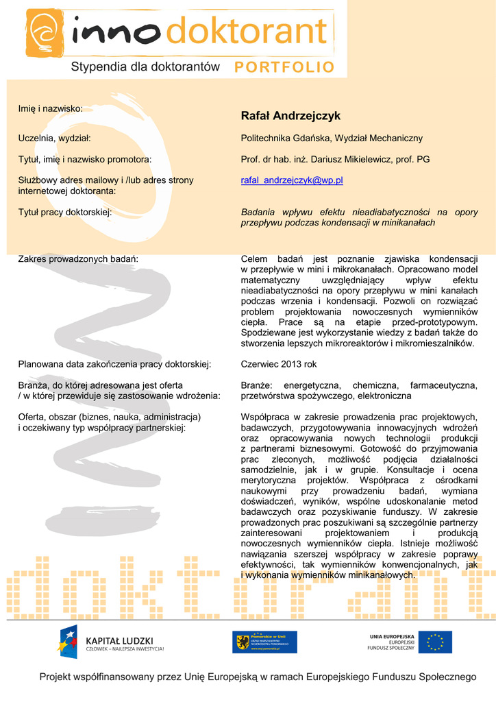 Imię i nazwisko: Rafał Andrzejczyk Uczelnia, wydział: Politechnika Gdańska, Wydział Mechaniczny Tytuł, imię i nazwisko promotora: Prof. dr hab. inŜ. Dariusz Mikielewicz, prof. PG SłuŜbowy adres mailowy i /lub adres strony internetowej doktoranta: [email protected] Tytuł pracy doktorskiej: Badania wpływu efektu nieadiabatyczności na opory przepływu podczas kondensacji w minikanałach Zakres prowadzonych badań: Celem badań jest poznanie zjawiska kondensacji w przepływie w mini i mikrokanałach. Opracowano model matematyczny uwzględniający wpływ efektu nieadiabatyczności na opory przepływu w mini kanałach podczas wrzenia i kondensacji. Pozwoli on rozwiązać problem projektowania nowoczesnych wymienników ciepła. Prace są na etapie przed-prototypowym. Spodziewane jest wykorzystanie wiedzy z badań takŜe do stworzenia lepszych mikroreaktorów i mikromieszalników. Planowana data zakończenia pracy doktorskiej: Czerwiec 2013 rok BranŜa, do której adresowana jest oferta / w której przewiduje się zastosowanie wdroŜenia: BranŜe: energetyczna, chemiczna, farmaceutyczna, przetwórstwa spoŜywczego, elektroniczna Oferta, obszar (biznes, nauka, administracja) i oczekiwany typ współpracy partnerskiej: Współpraca w zakresie prowadzenia prac projektowych, badawczych, przygotowywania innowacyjnych wdroŜeń oraz opracowywania nowych technologii produkcji z partnerami biznesowymi. Gotowość do przyjmowania prac zleconych, moŜliwość podjęcia działalności samodzielnie, jak i w grupie. Konsultacje i ocena merytoryczna projektów. Współpraca z ośrodkami naukowymi przy prowadzeniu badań, wymiana doświadczeń, wyników, wspólne udoskonalanie metod badawczych oraz pozyskiwanie funduszy. W zakresie prowadzonych prac poszukiwani są szczególnie partnerzy zainteresowani projektowaniem i produkcją nowoczesnych wymienników ciepła. Istnieje moŜliwość nawiązania szerszej współpracy w zakresie poprawy efektywności, tak wymienników konwencjonalnych, jak i wykonania wymienników minikanałowych.