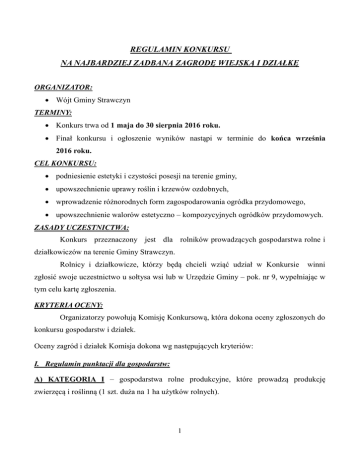 REGULAMIN KONKURSU NA NAJBARDZIEJ ZADBANĄ ZAGRODĘ WIEJSKĄ I DZIAŁKĘ ORGANIZATOR: Wójt Gminy Strawczyn TERMINY: Konkurs trwa od 1 maja do 30 sierpnia 2016 roku. Finał konkursu i ogłoszenie wyników nastąpi w terminie do końca września 2016 roku. CEL KONKURSU: podniesienie estetyki i czystości posesji na terenie gminy, upowszechnienie uprawy roślin i krzewów ozdobnych, wprowadzenie różnorodnych form zagospodarowania ogródka przydomowego, upowszechnienie walorów estetyczno – kompozycyjnych ogródków przydomowych. ZASADY UCZESTNICTWA: Konkurs przeznaczony jest dla rolników prowadzących gospodarstwa rolne i działkowiczów na terenie Gminy Strawczyn. Rolnicy i działkowicze, którzy będą chcieli wziąć udział w Konkursie winni zgłosić swoje uczestnictwo u sołtysa wsi lub w Urzędzie Gminy – pok. nr 9, wypełniając w tym celu kartę zgłoszenia. KRYTERIA OCENY: Organizatorzy powołują Komisję Konkursową, która dokona oceny zgłoszonych do konkursu gospodarstw i działek. Oceny zagród i działek Komisja dokona wg następujących kryteriów: I. Regulamin punktacji dla gospodarstw: A) KATEGORIA I – gospodarstwa rolne produkcyjne, które prowadzą produkcję zwierzęcą i roślinną (1 szt. duża na 1 ha użytków rolnych). 1 1. Zabudowa, zagospodarowanie, wyraz architektoniczny obiektów i ich związek z tradycjami i kulturą regionu oraz wzajemne funkcjonalne powiązanie obiektów zagrody wiejskiej. - 1 – 10 pkt 2. Stan techniczny budynków i estetyka budynków. - 1 – 10 pkt 3. Estetyczne zagospodarowanie zagrody: - 1 – 20 pkt a) część gospodarcza, b) podwórze, c) utrzymanie sprzętu rolniczego, d) ogrodzenie, e) część wypoczynkowo – ozdobna, zadrzewienie. - 1 – 20 pkt 4. Obiekty sanitarne: a) szamba, b) śmietniki, c) kompostowniki, d) zbiorniki na gnojowicę, e) składowanie obornika. 5. Ogrzewanie ekologiczne budynku - 1 – 5 pkt 6. Wykorzystanie odnawialnych źródeł energii: - 1 – 5 pkt - kolektory słoneczne, - panele fotowoltaiczne, - pompy ciepła MAKSYMALNA PUNKTACJA - 70 pkt B) KATEGORIA II – gospodarstwa rolne nieprodukcyjne, które w ogóle nie prowadzą produkcji zwierzęcej i roślinnej lub prowadzą produkcję zwierzęcą poniżej 1 szt. dużej na 1 ha użytków rolnych. 1. Zabudowa, zagospodarowanie, wyraz architektoniczny obiektów i ich związek z tradycjami i kulturą regionu oraz wzajemne funkcjonalne powiązanie obiektów zagrody wiejskiej. - 1 – 10 pkt 2 2. Stan techniczny budynków i estetyka budynków. - 1 – 10 pkt 3. Estetyczne zagospodarowanie zagrody: - 1 – 15 pkt a) część gospodarcza, b) podwórze, c) utrzymanie sprzętu rolniczego, d) ogrodzenie, e) część wypoczynkowo – ozdobna, zadrzewienie. - 1 – 20 pkt 4. Obiekty sanitarne: a) szamba, b) śmietniki, c) kompostowniki, d)zbiorniki na gnojowicę, e) składowanie obornika. 5. Ogrzewanie ekologiczne budynku - 1 – 5 pkt 6. Wykorzystanie odnawialnych źródeł energii: - 1 – 5 pkt - kolektory słoneczne, - panele fotowoltaiczne, - pompy ciepła MAKSYMALNA PUNKTACJA - 65 pkt C) KATEGORIA III – działkowicze 1. Architektura, stan techniczny i estetyka budynków. - 1 – 20 pkt 2. Estetyczne zagospodarowanie działki – podwórko, ogrodzenie - 1 – 10 pkt 3. Część wypoczynkowo – ozdobna: - 1 – 10 pkt a) ogródek ozdobny b) zadrzewienie - 1 – 20 pkt 4. Obiekty sanitarne: a) szambo, b) śmietnik, 3 c) kompostownik, 5. Ogrzewanie ekologiczne budynku - 1 – 5 pkt 6. Wykorzystanie odnawialnych źródeł energii: - 1 – 5 pkt - kolektory słoneczne, - panele fotowoltaiczne, - pompy ciepła MAKSYMALNA PUNKTACJA - 70 pkt II. Nagrody dla gospodarstw: KATEGORIA I – gospodarstwa rolne produkcyjne ・ za I miejsce nagroda o wartości ・ za II miejsce nagroda o wartości ・ za III miejsce nagroda o wartości ・ trzy wyróżnienia - 550 zł - 400 zł - 300 zł - 150 zł KATEGORIA II – gospodarstwa rolne nieprodukcyjne ・ za I miejsce nagroda o wartości ・ za II miejsce nagroda o wartości ・ za III miejsce nagroda o wartości - 400 zł - 300 zł - 200 zł KATEGORIA III – działkowicze ・ za I miejsce nagroda o wartości ・ za II miejsce nagroda o wartości ・ za III miejsce nagroda o wartości - 400 zł - 300 zł - 200 zł Dla uczestników Konkursu, którzy nie zajmą nagrodzonego miejsca zakupione zostaną nagrody rzeczowe. 4