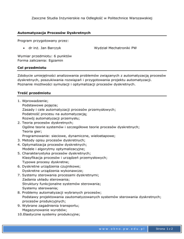 Zaoczne Studia Inżynierskie na Odległość w Politechnice Warszawskiej Automatyzacja Procesów Dyskretnych Program przygotowany przez: dr inż. Jan Barczyk Wydział Mechatroniki PW Wymiar przedmiotu: 6 punktów Forma zaliczenia: Egzamin Cel przedmiotu Zdobycie umiejętności analizowania problemów związanych z automatyzacją procesów dyskretnych, poszukiwania rozwiązań i przygotowania projektu automatyzacji. Poznanie możliwości symulacji i optymalizacji procesów dyskretnych. Treść przedmiotu 1. Wprowadzenie; Podstawowe pojęcia; Zasady i cele automatyzacji procesów przemysłowych; Podatność procesu na automatyzacją; Rozwój automatyzacji przemysłu; 2. Teoria procesów dyskretnych; Ogólne teorie systemów i szczegółowe teorie procesów dyskretnych; Teoria gier; Programowanie: sieciowe, dynamiczne, wieloetapowe; 3. Metody opisu procesów dyskretnych; 4. Optymalizacja procesów dyskretnych; Modele i algorytmy optymalizacyjne; 5. Charakterystyka procesów dyskretnych; Klasyfikacja procesów i urządzeń przemysłowych; Typowe procesy dyskretne; 6. Dyskretne urządzenia czujnikowe; Dyskretne urządzenia wykonawcze; 7. Systemy sterowania procesami dyskretnymi; Zadania układu sterowania; Struktury funkcjonalne systemów sterowania; Systemy sterowania; 8. Problemy automatyzacji wybranych procesów; Podstawy projektowania zautomatyzowanych systemów sterowania dyskretnych; procesów produkcyjnych; 9. Wybrane zagadnienia transportu; Magazynowanie wyrobów; 10.Elastyczne systemy produkcyjne; www.okno.pw.edu.pl Strona 1 z 2 11.Wybrane zagadnienia montażu. Podręcznik zilustrowany jest licznymi przykładami, zawiera interaktywne testy sprawdzające zrozumienie materiału. Bibliografia: J. Barczyk: Automatyzacja procesów dyskretnych. Oficyna Wydawnicza Politechniki Warszawskiej. Warszawa 2003. www.okno.pw.edu.pl Strona 2 z 2