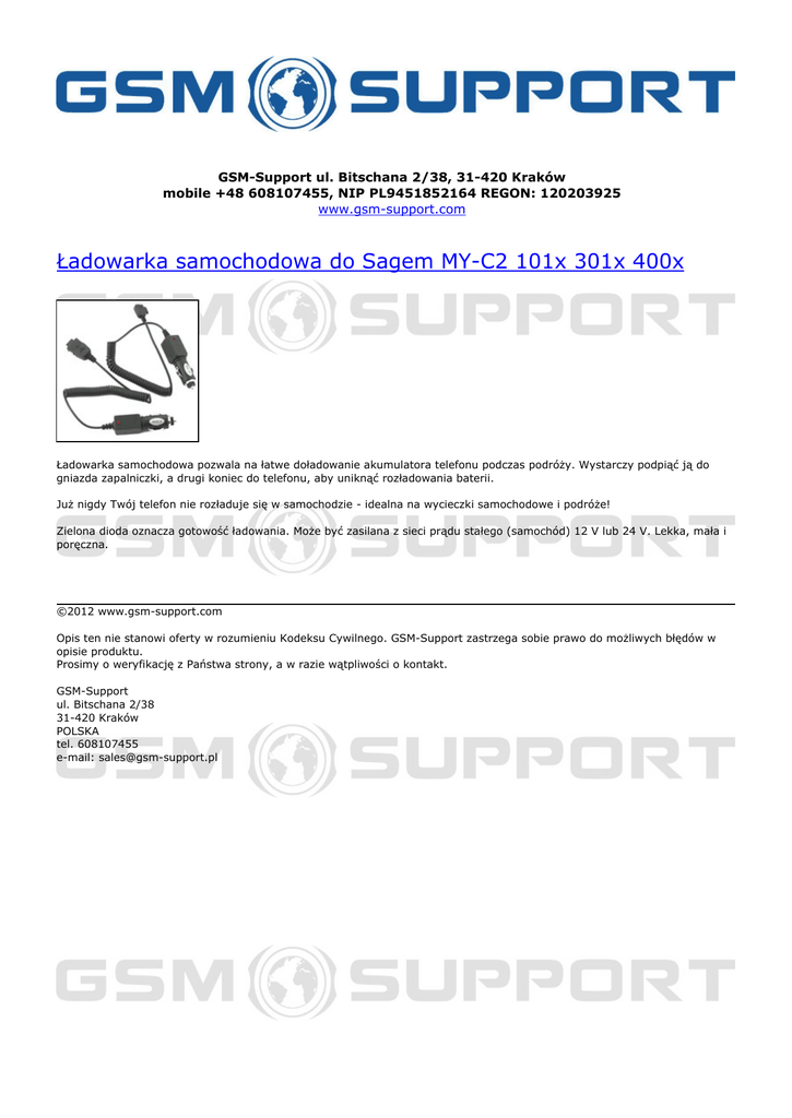 GSM-Support ul. Bitschana 2/38, 31-420 Kraków mobile +48 608107455, NIP PL9451852164 REGON: 120203925 www.gsm-support.com Ładowarka samochodowa do Sagem MY-C2 101x 301x 400x Ładowarka samochodowa pozwala na łatwe doładowanie akumulatora telefonu podczas podróży. Wystarczy podpiąć ją do gniazda zapalniczki, a drugi koniec do telefonu, aby uniknąć rozładowania baterii. Już nigdy Twój telefon nie rozładuje się w samochodzie - idealna na wycieczki samochodowe i podróże! Zielona dioda oznacza gotowość ładowania. Może być zasilana z sieci prądu stałego (samochód) 12 V lub 24 V. Lekka, mała i poręczna. ©2012 www.gsm-support.com Opis ten nie stanowi oferty w rozumieniu Kodeksu Cywilnego. GSM-Support zastrzega sobie prawo do możliwych błędów w opisie produktu. Prosimy o weryfikację z Państwa strony, a w razie wątpliwości o kontakt. GSM-Support ul. Bitschana 2/38 31-420 Kraków POLSKA tel. 608107455 e-mail: [email protected] Powered by TCPDF (www.tcpdf.org)