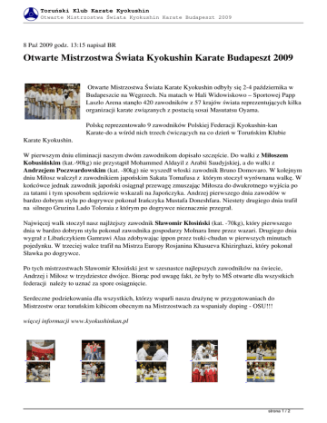 Toruński Klub Karate Kyokushin Otwarte Mistrzostwa Świata Kyokushin Karate Budapeszt 2009 8 Paź 2009 godz. 13:15 napisał BR Otwarte Mistrzostwa Świata Kyokushin Karate Budapeszt 2009 Otwarte Mistrzostwa Świata Karate Kyokushin odbyły się 2-4 października w Budapeszcie na Węgrzech. Na matach w Hali Widowiskowo – Sportowej Papp Laszlo Arena stanęło 420 zawodników z 57 krajów świata reprezentujących kilka organizacji karate związanych z postacią sosai Masutatsu Oyama. Polskę reprezentowało 9 zawodników Polskiej Federacji Kyokushin-kan Karate-do a wśród nich trzech ćwiczących na co dzień w Toruńskim Klubie Karate Kyokushin. W pierwszym dniu eliminacji naszym dwóm zawodnikom dopisało szczęście. Do walki z Miłoszem Kobusińskim (kat.-90kg) nie przystąpił Mohammed Aldayil z Arabii Saudyjskiej, a do walki z Andrzejem Poczwardowskim (kat. -80kg) nie wyszedł włoski zawodnik Bruno Domovaro. W kolejnym dniu Miłosz walczył z zawodnikiem japońskim Sakata Tomafusa z którym stoczył wyrównana walkę. W końcówce jednak zawodnik japoński osiągnął przewagę zmuszając Miłosza do dwukrotnego wyjścia po za tatami i tym sposobem sędziowie wskazali na Japończyka. Andrzej pierwszego dnia zawodów w bardzo dobrym stylu po dogrywce pokonał Irańczyka Mustafa Doneshfara. Niestety drugiego dnia trafił na silnego Gruzina Lado Toloraia z którym po dogrywce nieznacznie przegrał. Najwięcej walk stoczył nasz najlżejszy zawodnik Sławomir Kłosiński (kat. -70kg), który pierwszego dnia w bardzo dobrym stylu pokonał zawodnika gospodarzy Molnara Imre przez wazari. Drugiego dnia wygrał z Libańczykiem Gamrawi Alaa zdobywając ippon przez tsuki-chudan w pierwszych minutach pojedynku. W trzeciej walce trafił na Mistrza Europy Rosjanina Khasueva Khizirghazi, który pokonał Sławka po dogrywce. Po tych mistrzostwach Sławomir Kłosiński jest w szesnastce najlepszych zawodników na świecie, Andrzej i Miłosz w trzydziestce dwójce. Biorąc pod uwagę fakt, że były to MŚ otwarte dla wszystkich federacji należy to uznać za spore osiągnięcie. Serdeczne podziekowania dla wszystkich, którzy wsparli nasza drużynę w przygotowaniach do Mistrzostw oraz toruńskim kibicom obecnym na Mistrzostwach za wspaniały doping - OSU!!! więcej informacji www.kyokushinkan.pl strona 1 / 2 Toruński Klub Karate Kyokushin Otwarte Mistrzostwa Świata Kyokushin Karate Budapeszt 2009 strona 2 / 2