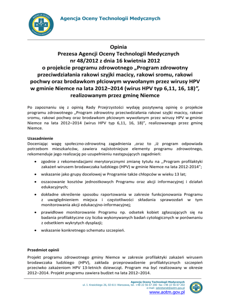 Agencja Oceny Technologii Medycznych Opinia Prezesa Agencji Oceny Technologii Medycznych nr 48/2012 z dnia 16 kwietnia 2012 o projekcie programu zdrowotnego „Program zdrowotny przeciwdziałania rakowi szyjki macicy, rakowi sromu, rakowi pochwy oraz brodawkom płciowym wywołanym przez wirusy HPV w gminie Niemce na lata 2012–2014 (wirus HPV typ 6,11, 16, 18)”, realizowanym przez gminę Niemce Po zapoznaniu się z opinią Rady Przejrzystości wydaję pozytywną opinię o projekcie programu zdrowotnego „Program zdrowotny przeciwdziałania rakowi szyjki macicy, rakowi sromu, rakowi pochwy oraz brodawkom płciowym wywołanym przez wirusy HPV w gminie Niemce na lata 2012–2014 (wirus HPV typ 6,11, 16, 18)”, realizowanego przez gminę Niemce. Uzasadnienie Doceniając wagę społeczno‐zdrowotną zagadnienia ,oraz to ,iż program odpowiada potrzebom mieszkańców, zawiera najistotniejsze elementy programu zdrowotnego, rekomenduje jego realizację po uzupełnieniu następujących zagadnień: zgodnie z rekomendacjami merytorycznymi zmianę tytułu na ,,Program profilaktyki zakażeń wirusem brodawczaka ludzkiego (HPV) w gminie Niemce na lata 2012‐2014”; wskazanie jako grupy docelowej w Programie także chłopców w wieku 13 lat; oszacowanie kosztów jednostkowych Programu oraz akcji informacyjnej i działań edukacyjnych; dokładne określenie sposobu raportowania w zakresie funkcjonowania Programu z uwzględnieniem miejsca i częstotliwości składania sprawozdań w tym monitorowania akcji edukacyjno‐informacyjnej; prawidłowe monitorowanie Programu np. odsetek kobiet zgłaszających się na badania profilaktyczne czy liczba wykonywanych badań cytologicznych w porównaniu z odsetkiem wykrytych dysplazji; wskazanie konkretnego schematu szczepień. Przedmiot opinii Projekt programu zdrowotnego gminy Niemce w zakresie profilaktyki zakażeń wirusem brodawczaka ludzkiego (HPV), zakłada przeprowadzenie profilaktycznych szczepień przeciwko zakażeniom HPV 13‐letnich dziewcząt. Program ma być realizowany w okresie 2012–2014. Projekt programu zawiera budżet na lata 2012–2014. Agencja Oceny Technologii Medycznych ul. I. Krasickiego 26, 02-611 Warszawa, tel. +48 22 56 67 200 fax +48 22 56 67 202 e-mail: [email protected] www.aotm.gov.pl Opinia Prezesa AOTM nr 48/2012 z dnia 16 kwietnia 2012 r. Problem zdrowotny Oceniany program odnosi się do konkretnego, dobrze zdefiniowanego problemu zdrowotnego. W etiologii raka szyjki macicy najważniejszą rolę odgrywa zakażenie wirusem brodawczaka ludzkiego (HPV, human papilloma virus). Obok zakażenia HPV, do czynników ryzyka zachorowania na raka szyjki macicy należą m. in. wczesne rozpoczęcie życia płciowego (przed 18 rokiem życia), duża liczba partnerów seksualnych, partnerzy „wysokiego ryzyka”, zakażenie HIV lub inne upośledzające system immunologiczny, palenie tytoniu, niski status ekonomiczny oraz liczne ciąże i porody. Około 70% przypadków raka szyjki macicy jest związanych z zakażeniem HPV typem 16 i 18. Zakażenie HPV jest najczęściej przemijające, jednak zakażenie przetrwałe typem dużego ryzyka onkogennego wiąże się ściśle z rozwojem zmian CIN, VIN, VaIN a także raka sromu, prącia i odbytu. Około 90% kłykcin narządów płciowych jest wywoływanych przez typ 6 lub 11 HPV. Liczba nowych zakażeń maleje wraz z wiekiem, ale ryzyko przejścia zakażenia w formę przetrwałą wzrasta wraz z wiekiem osoby zakażonej. Badanie cytologiczne pozwala na wykrycie zmian w obrębie szyjki macicy, zanim nabiorą one charakteru nowotworowego; rak szyjki macicy jest jednym z nielicznych nowotworów, w przypadku którego uzasadnione jest prowadzenie badań przesiewowych (skriningów), ponieważ szyjka macicy jest łatwo dostępna do badania, stany przedrakowe są dobrze opisane i łatwo wykrywalne, stany przedrakowe można wyleczyć. Alternatywne świadczenia W Polsce realizowany jest Populacyjny Program Profilaktyki Raka Szyjki Macicy, oparty o skrining cytologiczny. Populacyjny Program realizowany jest w oparciu o Ustawę z dnia 1 lipca 2005 roku o ustanowieniu programu wieloletniego "Narodowy program zwalczania chorób nowotworowych" (Dz.U.05.143.1200) oraz o Uchwałę Nr 24/2011 Rady Ministrów z dnia 1 marca 2011 r. w sprawie harmonogramu zadań wykonywanych w ramach programu wieloletniego "Narodowy program zwalczania chorób nowotworowych" w roku 2011 oraz kierunków realizacji zadań tego programu na lata 2012 i 2013. Programem profilaktyki objęte zostały Polki między 25 a 59 rokiem życia, które w ciągu 3 ostatnich lat nie miały wykonanego wymazu cytologicznego w ramach ubezpieczenia w Narodowym Funduszu Zdrowia. Wnioski z oceny przeprowadzonej przez Agencję 1) Wnioski z oceny problemu zdrowotnego Przeciwdziałanie chorobom nowotworowym, w tym nowotworom szyjki macicy, mieści się w obszarze działań celu 8. przyjętej w 1998 r. przez WHO strategii „Zdrowie dla Wszystkich w XXI Wieku”, dotyczącego redukcji chorób niezakaźnych, zgodnie z którym do roku 2020 powinna zostać maksymalnie ograniczona chorobowość, niepełnosprawność i przedwczesna umieralność z powodu ważniejszych chorób przewlekłych. Edukacja zdrowotna jest niezbędnym elementem działań profilaktycznych. Obniżenie wieku inicjacji seksualnej i liberalizacja kontaktów erotycznych stwarzają potrzebę intensyfikowania edukacji na temat higieny życia płciowego wśród młodzieży, szczególnie że jest to obszar pomijany najczęściej w edukacji rodzicielskiej. Z punktu widzenia profilaktyki raka szyjki macicy niezbędne są oddziaływania mające na celu wzrost świadomości dotyczącej czynników ryzyka i odpowiedzialności młodych ludzi za własne zdrowie i życie. Wszystkie odnalezione zalecenia kliniczne rekomendują szczepienia młodych dziewcząt przeciw HPV jako przeciwdziałanie zmianom przednowotworowym oraz nowotworom szyjki macicy (obie szczepionki), a także raka pochwy oraz sromu, jak również