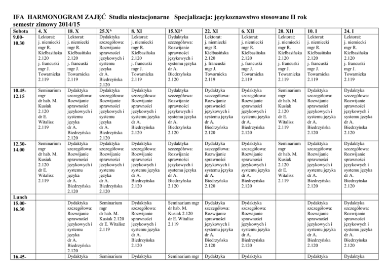 IFA HARMONOGRAM ZAJĘĆ Studia niestacjonarne Specjalizacja: językoznawstwo stosowane II rok semestr zimowy 2014/15 Sobota 9.0010.30 4. X 18. X 25.X* 8. XI 15.XI* 22. XI 6. XII 20. XII 10. I 24. I Lektorat: j. niemiecki mgr R. Kiełbasińska 2.120 j. francuski mgr J. Towarnicka 2.119 Lektorat: j. niemiecki mgr R. Kiełbasińska 2.120 j. francuski mgr J. Towarnicka 2.119 Lektorat: j. niemiecki mgr R. Kiełbasińska 2.120 j. francuski mgr J. Towarnicka 2.119 Dydaktyka szczegółowa: Rozwijanie sprawności językowych i systemu języka dr A. Biedrzyńska 2.120 Lektorat: j. niemiecki mgr R. Kiełbasińska 2.120 j. francuski mgr J. Towarnicka 2.119 Lektorat: j. niemiecki mgr R. Kiełbasińska 2.120 j. francuski mgr J. Towarnicka 2.119 Lektorat: j. niemiecki mgr R. Kiełbasińska 2.120 j. francuski mgr J. Towarnicka 2.119 Lektorat: j. niemiecki mgr R. Kiełbasińska 2.120 j. francuski mgr J. Towarnicka 2.119 Lektorat: j. niemiecki mgr R. Kiełbasińska 2.120 j. francuski mgr J. Towarnicka 2.119 10.4512.15 Seminarium mgr dr hab. M. Kusiak 2.120 dr E. Witalisz 2.119 Dydaktyka szczegółowa: Rozwijanie sprawności językowych i systemu języka dr A. Biedrzyńska 2.120 Dydaktyka szczegółowa: Rozwijanie sprawności językowych i systemu języka dr A. Biedrzyńska 2.120 Dydaktyka szczegółowa: Rozwijanie sprawności językowych i systemu języka dr A. Biedrzyńska 2.120 Dydaktyka szczegółowa: Rozwijanie sprawności językowych i systemu języka dr A. Biedrzyńska 2.120 Seminarium mgr dr hab. M. Kusiak 2.120 dr E. Witalisz 2.119 Dydaktyka szczegółowa: Rozwijanie sprawności językowych i systemu języka dr A. Biedrzyńska 2.120 Dydaktyka szczegółowa: Rozwijanie sprawności językowych i systemu języka dr A. Biedrzyńska 2.120 12.3014.00 Seminarium mgr dr hab. M. Kusiak 2.120 dr E. Witalisz 2.119 Dydaktyka szczegółowa: Rozwijanie sprawności językowych i systemu języka dr A. Biedrzyńska 2.120 Dydaktyka szczegółowa: Rozwijanie sprawności językowych i systemu języka dr A. Biedrzyńska 2.120 Dydaktyka szczegółowa: Rozwijanie sprawności językowych i systemu języka dr A. Biedrzyńska 2.120 Dydaktyka szczegółowa: Rozwijanie sprawności językowych i systemu języka dr A. Biedrzyńska 2.120 Dydaktyka szczegółowa: Rozwijanie sprawności językowych i systemu języka dr A. Biedrzyńska 2.120 Dydaktyka szczegółowa: Rozwijanie sprawności językowych i systemu języka dr A. Biedrzyńska 2.120 Dydaktyka szczegółowa: Rozwijanie sprawności językowych i systemu języka dr A. Biedrzyńska 2.120 Dydaktyka szczegółowa: Rozwijanie sprawności językowych i systemu języka dr A. Biedrzyńska 2.120 Dydaktyka szczegółowa: Rozwijanie sprawności językowych i systemu języka dr A. Biedrzyńska 2.120 Seminarium mgr dr hab. M. Kusiak 2.120 dr E. Witalisz 2.119 Dydaktyka szczegółowa: Rozwijanie sprawności językowych i systemu języka dr A. Biedrzyńska 2.120 Dydaktyka szczegółowa: Rozwijanie sprawności językowych i systemu języka dr A. Biedrzyńska 2.120 Seminarium mgr dr hab. M. Kusiak 2.120 dr E. Witalisz 2.119 Dydaktyka szczegółowa: Rozwijanie sprawności językowych i systemu języka dr A. Biedrzyńska 2.120 Seminarium mgr dr hab. M. Kusiak 2.120 dr E. Witalisz 2.119 Dydaktyka szczegółowa: Rozwijanie sprawności językowych i systemu języka dr A. Biedrzyńska 2.120 Dydaktyka szczegółowa: Rozwijanie sprawności językowych i systemu języka dr A. Biedrzyńska 2.120 Dydaktyka szczegółowa: Rozwijanie sprawności językowych i systemu języka dr A. Biedrzyńska 2.120 Dydaktyka szczegółowa: Rozwijanie sprawności językowych i systemu języka dr A. Biedrzyńska 2.120 Seminarium Dydaktyka Seminarium mgr Dydaktyka Dydaktyka Dydaktyka Dydaktyka Lunch 15.0016.30 16.45- Dydaktyka szczegółowa: Rozwijanie sprawności językowych i systemu języka dr A. Biedrzyńska 2.120 Dydaktyka 18.15 szczegółowa: Rozwijanie sprawności językowych i systemu języka dr A. Biedrzyńska 2.120 mgr dr hab. M. Kusiak 2.120 dr E. Witalisz 2.119 szczegółowa: Rozwijanie sprawności językowych i systemu języka dr A. Biedrzyńska 2.120 dr hab. M. Kusiak 2.120 dr E. Witalisz 2.119 szczegółowa: Rozwijanie sprawności językowych i systemu języka dr A. Biedrzyńska 2.120 szczegółowa: Rozwijanie sprawności językowych i systemu języka dr A. Biedrzyńska 2.120 Niedziela 5. X 9.0010.30 19. X 26. X* 9. XI 16. XI* 23. XI 7. XII Teaching Intercultural Communication mgr E. KowalskaStasiak 2.120 Teaching Intercultural Communication mgr E. KowalskaStasiak 2.120 Options for Speaking in ELT mgr E. KowalskaStasiak 2.120 Teaching Intercultural Communication mgr E. KowalskaStasiak 2.120 Project Work in Teaching Eng. as a Foreign Lg mgr E. KowalskaStasiak 2.120 Options for Speaking in ELT mgr E. KowalskaStasiak 2.120 Teaching Intercultural Communication mgr E. KowalskaStasiak 2.120 Teaching Intercultural Communication mgr E. KowalskaStasiak 2.120 Options for Speaking in ELT mgr E. KowalskaStasiak 2.120 Teaching Intercultural Communication mgr E. KowalskaStasiak 2.120 Project Work in Teaching Eng. as a Foreign Lg mgr E. KowalskaStasiak 2.120 Project Work in Teaching Eng. as a Foreign Lg mgr E. KowalskaStasiak 2.120 Project Work in Teaching Eng. as a Foreign Lg mgr E. KowalskaStasiak 2.120 Project Work in Teaching Eng. as a Foreign Lg mgr E. KowalskaStasiak 2.120 Project Work in Teaching Eng. as a Foreign Lg mgr E. KowalskaStasiak 2.120 Options for Speaking in ELT mgr E. KowalskaStasiak 2.120 10.4512.15 12.3014.00 Lunch 14.3016.00 21. XII szczegółowa: Rozwijanie sprawności językowych i systemu języka dr A. Biedrzyńska 2.120 szczegółowa: Rozwijanie sprawności językowych i systemu języka dr A. Biedrzyńska 2.120 11.I 25. I Teaching Intercultural Communication mgr E. KowalskaStasiak 2.120 Project Work in Teaching Eng. as a Foreign Lg mgr E. KowalskaStasiak 2.120 Options for Speaking in ELT mgr E. KowalskaStasiak 2.120 Teaching Intercultural Communication mgr E. KowalskaStasiak 2.120 Project Work i