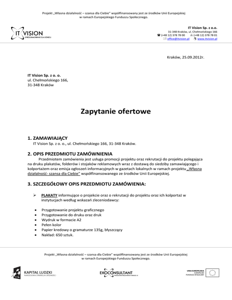 Projekt „Własna działalność – szansa dla Ciebie” współfinansowany jest ze środków Unii Europejskiej w ramach Europejskiego Funduszu Społecznego. IT Vision Sp. z o.o. 31-348 Kraków, ul. Chełmońskiego 166 (+48 12) 378 78 00 (+48 12) 378 78 01 [email protected] www.itvision.pl Kraków, 25.09.2012r. IT Vision Sp. z o. o. ul. Chełmońskiego 166, 31-348 Kraków Zapytanie ofertowe 1. ZAMAWIAJĄCY IT Vision Sp. z o. o., ul. Chełmońskiego 166, 31-348 Kraków. 2. OPIS PRZEDMIOTU ZAMÓWNIENIA Przedmiotem zamówienia jest usługa promocji projektu oraz rekrutacji do projektu polegająca na druku plakatów, folderów i stojaków reklamowych wraz z dostawą do siedziby zamawiającego i kolportażem oraz emisja ogłoszeń informacyjnych w gazetach lokalnych w ramach projektu „Własna działalność- szansa dla Ciebie” współfinansowanego ze środków Unii Europejskiej. 3. SZCZEGÓŁOWY OPIS PRZEDMIOTU ZAMÓWIENIA: PLAKATY informujące o projekcie oraz o rekrutacji do projektu oraz ich kolportaż w instytucjach według wskazań zleceniodawcy: Przygotowanie projektu graficznego Przygotowanie do druku oraz druk Wydruk w formacie A2 Pełen kolor Papier kredowy o gramaturze 135g, błyszczący Nakład: 650 sztuk. Projekt „Własna działalność – szansa dla Ciebie” współfinansowany jest ze środków Unii Europejskiej w ramach Europejskiego Funduszu Społecznego. Projekt „Własna działalność – szansa dla Ciebie” współfinansowany jest ze środków Unii Europejskiej w ramach Europejskiego Funduszu Społecznego. IT Vision Sp. z o.o. 31-348 Kraków, ul. Chełmońskiego 166 (+48 12) 378 78 00 (+48 12) 378 78 01 [email protected] www.itvision.pl FOLDERY informujące o projekcie oraz o rekrutacji do projektu oraz ich kolportaż w instytucjach według wskazań zleceniodawcy: Przygotowanie projektu graficznego Przygotowanie do druku oraz druk folder typu 2 Listki - 2/3 A4 (210x198mm) Pełen kolor z obu stron Papier kredowy o gramaturze 135g, błyszczący Nakład: 1100 sztuk. ULOTKI informujące o projekcie oraz o rekrutacji do projektu oraz ich kolportaż w instytucjach według wskazań zleceniodawcy: Przygotowanie projektu graficznego Przygotowanie do druku oraz druk Ulotka A5 (148,5x210mm) Pełen kolor z obu stron Papier kredowy o gramaturze 135g, błyszczący Nakład: 300 sztuk. STOJAKI REKLAMOWE typu roll- up: Przygotowanie projektu graficznego oraz wykonanie Roll- up jednostronny Konstrukcja: aluminiowa Podstawa: kolor anodowego srebra z niklowanymi bokami Maszt segmentowy Listwa zatrzaskowa Torba w zestawie Funkcje specjalne: szybki montaż i demontaż Materiał zmywalny Wymiary 85x200 Ilość: 3 sztuki. OGŁOSZENIA INFORMACYJNE o rekrutacji do projektu zamieszczone W GAZETACH LOKALNYCH na terenie województwa śląskiego: Przygotowanie propozycji teksu ogłoszenia Projekt „Własna działalność – szansa dla Ciebie” współfinansowany jest ze środków Unii Europejskiej w ramach Europejskiego Funduszu Społecznego. Projekt „Własna działalność – szansa dla Ciebie” współfinansowany jest ze środków Unii Europejskiej w ramach Europejskiego Funduszu Społecznego. IT Vision Sp. z o.o. 31-348 Kraków, ul. Chełmońskiego 166 (+48 12) 378 78 00 (+48 12) 378 78 01 [email protected] www.itvision.pl 5-ciokrotna emisja ogłoszeń w gazetach lokalnych na terenie województwa śląskiego Format reklamy: 1/3 A4 Pełen kolor Emisja ogłoszeń w terminach wskazanych przez zleceniodawcę. 4. TERMIN SKŁADANIA OFERT: Termin składania ofert- do 12 października 2012r. - decyduje data wpływu oferty na adres email: [email protected]. Za prawidłową ofertę uznaje się zeskanowane dokumenty zawierające pieczęć i podpis oferenta. Wzór formularza oferty stanowi załącznik do niniejszego zapytania. 5. TERMIN WYKONANIA ZAMÓWIENIA (łącznie z kolportażem): do 05.11.2012 r. 6. OPIS SPOSOBU PRZYGOTOWANIA OFERTY: Oferent powinien stworzyć ofertę na formularzu załączonym do niniejszego zapytania. Oferta powinna być: Opatrzona pieczątką firmową Posiadać datę sporządzenia Zawierać adres lub siedzibę oferenta, numer telefonu, numer NIP Podpisana czytelnie przez wykonawcę. JEDYNYM KRYTERIUM WYBORU OFERTY JEST CENA (NETTO) ZAPROPONOWANA PRZEZ OFERENTA! NIE DOPUSZCZA SIĘ SKŁADANIA OFERT CZĘŚCIOWYCH. O wyborze najkorzystniejszej oferty zamawiający zawiadomi oferentów za pośrednictwem strony internetowej wdz.itvision.pl. 7. DODATKOWE INFORMACJE Dodatkowych informacji udziela Pani Elżbieta Zychowicz pod numerem telefonu 728 422 366 oraz adresem email: [email protected] SERDECZNIE ZAPRASZAMY DO SKŁADANIA OFERT!!! Projekt „Własna działalność – szansa dla Ciebie” współfinansowany jest ze środków Unii Europejskiej w ramach Europejskiego Funduszu Społecznego. Projekt „Własna działalność – szansa dla Ciebie” współfinansowany jest ze środków Unii Europejskiej w ramach Europejskiego Funduszu Społecznego. IT Vision Sp. z o.o. 31-348 Kraków, ul. Chełmońskiego 166 (+48 12) 378 78 00 (+48 12) 378 78 01 [email protected] www.itvision.pl Załącznik nr 1 Pieczęć firmowa oferenta (adres, numer telefonu, NIP) ………………………………………………. Miejsce i data …….………………………………….. IT Vision Sp. z o. o. ul. Chełmońskiego 166, 31-348 Kraków OFERTA W odpowiedzi na zaproszenie do złożenia oferty w zapytaniu ofertowym na wykonanie usługi promocji projektu oraz rekrutacji do projektu polegającej na druku plakatów, folderów i stojaków reklamowych wraz z dostawą do siedziby zamawiającego i kolportażem oraz emisji ogłoszeń informacyjnych w gazetach lokalnych w ramach projektu „Własna działalność- szansa dla Ciebie” współfinansowanego ze środków Unii Europejskiej, przedstawiam swoja ofertę. Lp. 1. 2. 3. 4. 5. Cena całościowa netto Asortyment Cena całościowa brutto PLAKATY informujące o projekcie oraz o rekrutacji do projektu i ich kolportaż w instytucjach według ws