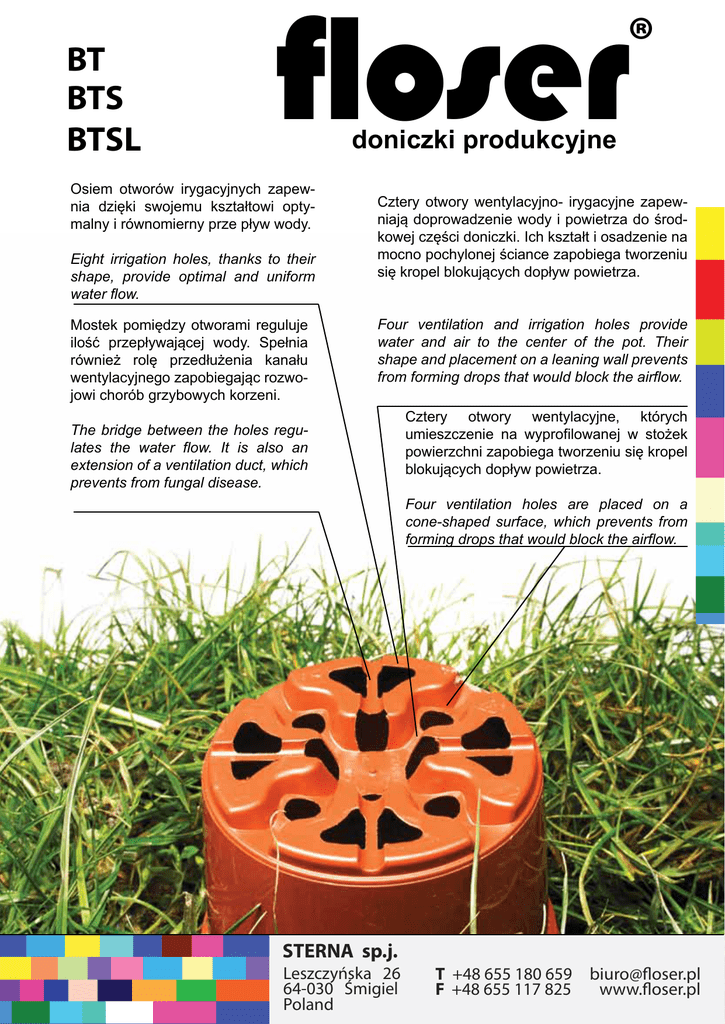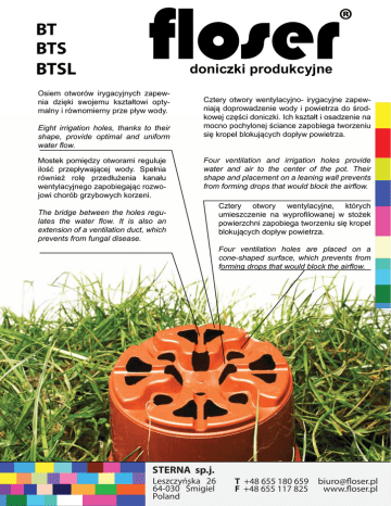 BT BTS BTSL floser ® doniczki produkcyjne Osiem otworów irygacyjnych zapewnia dzięki swojemu kształtowi optymalny i równomierny prze pływ wody. Eight irrigation holes, thanks to their shape, provide optimal and uniform water flow. Mostek pomiędzy otworami reguluje ilość przepływającej wody. Spełnia również rolę przedłużenia kanału wentylacyjnego zapobiegając rozwojowi chorób grzybowych korzeni. Cztery otwory wentylacyjno- irygacyjne zapewniają doprowadzenie wody i powietrza do środkowej części doniczki. Ich kształt i osadzenie na mocno pochylonej ściance zapobiega tworzeniu się kropel blokujących dopływ powietrza. Four ventilation and irrigation holes provide water and air to the center of the pot. Their shape and placement on a leaning wall prevents from forming drops that would block the airflow. The bridge between the holes regulates the water flow. It is also an extension of a ventilation duct, which prevents from fungal disease. Cztery otwory wentylacyjne, których umieszczenie na wyprofilowanej w stożek powierzchni zapobiega tworzeniu się kropel blokujących dopływ powietrza. Four ventilation holes are placed on a cone-shaped surface, which prevents from forming drops that would block the airflow. STERNA sp.j. Leszczyńska 26 64-030 Śmigiel Poland T +48 655 180 659 [email protected] www.floser.pl F +48 655 117 825 floser ® BT BTS BTSL doniczki produkcyjne Seria BT oraz BTS to doniczki przystosowane do upraw w szklarniach na stołach zalewowych i matach podsiąkowych. Doniczki z serii BT oraz BTS posiadają unikatowe dno zapewniające dużą ilość powietrza korzeniowi rośliny. Doniczki doskonale współpracują z sadzarkami. Series BT and BTS are pots for cultivation tables and irrigation mats. These pots have a unique bottom that provides a lot of air to the roots. The pots cooperate with planters. sztuk w opakowaniu opakowań na palecie sztuk na palecie sztuk na palecie pieces per box boxes on a pallet pieces per pallet pieces per pallet mm mm 0 BT BT BT 8,5 9 10 BTS 10,5 BTSL 10,5 5 5 5 5 5 0 0 0 0 0 85 90 100 105 105 65 68 76 80 92 VOL kolor 0,22 l 0,30 l 0,41 l 0,46 l 0,51 l terakota czarny dowolny kolor na zamówienie 2150 18 38700 czarny dowolny kolor na zamówienie 1720 18 30960 czarny dowolny kolor na zamówienie 1280 18 23040 czarny dowolny kolor na zamówienie 1275 18 22950 czarny dowolny kolor na zamówienie 1230 18 22140 terakota terakota terakota terakota terakota BTS 11 5 0 110 82 0,50 l czarny dowolny kolor na zamówienie 1144 18 20592 BTS 12 5 0 120 90 0,72 l czarny dowolny kolor na zamówienie 810 18 14580 czarny dowolny kolor na zamówienie 613 18 11016 BT 13 5 0 130 98 0,85 l terakota terakota STERNA sp.j. Leszczyńska 26 64-030 Śmigiel Poland 19320 T +48 655 180 659 [email protected] www.floser.pl F +48 655 117 825