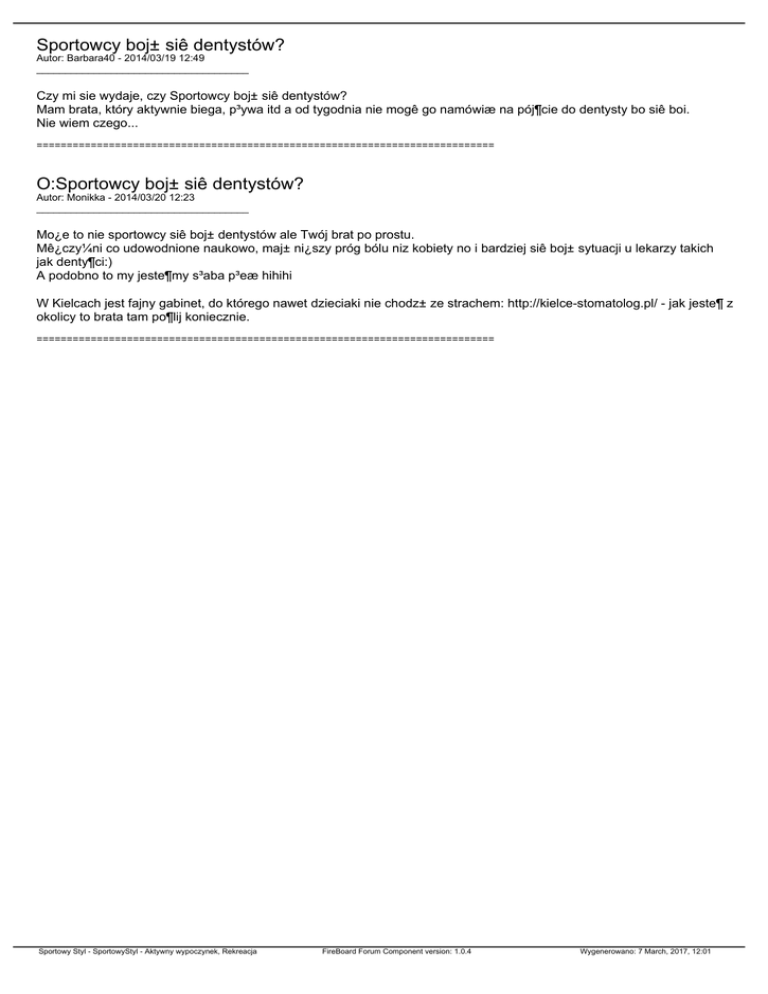 Sportowcy boj± siê dentystów? Autor: Barbara40 - 2014/03/19 12:49 _____________________________________ Czy mi sie wydaje, czy Sportowcy boj± siê dentystów? Mam brata, który aktywnie biega, p³ywa itd a od tygodnia nie mogê go namówiæ na pój¶cie do dentysty bo siê boi. Nie wiem czego... ============================================================================ O:Sportowcy boj± siê dentystów? Autor: Monikka - 2014/03/20 12:23 _____________________________________ Mo¿e to nie sportowcy siê boj± dentystów ale Twój brat po prostu. Mê¿czy¼ni co udowodnione naukowo, maj± ni¿szy próg bólu niz kobiety no i bardziej siê boj± sytuacji u lekarzy takich jak denty¶ci:) A podobno to my jeste¶my s³aba p³eæ hihihi W Kielcach jest fajny gabinet, do którego nawet dzieciaki nie chodz± ze strachem: http://kielce-stomatolog.pl/ - jak jeste¶ z okolicy to brata tam po¶lij koniecznie. ============================================================================ Sportowy Styl - SportowyStyl - Aktywny wypoczynek, Rekreacja FireBoard Forum Component version: 1.0.4 Wygenerowano: 7 March, 2017, 12:01