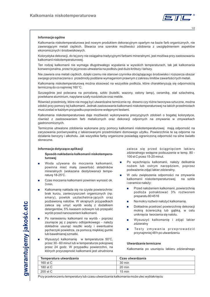 Kalkomania niskotemperaturowa 1/2 Informacje ogólne Kalkomania niskotemperaturowa jest nowym produktem dekoracyjnym opartym na bazie farb organicznych, nie zawierającym metali ciężkich. Stwarza ona szerokie możliwości zdobienia z uwzględnieniem aspektów ekonomicznych i środowiskowych. Kolorystyka dekoracji, do tej pory nie osiągalna tradycyjnymi farbami mineralnymi, jest możliwa przy zastosowaniu kalkomanii niskotemperaturowej. Ten rodzaj kalkomanii nie wymaga długotrwałego wypalania w wysokich temperaturach, tak jak kalkomania konwencjonalna, przez to jej proces utrwalania na podłożu jest dużo krótszy i tańszy. Nie zawiera ona metali ciężkich, dzięki czemu nie stanowi czynnika obciążającego środowisko i rozszerza obszar swojego przeznaczenia o przedmioty poddane wymaganiom prawnym z zakresu limitów zawartości tych metali. Kalkomanię niskotemperaturową można stosować na wszystkie podłoża, które charakteryzują się odpornością termiczną do co najmniej 160 oC. Szczególnie jest polecana na porcelanę, szkło (butelki, wazony, osłony lamp), ceramikę, stal szlachetną, powlekane aluminium, napylane szafy rozdzielcze oraz meble. Również przedmioty, które nie mogą być utwardzalne termicznie np. drewno czy różne tworzywa sztuczne, można zdobić przy pomocy tej kalkomanii. Jednak zastosowanie kalkomanii niskotemperaturowej na takich przedmiotach musi zostać w każdym przypadku poprzedzone wstępnymi testami. Kalkomania niskotemperaturowa daje możliwość wykonywania precyzyjnych zdobień o bogatej kolorystyce, również z zastosowaniem farb metalicznych oraz dekoracji odpornych na zmywanie w zmywarkach gastronomicznych. Termicznie utrwalone zdobienia wykonane przy pomocy kalkomanii niskotemperaturowej mają odporność na zarysowania porównywalną z lakierowanymi przedmiotami domowego użytku. Powierzchnie te są odporne na działanie benzyny i alkoholu. Jak wszystkie farby organiczne posiadają ograniczoną odporność na silne światło słoneczne. zaleca się przed ściągnięciem lakieru zdzieralnego wstępne podsuszenie w temp. 80 100 st C przez 15-20 minut. Informacje dotyczące aplikacji Sposób nakładania kalkomanii niskotemperaturowej gwarantujemy jakość.etc µ Woda używana do moczenia kalkomanii, powinna mieć małą zawartość składników mineralnych (wskazana destylowana)i temperaturę 18-25oC. µ Czas moczenia kalkomanii powinien wynosić ok. 3 min. µ Kalkomanię nakłada się na czyste powierzchnie: brak kurzu, zanieczyszczeń organicznych (np. smary), powłok uszlachetnia-jących oraz pozbawioną nalotów. W skrajnych przypadkach zaleca się umyć wyrób wodą z dodatkiem detergentów, 5% kwasem octowym lub przepalić wyrób przed nanoszeniem kalkomanii. µ µ Po naniesieniu kalkomanii na wyrób - poprzez zsunięcie jej z papieru odbijankowego - należy dokładnie usunąć resztki wody i ewentualne pęcherzyki powietrza, za pomocą miękkiej gumki lub bawełnianej szmatki. Wysuszyć kalkomanię w temperaturze 50oC, przez 30 - 60 minut lub w temperaturze pokojowej przez 24 godz. W przypadku powierzchni, na których przyczepność kalkomanii jest utrudniona Temperatura utwardzania 160 st C 180 st C 200 st C µ Po wyschnięciu kalkomanii, należy delikatnie nożem lub ostrym narzędziem, poprzez podważenie zdjąć lakier zdzieralny. µ W celu zwiększenia odporności na zmywanie kalkomanii niskotemperaturowej na szkle i ceramice należy: µ Przed nałożeniem kalkomanii, powierzchnię podłoża potraktować 3% roztworem preparatu 80 4516 µ Na mokry roztwór nałożyć kalkomanię. µ Dokładnie przetrzeć powierzchnię dekoracji mokrą ściereczką lub gąbką, w celu uniknięcia tworzenia się nalotu. µ Wysuszyć kalkomanię i zdjąć lakier zdzieralny µ Te s t y z m y w a n i a p r z e p r o w a d z i ć przynajmniej 48 h po utwardzeniu Utwardzanie termiczne Kalkomania po usunięciu lakieru zdzieralnego Czas utwardzania 30 min 20 min 15 min Przy przekroczeniu temperatury lub czasu utwardzania kalkomania może ulec wyblaknięciu Kalkomania niskotemperaturowa 2/2 wymaga utrwalania w strumieniu gorącego powietrza lub w wentylowanym piecu. Poniżej przedstawiono warunki utwardzania: Właściwości kalkomanii niskotemperaturowej µ Brak metali ciężkich Bogata kolorystyka Odporność na działanie rozpuszczalników, kwasów i zasad µ Długotrwała odporność na działanie temperatury do 110 st C Przechowywać w suchym miejscu, w temperaturze pokojowej , z dala od promieni słonecznych. Zalecany czas przechowywania - do 1 miesiąca. Gwarantujemy jakość.etc µ µ Przechowywanie kalkomanii niskotemperaturowej IT/OT/5.07/wyd-2/01.2013