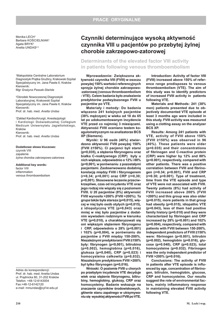 PRACE ORYGINALNE Monika LECH1 Barbara KOŚCIELNIAK2 Agata BRYK3 Anetta UNDAS2,3 Czynniki determinujące wysoką aktywność czynnika VIII u pacjentów po przebytej żylnej chorobie zakrzepowo-zatorowej Determinants of the elevated factor VIII activity in patients following venous thromboembolism Małopolskie Centralne Laboratorium Diagnostyki Prątka Gruźlicy, Krakowski Szpital Specjalistyczny im. Jana Pawła II, Kraków Kierownik: Mgr Grażyna Passak-Stańda 1 Ośrodek Nowoczesnej Diagnostyki Laboratoryjnej, Krakowski Szpital Specjalistyczny im. Jana Pawła II, Kraków Kierownik: Prof. dr. hab. med. Anetta Undas 2 Zakład Kardiochirurgii, Anestezjologii i Kardiologii Doświadczalnej Collegium Medicum Uniwersytetu Jagiellońskiego, Kraków Kierownik: Prof. dr. hab. med. Anetta Undas 3 Dodatkowe słowa kluczowe: czynnik VIII zapalenie żylna choroba zakrzepowo-zatorowa Additional key words: factor VIII inflammation venous thromboembolism Adres do korespondencji: Prof. dr. hab. med. Anetta Undas ul. Prądnicka 80, 31-202 Kraków Telefon: +48-12-6143004 Fax:+48-12-6142120 e-mail: [email protected] 210 Wprowadzenie: Zwiększona aktywność czynnika VIII (FVIII) w osoczu powyżej 150% wartości referencyjnych sprzyja żylnej chorobie zakrzepowo-zatorowej (venous thromboembolism - VTE). Celem badania było znalezienie predyktorów podwyższonego FVIII u pacjentów po VTE. Materiały i metody: Do badania włączono 241 kolejnych pacjentów (38% mężczyzn) w wieku od 18 do 65 lat po udokumentowanym incydencie VTE przed co najmniej 3 miesiącami. Aktywność FVIII oceniano testem koagulometrycznym na analizatorze BCS XP (Siemens). Wyniki: U 96 osób (40%) stwierdzono aktywność FVIII powyżej 150% (FVIII ≥150%). Ci pacjenci byli starsi (p=0,035), a stężenia fibrynogenu oraz białka C-reaktywnego (CRP) były u nich większe, odpowiednio o 12% i 88% (p<0,001), w porównaniu z pozostałymi pacjentami. Zaobserwowano dodatnią korelację między FVIII i fibrynogenem (r=0,34; p<0,001) oraz CRP (r=0,30; p<0,001). Stosowane leczenie przeciwkrzepliwe, czas od incydentu VTE oraz jego rodzaj nie wiązały się z poziomem FVIII. U 20 pacjentów (8%) aktywność FVIII wynosiła >200% (FVIII >200%). Ta grupa także była starsza (p=0,015), więcej w niej było osób otyłych (p=0,015), z idiopatyczną VTE (p=0,043) oraz mniej w niej było pacjentów z dodatnim wywiadem rodzinnym w kierunku VTE (p=0,010), a charakteryzowali się oni większym stężeniem fibrynogenu i CRP, odpowiednio o 28% (p<0,001) i 102% (p=0,004), w porównaniu do pacjentów z FVIII między 150-200%. Niezależnymi predyktorami FVIII ≥150% były: fibrynogen (p<0,001), bilirubina (p=0,002), hemoglobina (p=0,016), glukoza (p=0,040), CRP (p=0,023) i homocysteina całkowita (p=0,032). Niezależnym predyktorem FVIII >200% był tylko fibrynogen (p=0,016). Wnioski: O poziomie FVIII u chorych po przebytym incydencie VTE decyduje wiek oraz stężenie fibrynogenu, bilirubiny, hemoglobiny, glukozy, CRP oraz homocysteiny. Badanie wskazuje na znaczenie czynników środowiskowych, głównie stanu zapalnego w utrzymywaniu się wysokiej aktywności FVIII po VTE. Introduction: Activity of factor VIII (FVIII) increased above 150% of reference range predisposes to venous thromboembolism (VTE). The aim of this study was to identify predictors of increased FVIII activity in patients following VTE. Materials and Methods: 241 (38% men) patients presented due to objectively documented VTE episode at least 3 months ago were included in this study. FVIII activity was measured using a clotting assay on the analyzer BCS XP. Results: Among 241 patients with VTE, activity of FVIII above 150% (FVIII ≥150%) was observed in 96 (40%). These patients were older (p=0.035) and their concentrations of fibrinogen and C-reactive protein (CRP) were higher by 12% and 88% (p<0.001), respectively, compared with other patients. There was a positive correlation between FVIII and fibrinogen (r=0.34; p<0.001), FVIII and CRP (r=0.30; p<0.001). Type of treatment, time from the VTE episode and type of VTE were not associated with FVIII. Twenty patients (8%) had activity of FVIII increased above 200% (FVIII >200%) and this group was also older (p=0.015), more patients in that group had obesity (p=0.015), idiopathic VTE (p=0.043), less of them had positive family history (p=0.010) and they were characterized by fibrinogen and CRP increased by 28% (p<0.001) and 102% (p=0.004), respectively, compared with patients with FVIII between 150-200%. Independent predictors of FVIII ≥150% were: fibrinogen (p<0.001), bilirubin (p=0.002), hemoglobin (p=0.016), glucose (p=0.040), CRP (p=0.023), total homocysteine (p=0.032). Fibrinogen was the only independent predictor of FVIII >200% (p=0.016). Conclusions: The activity of FVIII in patients after VTE episode is influenced by age, concentration of fibrinogen, bilirubin, hemoglobin, glucose, CRP and homocysteine. Our results suggest the role of environmental factors, mainly inflammatory response in maintaining elevated FVIII activity following VTE. M. Lech i wsp. Wstęp Czynnik VIII (FVIII) o masie 330 kD, należy do białek ostrej fazy i jest osoczowym czynnikiem krzepnięcia, który występuje w postaci zymogenu, a w 95% związany jest z czynnikiem von Willebranda (vWF), chroniącym go przed aktywacją [1] oraz przed inaktywacją przez aktywne białko C [1,2]. FVIII jest aktywowany przez trombinę i jest składową tenazy wewnątrzpochodnej pełniąc funkcję kofaktora aktywacji FX przez aktywny czynnik IX (FIX) na fosfolipidowej powierzchni błon [2]. Miejscem syntezy FVIII jest nie tylko wątroba, śledziona i węzły chłonne, ale także komórki śródbłonka naczyń płuc [3], natomiast usuwanie FVIII z krążenia zachodzi prawdopodobnie z udziałem receptorów lipoproteinowych [4]. Żylna choroba zakrzepowo-zatorowa (venous thromboembolism - VTE), obejmująca zakrzepicę żył głębokich (deep vein thrombosis - DVT) oraz zatorowość pł