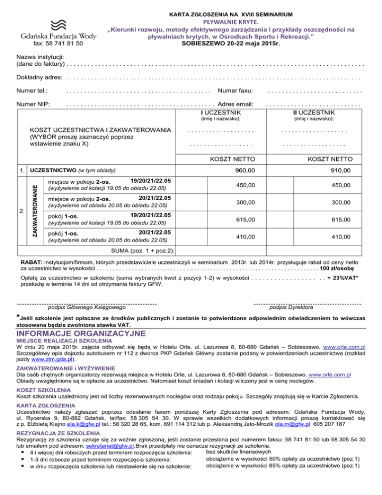 KARTA ZGŁOSZENIA NA XVIII SEMINARIUM PŁYWALNIE KRYTE. „Kierunki rozwoju, metody efektywnego zarządzania i przykłady oszczędności na pływalniach krytych, w Ośrodkach Sportu i Rekreacji.” SOBIESZEWO 20-22 maja 2015r. fax: 58 741 81 50 Nazwa instytucji: (dane do faktury) . . . . . . . . . . . . . . . . . . . . . . . . . . . . . . . . . . . . . . . . . . . . . . . . . . . . . . . . . . . . . . . . . . . . . . . . . . . . . . . . . . . . Dokładny adres: . . . . . . . . . . . . . . . . . . . . . . . . . . . . . . . . . . . . . . . . . . . . . . . . . . . . . . . . . . . . . . . . . . . . . . . . . . . . . . . . . . . Numer tel.: ......................................... Numer faxu: ........................... Numer NIP: . . . . . . . . . . . . . . . . . . . . . . . . . . . . . . . . . . . . . . . . . . Adres email: I UCZESTNIK ........................... II UCZESTNIK KOSZT UCZESTNICTWA I ZAKWATEROWANIA (WYBÓR proszę zaznaczyć poprzez wstawienie znaku X) (imię i nazwisko): (imię i nazwisko): ................... ................... .................. .................. KOSZT NETTO 1. UCZESTNICTWO (w tym obiady) 19/20/21/22.05 2. ZAKWATEROWANIE miejsce w pokoju 2-os. (wyżywienie od kolacji 19.05 do obiadu 22.05) 20/21/22.05 miejsce w pokoju 2-os. (wyżywienie od obiadu 20.05 do obiadu 22.05) pokój 1-os. 19/20/21/22.05 (wyżywienie od kolacji 19.05 do obiadu 22.05) pokój 1-os. 20/21/22.05 (wyżywienie od obiadu 20.05 do obiadu 22.05) KOSZT NETTO 960,00 910,00 450,00 450,00 300,00 300,00 615,00 615,00 410,00 410,00 SUMA (poz. 1 + poz.2): RABAT: instytucjom/firmom, których przedstawiciele uczestniczyli w seminarium 2013r. lub 2014r. przysługuje rabat od ceny netto za uczestnictwo w wysokości . . . . . . . . . . . . . . . . . . . . . . . . . . . . . .. . . . . . . . . . . . . . . . . . . . . . . . . . . . . . . . . . . . . . . . 100 zł/osobę Opłatę za uczestnictwo w szkoleniu (suma wybranych kwot z pozycji 1-2) w wysokości . . . . . . . . . . . . . . . . . . . + 23%VAT* przekażę w terminie 14 dni od otrzymania faktury GFW. podpis Głównego Księgowego podpis Dyrektora *Jeśli szkolenie jest opłacane ze środków publicznych i zostanie to potwierdzone odpowiednim oświadczeniem to wówczas stosowana będzie zwolniona stawka VAT. INFORMACJE ORGANIZACYJNE MIEJSCE REALIZACJI SZKOLENIA W dniu 20 maja 2015r. zajęcia odbywać się będą w Hotelu Orle, ul. Lazurowa 8, 80-680 Gdańsk – Sobieszewo. www.orle.com.pl Szczegółowy opis dojazdu autobusem nr 112 z dworca PKP Gdańsk Główny zostanie podany w potwierdzeniach uczestnictwa (rozkład jazdy www.ztm.gda.pl). ZAKWATEROWANIE i WYŻYWIENIE Dla osób chętnych organizatorzy rezerwują miejsca w Hotelu Orle, ul. Lazurowa 8, 80-680 Gdańsk – Sobieszewo. www.orle.com.pl Obiady uwzględnione są w opłacie za uczestnictwo. Natomiast koszt śniadań i kolacji wliczony jest w cenę noclegów. KOSZT SZKOLENIA Koszt szkolenia uzależniony jest od liczby rezerwowanych noclegów oraz rodzaju pokoju. Szczegóły znajdują się w Karcie Zgłoszenia. KARTA ZGŁOSZENIA Uczestnictwo należy zgłaszać poprzez odesłanie faxem poniższej Karty Zgłoszenia pod adresem: Gdańska Fundacja Wody, ul. Rycerska 9, 80-882 Gdańsk, tel/fax: 58 305 54 30. W sprawie wszelkich dodatkowych informacji proszę kontaktować się z p. Elżbietą Kiejno [email protected] tel.: 58 320 28 65, kom. 691 114 312 lub p. Aleksandrą Jato-Mrozik [email protected] 605 207 187 REZYGNACJA ZE SZKOLENIA Rezygnację ze szkolenia uznaje się za ważnie zgłoszoną, jeśli zostanie przesłana pod numerem faksu: 58 741 81 50 lub 58 305 54 30 lub emailem pod adresem: [email protected] przedpłaty nie oznacza rezygnacji ze szkolenia. bez skutków finansowych 4 i więcej dni roboczych przed terminem rozpoczęcia szkolenia: obciążenie w wysokości 50% opłaty za uczestnictwo (poz.1) 1-3 dni robocze przed terminem rozpoczęcia szkolenia: obciążenie w wysokości 85% opłaty za uczestnictwo (poz.1) w dniu rozpoczęcia szkolenia lub niestawienie się na szkolenie:
