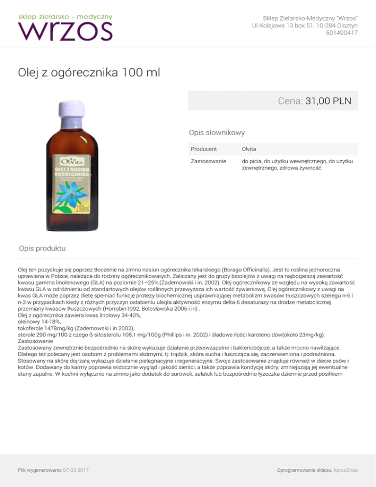 Sklep Zielarsko-Medyczny "Wrzos" Ul.Kolejowa 13 box 51, 10-284 Olsztyn 501490417 Olej z ogórecznika 100 ml Cena: 31,00 PLN Opis słownikowy Producent Olvita Zastosowanie do picia, do użytku wewnętrznego, do użytku zewnętrznego, zdrowa żywność Opis produktu Olej ten pozyskuje się poprzez tłoczenie na zimno nasion ogórecznika lekarskiego (Borago Officinalis). Jest to roślina jednoroczna uprawiana w Polsce, należąca do rodziny ogórecznikowatych. Zaliczany jest do grupy bioolejów z uwagi na najbogatszą zawartość kwasu gamma linolenowego (GLA) na poziomie 21–25%,(Zadernowski i in. 2002). Olej ogórecznikowy ze względu na wysoką zawartość kwasu GLA w odróżnieniu od standartowych olejów roślinnych przewyższa ich wartość żywieniową. Olej ogórecznikowy z uwagi na kwas GLA może poprzez dietę spełniać funkcję protezy biochemicznej usprawniającej metabolizm kwasów tłuszczowych szeregu n-6 i n-3 w przypadkach kiedy z różnych przyczyn osłabieniu uległa aktywność enzymu delta-6 desaturazy na drodze metabolicznej przemiany kwasów tłuszczowych (Horrobin1992, Bolesławska 2006 i in) . Olej z ogórecznika zawiera kwas linolowy 34-40%, oleinowy 14-18%, tokoferole 1478mg/kg (Zadernowski i in 2002), sterole 290 mg/100 z czego ß-sitosterolu 108,1 mg/100g (Phillips i in. 2002) i śladowe ilości karotenoidów(około 23mg/kg). Zastosowanie Zastosowany zewnętrznie bezpośrednio na skórę wykazuje działanie przeciwzapalne i bakteriobójcze, a także mocno nawilżające. Dlatego też polecany jest osobom z problemami skórnymi, tj: trądzik, skóra sucha i łuszcząca się, zaczerwieniona i podrażniona. Stosowany na skórę dojrzałą wykazuje działanie pielęgnacyjne i regeneracyjne. Swoje zastosowanie znajduje również w diecie psów i kotów. Dodawany do karmy poprawia widocznie wygląd i jakość sierści, a także poprawia kondycję skóry, zmniejszają jej ewentualne stany zapalne. W kuchni wyłącznie na zimno jako dodatek do surówek, sałatek lub bezpośrednio łyżeczka dziennie przed posiłkiem Plik wygenerowano: 07-03-2017 Powered by TCPDF (www.tcpdf.org) Oprogramowanie sklepu: AptusShop