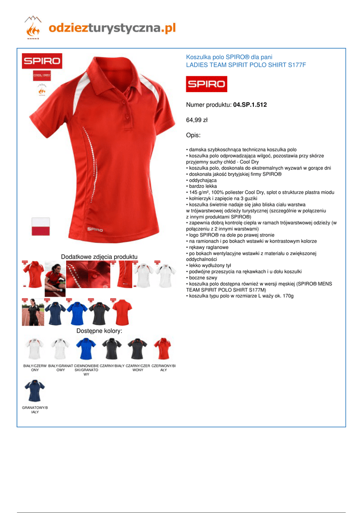 Koszulka polo SPIRO® dla pani LADIES TEAM SPIRIT POLO SHIRT S177F Numer produktu: 04.SP.1.512 64,99 zł Opis: Dodatkowe zdjęcia produktu Dostępne kolory: BIAŁY/CZERW BIAŁY/GRANAT CIEMNONIEBIE CZARNY/BIAŁY CZARNY/CZER CZERWONY/BI ONY OWY SKI/GRANATO WONY AŁY WY GRANATOWY/B IAŁY Powered by TCPDF (www.tcpdf.org) • damska szybkoschnąca techniczna koszulka polo • koszulka polo odprowadzająca wilgoć, pozostawia przy skórze przyjemny suchy chłód - Cool Dry • koszulka polo, doskonała do ekstremalnych wyzwań w gorące dni • doskonała jakość brytyjskiej firmy SPIRO® • oddychająca • bardzo lekka • 145 g/m², 100% poliester Cool Dry, splot o strukturze plastra miodu • kołnierzyk i zapięcie na 3 guziki • koszulka świetnie nadaje się jako bliska ciału warstwa w trójwarstwowej odzieży turystycznej (szczególnie w połączeniu z innymi produktami SPIRO®) • zapewnia dobrą kontrolę ciepła w ramach trójwarstwowej odzieży (w połączeniu z 2 innymi warstwami) • logo SPIRO® na dole po prawej stronie • na ramionach i po bokach wstawki w kontrastowym kolorze • rękawy raglanowe • po bokach wentylacyjne wstawki z materiału o zwiększonej oddychalności • lekko wydłużony tył • podwójne przeszycia na rękawkach i u dołu koszulki • boczne szwy • koszulka polo dostępna również w wersji męskiej (SPIRO® MENS TEAM SPIRIT POLO SHIRT S177M) • koszulka typu polo w rozmiarze L waży ok. 170g