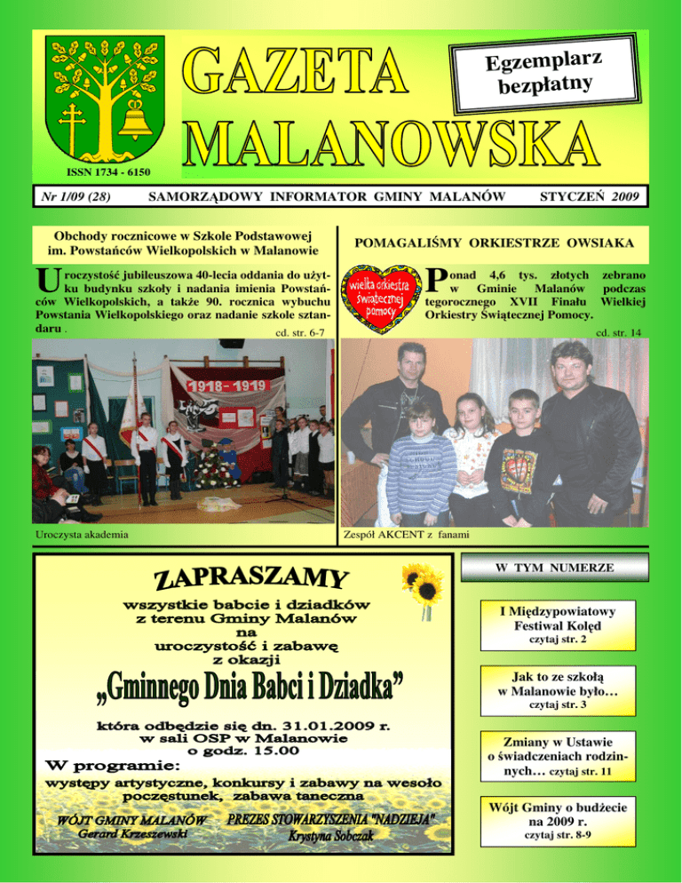 Egzemplarz bezpłatny . ISSN 1734 - 6150 Nr 1/09 (28) SAMORZĄDOWY INFORMATOR GMINY MALANÓW Obchody rocznicowe w Szkole Podstawowej im. Powstańców Wielkopolskich w Malanowie U roczystość jubileuszowa 40-lecia oddania do użytku budynku szkoły i nadania imienia Powstańców Wielkopolskich, a także 90. rocznica wybuchu Powstania Wielkopolskiego oraz nadanie szkole sztandaru . cd. str. 6-7 Uroczysta akademia STYCZEŃ 2009 POMAGALIŚMY ORKIESTRZE OWSIAKA P onad 4,6 tys. złotych zebrano w Gminie Malanów podczas tegorocznego XVII Finału Wielkiej Orkiestry Świątecznej Pomocy. cd. str. 14 Zespół AKCENT z fanami W TYM NUMERZE I Międzypowiatowy Festiwal Kolęd czytaj str. 2 Jak to ze szkołą w Malanowie było… czytaj str. 3 Zmiany w Ustawie o świadczeniach rodzinnych… czytaj str. 11 Wójt Gminy o budżecie na 2009 r. czytaj str. 8-9 I Międzypowiatowy Festiwal Kolęd I Międzypowiatowy Festiwal Kolęd, Pastorałek i Piosenek Zimowych sprawił, że w niedzielne, grudniowe popołudnie gościliśmy w Malanowie wielu młodych artystów, przybyłych do nas z różnych zakątków Wielkopolski, aby poprzez wspólne kolędowanie kultywować tradycję i obrzędy bożonarodzeniowe. Festiwal zorganizowany został w gościnnej sali restauracji Domal, którą wypełnili miłośnicy kolęd, rodzice, dziadkowie i opiekunowie młodych wykonawców. Nie zabrakło przedstawicieli władz samorządowych: Gerarda Krzeszewskiego – Wójta Gminy Malanów, Ireneusza Augustyniaka - Przewodniczącego Rady Gminy w Malanowie, Michała Harasnego - wice wójta i Artura Nowickiego – sekretarza. Gościliśmy również proboszcza naszej parafii - ks. prałata Stanisława Płaszczyka i Zbigniewa Ryczyńskiego – prezesa Koła Gminnego Towarzystwa Samorządowego. Kolęda zbliża ludzi, buduje między nimi więź, daje poczucie bliskości, bezpieczeństwa i ciepła, nawet w najzimniejszym czasie. Jest przepełniona dobrem i miłością. Taką właśnie atmosferę, za sprawą młodych artystów, można było odczuć na malanowskim festiwalu. Zainteresowanie tą imprezą przeszło wszelkie oczekiwania organizatorów, ponieważ wpłynęło blisko 60 zgłoszeń. Laureaci w kat. 7-13 lat Ostatecznie do konkursu zakwalifikowano 33 wykonawców w kat. 7-13 lat i 11 w kat. 14-16 lat, (o udziale decydowała data nadesłania zgłoszenia). Oceny festiwalowych prezentacji dokonało jury w składzie: Joanna Gogulska dyrygent chóru Viribus Unitis, Marta Tomczyk- Groblica - członkini chóru Viribus Unitis i Krystian Weber instruktor ds. muzyki z Centrum Kultury i Sztuki w Koninie. Po wysłuchaniu wszystkich konkursowych wykonawców jury przyznało nagrody i wyróżnienia w poszczególnych kategoriach: Nagroda GRAND PRIX Weronika Loch – MDK w Koninie Kategoria 7 - 13 lat: I nagroda - Patrycja Grabarczyk – MDK w Koninie II nagroda – Marta Gomułka – SP nr 1 w Turku 2 Weronika Loch — zdobywczyni nagrody Grand Prix III nagroda-Karolina Libertowska- SP w Chylinie Wyróżnienia: - Daria Olas – SP w Dobrej - Partycja Olszewska – SP w Piekarach - Klaudiusz Wilelogórka – SP w Brudzewie - Iwona Wszendybył – SP w Dobrej Kategoria 14 - 16 lat: I nagroda – Agnieszka Falborska – Gimnazjum w Dębach Szlacheckich II nagroda – Joanna Zarębska – MDK w Koninie III nagroda - Julia Tran – Gimnazjum w Ruchocicach Wyróżnienie: Klaudia Woźniak – GOK we Władysławowie Organizatorzy pragną bardzo serdecznie podziękować Państwu Teresie i Czesławowi Dopieralskim oraz Sylwii Dopieralskiej za udostępnienie sali bankietowej restauracji Domal, a Panu Jerzemu Kubackiemu za ufundowanie poczęstunku dla wszystkich uczestników festiwalu. Podziękowania kierujemy również pod adresem Anny Marciniak i chóru Gimnazjum w Malanowie, którego koncert odbył się w trakcie obrad jury. Równie ciepłe słowa podziękowania pragniemy skierować pod adresem osób, które przyczyniły się do organizacji i sprawnego prowadzenia festiwalu. Dziękujemy: Marcie Drygała, Klaudii Górskiej, Łucji Stefaniak i Krystianowi Perlińskiemu, Basi Mareckiej i Paniom ze Środowiskowego Domu Samopomocy w Miłaczewie. Bardzo pochlebne opinie uczestników i gości o organizacji konkursu oraz opinia jury o poziomie artystycznym wykonawców pozwalają nam wyrazić nadzieję, że Międzypowiatowy Festiwal Kolęd, Pastorałek i Piosenek Zimowych będzie jednym z ważniejszych wydarzeń kulturalnych w naszej miejscowości, a nawet regionie i na stałe zagości w kalendarzu imprez Gminnego Centrum Kultury i Sportu w Malanowie. Gazeta Malanowska Małgorzata Przygońska dyrektor GCKiS w Malanowie styczeń 2009 Jak to ze szkołą w Malanowie było… cz. 2 W 1976 roku nastąpiła zmiana na stanowisku gminnego dyrektora. Został nim p. Kazimierz Nowicki. W Szkole Podstawowej w Malanowie pracowało wówczas 21 nauczycieli. Można zauważyć, że w ciągu 7 lat liczba nauczycieli pracujących w tej szkole wzrosła o prawie 50 %. I tak do roku 1984, kiedy to placówki oświatowe zostały przyporządkowane gminom. Pan Kazimierz Nowicki został Inspektorem Oświaty i Wychowania. Natomiast funkcję dyrektora szkoły w Malanowie przejęła w roku 1986 p. Bogusława Nowicka. Szybko okazuje się, że nowy budynek szkolny jest za mały i nie spełnia oczekiwań i potrzeb, w związku z czym pani dyrektor podjęła Zespół taneczny goście, między innymi Naczelnik Wydziału Ministra Edukacji Narodowej p. Maria Branecka, Senator Rzeczpospolitej Polskiej p. Ryszard Sławiński, Kurator Oświaty w Koninie dr Tomasz Olejniczak, przedstawiciel Krajowego Departamentu Kuratorów Oświaty, przedstawiciel Wojewódzkiego Ośrodka Metodycznego, członkowie Rady Gminy, członkowie oddziału Zarządu ZNP, Przewodnicząca Regionalnej Sekcji Oświaty i Wychowania NSZZ „Solidarność” w Koninie p. Barbara Kwolek, prezesi urzędów, dyrektorzy szkół. Mimo oddania do użytku nowego skrzydła z ośmioma izbami lekcyjnymi, szkoła nadal nie spełniała oczekiwań. Kazimie