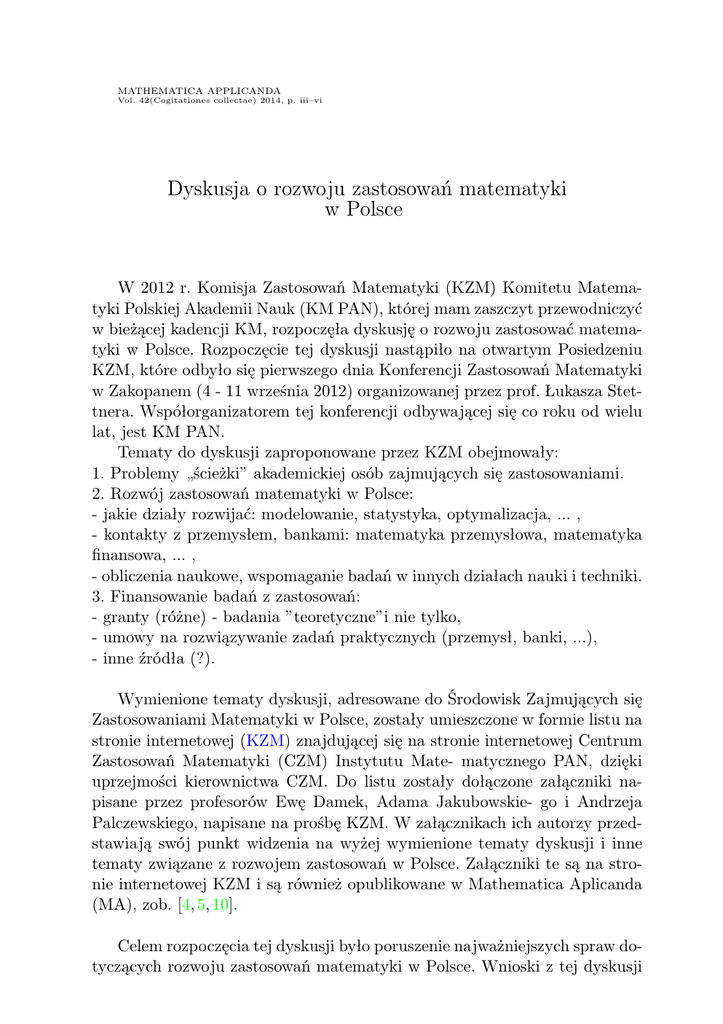 MATHEMATICA APPLICANDA Vol. 42(Cogitationes collectae) 2014, p. iii–vi Dyskusja o rozwoju zastosowań matematyki w Polsce W 2012 r. Komisja Zastosowań Matematyki (KZM) Komitetu Matematyki Polskiej Akademii Nauk (KM PAN), której mam zaszczyt przewodniczyć w bieżącej kadencji KM, rozpoczęła dyskusję o rozwoju zastosować matematyki w Polsce. Rozpoczęcie tej dyskusji nastąpiło na otwartym Posiedzeniu KZM, które odbyło się pierwszego dnia Konferencji Zastosowań Matematyki w Zakopanem (4 - 11 września 2012) organizowanej przez prof. Łukasza Stettnera. Współorganizatorem tej konferencji odbywającej się co roku od wielu lat, jest KM PAN. Tematy do dyskusji zaproponowane przez KZM obejmowały: 1. Problemy „ścieżki” akademickiej osób zajmujących się zastosowaniami. 2. Rozwój zastosowań matematyki w Polsce: - jakie działy rozwijać: modelowanie, statystyka, optymalizacja, ... , - kontakty z przemysłem, bankami: matematyka przemysłowa, matematyka finansowa, ... , - obliczenia naukowe, wspomaganie badań w innych działach nauki i techniki. 3. Finansowanie badań z zastosowań: - granty (różne) - badania ”teoretyczne”i nie tylko, - umowy na rozwiązywanie zadań praktycznych (przemysł, banki, ...), - inne źródła (?). Wymienione tematy dyskusji, adresowane do Środowisk Zajmujących się Zastosowaniami Matematyki w Polsce, zostały umieszczone w formie listu na stronie internetowej (KZM) znajdującej się na stronie internetowej Centrum Zastosowań Matematyki (CZM) Instytutu Mate- matycznego PAN, dzięki uprzejmości kierownictwa CZM. Do listu zostały dołączone załączniki napisane przez profesorów Ewę Damek, Adama Jakubowskie- go i Andrzeja Palczewskiego, napisane na prośbę KZM. W załącznikach ich autorzy przedstawiają swój punkt widzenia na wyżej wymienione tematy dyskusji i inne tematy związane z rozwojem zastosowań w Polsce. Załączniki te są na stronie internetowej KZM i są również opublikowane w Mathematica Aplicanda (MA), zob. [4, 5, 10]. Celem rozpoczęcia tej dyskusji było poruszenie najważniejszych spraw dotyczących rozwoju zastosowań matematyki w Polsce. Wnioski z tej dyskusji iv Dyskusja KZM miały być przygotowane jako postulaty środowisk zajmujących się zastosowaniami matematyki i przedstawienie ich na posiedzeniu KM PAN, licząc na poparcie KM PAN w celu ich realizacji. Realizacja przyjętych postulatów mogłaby się przyczynić do rozwoju zastosowań w Polsce. W dyskusji internetowej zabrało głos 11 dyskutantów. Znajdują się one na stronie internetowej KZM i są również opublikowane w MA, zob. [1–15]. Różne sprawy dotyczące rozwoju zastosowań matematyki w Polsce zostały tam poruszone, od wpływu zastosowań matematyki na rozwój różnych działów nauki, techniki i gospodarki, po nowe specjalizacje w badaniach związanych z zastosowaniami, np. statystyka stosowana itd. Zachęcam Czytelników MA do zapoznania się z treścią tych wystąpień. Zdominował temat dotyczący ”ścieżki” akademickiej. Można wyróżnić w nim dwa pod-tematy: i/ kryteria oceny dorobku z zastosowań matematyki przy nadawaniu stopni dr, dr hab i tytułu profesora. Dotyczą one też przy awansach ma stanowiska profesorskie. ii/ wydzielenie zastosowań matematyki jako nowej dyscypliny, w ramach matematyki, przy nadawaniu stopni dr, dr hab i tytułu profesora. Odnośnie pierwszego pod-tematu, w dyskusji były podane konkretne kryteria oceny dorobku z zastosowań matematyki, uwzględniające interdyscyplinarność zastosowań, zob. [4] i inne. W sprawie drugiego tematu głosy były podzielone, często kończyły się stwierdzeniem, że na takie zmiany jest jeszcze za wcześnie. Dyskusja o zastosowaniach matematyki w Polsce odbyła się również na dwóch posiedzeniach KM PAN w 2013 i 2014 r. Najwięcej głosów w tej dyskusji dotyczyło „ścieżki” akademickiej. Głosy dotyczące wydzielania zastosowań matematyki jako nowej dyscypliny przy nadawaniu stopni naukowych i tytułu profesora, były podzielone na tak i nie. Wypowiedzi na temat poszerzenia kryteriów oceny dorobku z zastosowań matematyki, na ogół, były pozytywne, zwracające uwagę na interdyscyplinarność zastosowań, na trudności oceny uzyskanych rezultatów jako osiągnięć matematycznych itd. W tej sprawie KM PAN na swoim marcowym posiedzeniu bieżącego roku przyjął Uchwałę zaproponowaną przez KZM, zob. Appendix do tego tekstu. Uchwała ta została przesłana do Dziekanów Wydziałów które w nazwie mają matematyka. Zwraca się w niej uwagę na rosnące znaczenie zastosowań matematyki i ”potrzebę poszerzenia kryteriów i sposobu oceny dorobku przy przewodach doktorskich, habilitacyjnych i profesorskich”. Do Uchwały zostały dołączone załączniki, zob. - Wiad.Matem tom 50(2). W załącznikach ich autorzy przedstawiają różne stanowiska w sprawach poruszonych w dyskusji, z ich punktu widzenia. Wydaje się, że są one reprezentatywne dla środowiska matematyków polskich. M. Dryja v Uchwała Komitetu Matematyki PAN z dnia 26 lutego 2014 r. Komitet Matematyki PAN na posiedzeniu plenarnym w dniu 26 lutego 2014 r. podjął następującą uchwałę: W związku z rosnącym znaczeniem zastosowań matematyki, a w szczególności statystyki, Komitet Matematyki Polskiej Akademii Nauk zwraca się z prośbą do środowiska matematyków polskich o uwzględnienie zmian zachodzących w tym zakresie. Powodują one potrzebę poszerzenia kryteriów i sposobu oceny dorobku przy przewodach doktorskich, habilitacyjnych i profesorskich tak, by uwzględnić specyfikę wyłaniających się nowych specjalności w zakresie zastosowań matematyki. W szczególności należy rozważyć możliwość powoływania do komisji oceniającej dorobek, specjalistów (recenzentów) z dziedziny, której dotyczy zastosowanie. W ocenie dorobku należy także uwzględnić prace zawierające istotne i nietrywialne zastosowania matematyki opublikowane w czasopismach nie