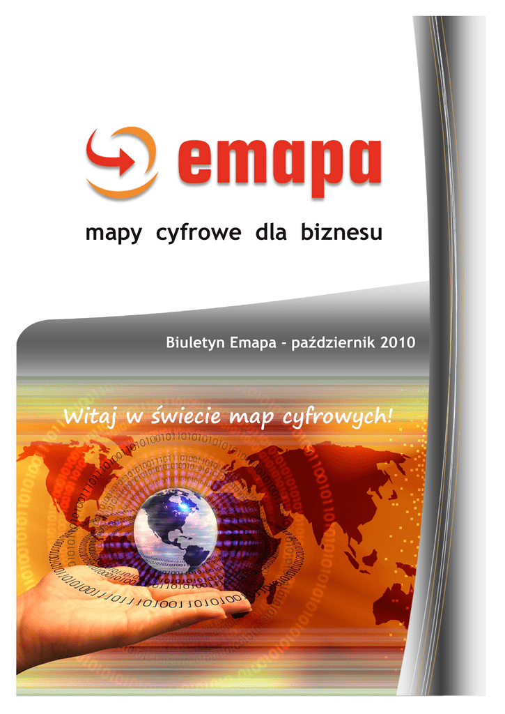 mapy cyfrowe dla biznesu Biuletyn Emapa ‐ październik 2010 Witaj w świecie map cyfrowych! mapy cyfrowe dla biznesu W numerze 2 strona www.emapa.pl mapy cyfrowe dla biznesu mapy 3 strona www.emapa.pl mapy cyfrowe dla biznesu mapy 4 strona www.emapa.pl mapy cyfrowe dla biznesu mapy 5 strona www.emapa.pl mapy cyfrowe dla biznesu technologia 5 strona www.emapa.pl mapy cyfrowe dla biznesu mapy 6 strona www.emapa.pl mapy cyfrowe dla biznesu wydarzenia Spółka Emapa, przyczyniając się do przestrzegania bezpieczeństwa na drogach i przejazdach kolejowych, została partnerem konkursu organizowanego przez PKP Polskie Linie Kolejowe. Celem konkursu jest podniesienie świadomości społeczeństwa w zakresie bezpieczeństwa na przejazdach kolejowo - drogowych. Adresatami konkursu są osoby dorosłe – kierowcy. Zadaniem uczestników konkursu jest ułożenie znaku STOP w sposób niekonwencjonalny i sfotografowanie go. Zdjęcia są umieszczane na stronie internetowej, na której internauci głosują. Wygrywają uczestnicy z największą liczbą głosów. Dla najlepszych czekają zestawy nawigacji Spółki Emapa oraz Multimedialne Mapy Polski i Europy. Zachęcamy do odwiedzenia zakładki Galeria Konkur‐ sowa i zapoznania się z nadesłanymi projektami. 6 strona www.emapa.pl mapy cyfrowe dla biznesu wydarzenia www.gitara.wroclaw.pl 7 strona www.emapa.pl mapy cyfrowe dla biznesu wydarzenia Emapa na Targach ROTRA w Kielcach 8 strona www.emapa.pl mapy cyfrowe dla biznesu Dołącz do nas na portalu Facebook! 9 strona www.emapa.pl mapy cyfrowe dla biznesu w prasie w sieci www.emapa.pl 14 strona www.emapa.pl