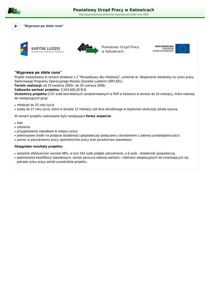 Powiatowy Urząd Pracy w Katowicach http://pup.katowice.pl/strona/-wyprawa-po-zlote-runo-/269 "Wyprawa po złote runo" "Wyprawa po złote runo" Projekt zrealizowany w ramach działania 1.2 "Perspektywy dla młodzieży", schemat a) -Wspieranie młodzieży na rynku pracy Sektorowego Programu Operacyjnego Rozwój Zasobów Ludzkich (SPO RZL). Termin realizacji: od 15 kwietnia 2005r. do 30 czerwca 2006r. Całkowita wartość projektu: 3.503.600,30 PLN Uczestnicy projektu:1147 osób bezrobotnych zarejestrowanych w PUP w Katowice w okresie do 24 miesięcy, które należały do następujących grup: ● ● młodzież do 25 roku życia osoby do 27 roku życia, które w okresie 12 miesięcy (od dnia określonego w dyplomie) ukończyły szkołę wyższą W ramach projektu realizowane były następujące formy wsparcia: ● ● ● ● ● staż szkolenia przygotowanie zawodowe w miejscu pracy jednorazowe środki na podjęcie działalności gospodarczej (połączone z doradztwem z zakresu przedsiębiorczości) pomoc w poszukiwaniu pracy (pośrednictwo pracy oraz poradnictwo zawodowe) Osiągnięte rezultaty projektu: ● ● wskaźnik efektywności wyniósł 48%, w tym 542 osób podjęło zatrudnienie, a 6 osób - działalność gospodarczą podniesienie kwalifikacji zawodowych, wzrost poczucia własnej wartości i zdolności adaptacyjnych do zmieniających się potrzeb rynku pracy wśród uczestników projektu.