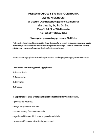 PRZEDMIOTOWY SYSTEM OCENIANIA JĘZYK NIEMIECKI w Liceum Ogólnokształcącym w Komornicy dla klas: 1a, 1c, 2a, 2c, 3b. Zespół Szkół w Wieliszewie Rok szkolny 2016/2017 Nauczyciel prowadzący: Iwona Zielioska Podręcznik: Direkt neu, Giorgio Motta, Beata Ćwikowska w oparciu o Program nauczania języka niemieckiego w szkołach dla klas I-III liceum ogólnokształcącego i klas I-IV technikum. IV etap edukacyjny – zakres podstawowy. Grażyna Zendrowska-Korpus W nauczaniu języka niemieckiego ocenie podlegają następujące elementy: I Podstawowe umiejętności językowe: 1. Rozumienie 2. Mówienie 3. Czytanie 4. Pisanie II Zapoznanie się z wybranymi elementami kultury niemieckiej. - położenie Niemiec - kraje związkowe Niemiec - znane nazwy firm niemieckich - symbole Niemiec i ich sławni przedstawiciele - znajomośd krajów niemieckojęzycznych 1 III Wiedza przybliżająca zrozumienie języka - zapoznanie z gramatyką i ortografią niemiecką - przybliżenie literatury niemieckiej: piosenki, wiersze i inne teksty literackie - znaczenie języka niemieckiego jako jednego z podstawowych języków obowiązujących w Unii Europejskiej. Ocenianie w trakcie roku szkolnego 1. Ilośd semestrów (pierwsze półrocze od września do ferii zimowych, drugie półrocze od pierwszego dnia po feriach do zakooczenia roku szkolnego w czerwcu). 2. Zasady i terminy wystawiania ocen: - ocenianie bieżące na podstawie odpowiedzi ustnych, aktywności na lekcji, pracy domowej, prowadzenia zeszytu, kartkówek; ocenianie prac pisemnych po zakooczeniu działu w podręczniku; ocena semestralna lub koocowa - roczna na podstawie ocen z danego okresu. 3. Zasady informowania ucznia i jego rodziców o wymaganiach i sposobach ich sprawdzania oraz ocenach i zagrożeniach. - zapoznanie uczniów i rodziców ze szkolnym i przedmiotowym systemem oceniania, informowanie ucznia każdorazowo o przyznaniu mu oceny, informowanie rodziców poprzez udostępnianie prac kontrolnych i wgląd w oceny z odpowiedzi ustnych w dzienniku klasowym podczas zebrao rodziców, uprzedzanie o „zagrożeniu” oceną niedostateczną z przedmiotu na 1 miesiąc przed koocem semestru lub roku szkolnego, w celu umożliwienia poprawy. 2 Sprawdzone i ocenione pisemne prace kontrolne oraz inna dokumentacja dotycząca oceniania ucznia są powszechnie dostępne uczniowi lub jego rodzicom. Dopuszczalne są dwie formy kopiowania: kserokopiarka oraz narzędzia multimedialne. Uzasadnia się każdą bieżącą ocenę szkolną, dotyczy to również ocen z ustnych form sprawdzania. Informowanie ucznia o poziomie jego osiągnięd edukacyjnych i jego zachowaniu oraz o postępach w tym zakresie, jak również udzielanie mu pomocy w nauce poprzez przekazanie informacji o tym, co zrobił dobrze i jak powinien się dalej uczyd. Informowanie rodziców o postępach i trudnościach ucznia w nauce, zachowaniu jak i o jego uzdolnieniach. 4. Zasady i terminy przeprowadzania prac kontrolnych i ich udostępniania uczniom i rodzicom. Pracę klasową obejmującą większy zakres materiału, zostaje zapowiedziana z co najmniej tygodniowym wyprzedzeniem. Termin zostaje wpisany do dziennika. Praca klasowa jest pisana przez daną jednostkę lekcyjną. Natomiast tzw. „kartkówki”, obejmujące mały zakres materiału, mogą byd pisane bez wcześniejszej zapowiedzi i zajmują tylko częśd lekcji. Wszystkie prace są przechowywane przez nauczyciela, rodzice mają prawo wglądu. Uczniowie mają również prawo wglądu po ich sprawdzeniu i wystawieniu ocen. Stwierdzenie faktu odpisywania (ściągania) podczas pracy klasowej lub kartkówki może spowodowad wystawienie oceny niedostatecznej. Nieodrobienie pracy domowej może byd podstawą wystawienia oceny niedostatecznej. 5. Zasady i procedury poprawiania ocen niedostatecznych. 3 Ocenę niedostateczną z pracy pisemnej można poprawid pisząc pracę ponownie w późniejszym terminie. Praca poprawkowa nie jest identyczna, jednak obejmuje ten sam materiał i jest konstruowana na tych samych zasadach, co praca właściwa. Podobnie postępuje się w przypadku odpowiedzi ustnych. 6. Kryteria ocen Ocena Ocena celująca Wymagania Uczeń potrafi zrozumieć bardziej złożoną wypowiedź ustną w języku niemieckim, umie przeczytać ze zrozumieniem tekst dbając o staranną wymowę, potrafi budować i wypowiadać bardziej złożone zdania oraz zapisać bez błędów usłyszany tekst. Wykazuje znajomość elementów kultury niemieckiej w stopniu świadczącym o szerszym zainteresowaniu tymi zagadnieniami. Ponadto zna i stosuje bezbłędnie reguły gramatyki i ortografii, zna na pamięć wiersze i piosenki niemieckie, „przerabiane w klasie”, posiada świadomość użyteczności języka i aktywnie uczestniczy w pracach na rzecz szkoły związanych z propagowaniem języka i kultury niemieckiej. Kryteria jak na ocenę bardzo dobrą, a ponadto zakres wiedzy i umiejętności znacznie wykraczający poza program nauczania. Ocenę celującą otrzymują również laureaci konkursów i olimpiad językowych. 5 Bardzo dobra 4 Dobra Uczeń potrafi zrozumieć wypowiedź ustną w języku niemieckim, umie przeczytać ze zrozumieniem tekst dbając o staranną wymowę, potrafi prawidłowo budować i wypowiadać zdania oraz zapisać (w miarę bezbłędnie) usłyszany tekst. Wykazuje dobrą znajomość elementów kultury niemieckiej. Ponadto zna i stosuje reguły gramatyki i ortografii, zna niektóre wiersze i piosenki niemieckie „przerabiane w klasie”, posiada świadomość użyteczności języka. Uczeń potrafi zrozumieć wypowiedź ustną w języku niemieckim, umie przeczytać ze zrozumieniem tekst, potrafi prawidłowo budować i wypowiadać zdania oraz zapisać (w miarę bezbłędnie) usłyszany tekst. Wykazuje podstawową znajomość elementów kultury niemieckiej. 6 4 3 2 1 Uczeń potrafi zrozumieć prostą wypowiedź ustną w języku niemieckim, umie przeczytać ze zrozumieniem prosty tekst, potrafi budować i wypowiadać proste zdania z zakr