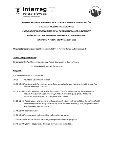 RAMOWY PROGRAM SZKOLENIA DLA POTENCJALNYCH MIKROBENEFICJENTÓW W RAMACH PROJEKTU PARASOLOWEGO „WSPÓLNE KSZTAŁCENIE ZAWODOWE NA POGRANICZU POLSKO-SŁOWACKIM” 3 OŚ PRIORYTETOWA PROGRAMU WSPÓŁPRACY TRANSGRANICZNEJ INTERREG V-A POLSKA-SŁOWACJA 2014-2020 Organizator szkolenia: Związek Euroregion „Tatry” w Nowym Targu, ul. Sobieskiego 2 Termin i miejsce szkolenia: 13 stycznia 2017 r., Ośrodek Współpracy Polsko-Słowackiej w Nowym Targu, ul. Sobieskiego 2 (sala konferencyjna) Program: 9.30-10.00 Rejestracja uczestników 10.00 Powitanie uczestników szkoleń 10.10-10.40 Podstawowe informacje na temat Programu Współpracy Transgranicznej Interreg V-A Polska - Słowacja 2014-2020 10.40- 11.00 Projekty parasolowe Związku Euroregion „Tatry” w partnerstwie z Samorządowym Krajem Preszowskim i Samorządowym Krajem Żylińskim (cele, grupy docelowe, wskaźniki, obszar wsparcia, dostępne środki z EFRR) 11.00-11.45 Podstawowe informacje o mikroprojektach (typy mikroprojektów, kwalifikowalność mikrobeneficjentów, miejsce realizacji, ramy czasowe realizacji, limity dofinansowania, kryteria oceny, uproszczenia) 11.45-12.00 Przerwa kawowa 12.00-13.00 Przygotowanie mikroprojektu na formularzu wniosku 13.00-13.45 Budżet zadaniowy i kwalifikujące się wydatki w mikroprojekcie 13.45-15.00 Pytania i odpowiedzi, dyskusja, indywidualne konsultacje.