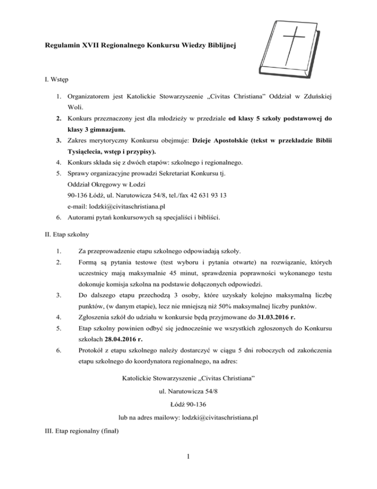 Regulamin XVII Regionalnego Konkursu Wiedzy Biblijnej I. Wstęp 1. Organizatorem jest Katolickie Stowarzyszenie „Civitas Christiana” Oddział w Zduńskiej Woli. 2. Konkurs przeznaczony jest dla młodzieży w przedziale od klasy 5 szkoły podstawowej do klasy 3 gimnazjum. 3. Zakres merytoryczny Konkursu obejmuje: Dzieje Apostolskie (tekst w przekładzie Biblii Tysiąclecia, wstęp i przypisy). 4. Konkurs składa się z dwóch etapów: szkolnego i regionalnego. 5. Sprawy organizacyjne prowadzi Sekretariat Konkursu tj. Oddział Okręgowy w Łodzi 90-136 Łódź, ul. Narutowicza 54/8, tel./fax 42 631 93 13 e-mail: [email protected] 6. Autorami pytań konkursowych są specjaliści i bibliści. II. Etap szkolny 1. Za przeprowadzenie etapu szkolnego odpowiadają szkoły. 2. Formą są pytania testowe (test wyboru i pytania otwarte) na rozwiązanie, których uczestnicy mają maksymalnie 45 minut, sprawdzenia poprawności wykonanego testu dokonuje komisja szkolna na podstawie dołączonych odpowiedzi. 3. Do dalszego etapu przechodzą 3 osoby, które uzyskały kolejno maksymalną liczbę punktów, (w danym etapie), lecz nie mniejszą niż 50% maksymalnej liczby punktów. 4. Zgłoszenia szkół do udziału w konkursie będą przyjmowane do 31.03.2016 r. 5. Etap szkolny powinien odbyć się jednocześnie we wszystkich zgłoszonych do Konkursu szkołach 28.04.2016 r. 6. Protokół z etapu szkolnego należy dostarczyć w ciągu 5 dni roboczych od zakończenia etapu szkolnego do koordynatora regionalnego, na adres: Katolickie Stowarzyszenie „Civitas Christiana” ul. Narutowicza 54/8 Łódź 90-136 lub na adres mailowy: [email protected] III. Etap regionalny (finał) 1 1. Za przeprowadzenie etapu regionalnego odpowiada koordynator regionalny. 2. Etap regionalny składa się z części pisemnej i ustnej. 3. W części pisemnej uczestnicy odpowiadają na pytania testowe, dostarczone w zamkniętych kopertach. 4. Do części ustnej przechodzi maksymalnie 7 osób z największą liczbą punktów uzyskanych w części pisemnej, lecz nie mniejszą niż 50% maksymalnej liczby punktów, tj. 45 punktów. 5. Część ustna przeprowadzona jest na podstawie pytań przygotowanych przez Organizatora. Sprawdzenia poprawności odpowiedzi dokonuje powołana Komisja. 6. W części ustnej stosuje się odrębny regulamin. 7. Etap regionalny (finał) odbędzie się 14.06.2016 r.(wtorek) w Zduńskiej Woli w Ośrodku Pamięci Świętego Maksymiliana Marii Kolbe, ul. Kościelna 20. 8. Organizatorzy zastrzegają sobie możliwość zmiany terminu finału w uzasadnionym przypadku, o czym powiadamiają uczestników finału. IV. Zakończenie. 1. Wgląd w sprawdzone testy na poszczególnych etapach Konkursu mają tylko organizatorzy. 2. Dane osobowe uczestników Konkursu oraz innych osób przekazujących swoje dane w związku z przeprowadzeniem i organizacją Konkursu będą przetwarzane zgodnie z ustawą z dnia 29 sierpnia 1997 roku o ochronie danych osobowych (Dz.U. z 2002 roku, Nr 101, poz. 926 z późn. zm.) 3. Administratorem danych będzie Organizator. Celem zbierania danych osobowych jest przeprowadzenie i organizacja Konkursu. 4. Przystępując do Konkursu uczestnik potwierdza i oświadcza, że dobrowolnie przystępuje do Konkursu i zapoznał się oraz zaakceptował treść Regulaminu. 5. Każdy Uczestnik ma prawo wglądu do swoich danych osobowych i ich poprawiania. 6. Uczestnik Konkursu, wyraża zgodę na opublikowanie jego danych tj. w przypadku zostania laureatem któregokolwiek z etapów Konkursu. 2