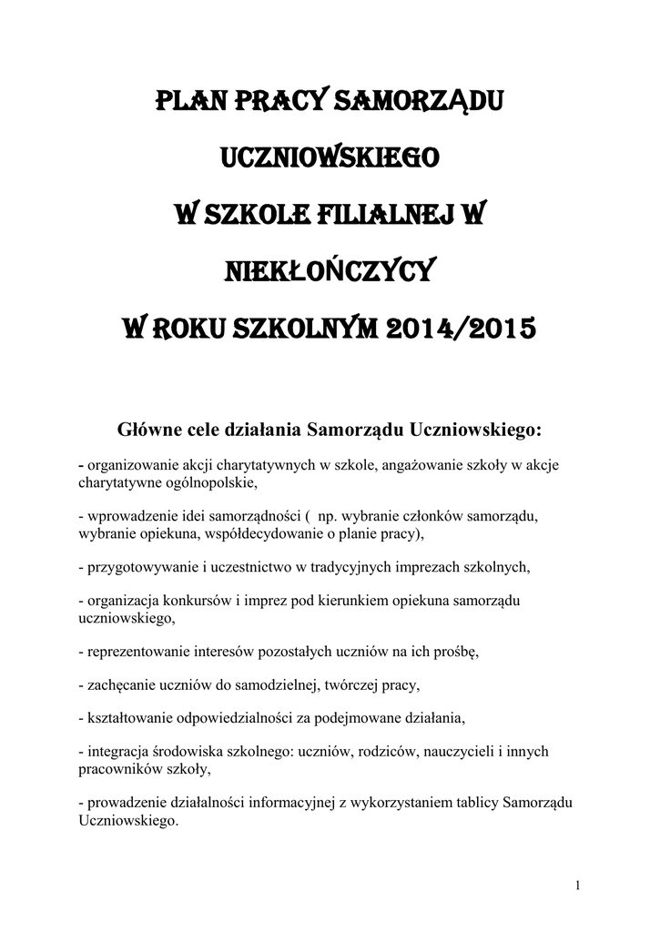 PLAN PRACY SAMORZĄDU UCZNIOWSKIEGO W SZKOLE FILIALNEJ W NIEKŁOŃCZYCY W ROKU SZKOLNYM 2014/2015 Główne cele działania Samorządu Uczniowskiego: - organizowanie akcji charytatywnych w szkole, angażowanie szkoły w akcje charytatywne ogólnopolskie, - wprowadzenie idei samorządności ( np. wybranie członków samorządu, wybranie opiekuna, współdecydowanie o planie pracy), - przygotowywanie i uczestnictwo w tradycyjnych imprezach szkolnych, - organizacja konkursów i imprez pod kierunkiem opiekuna samorządu uczniowskiego, - reprezentowanie interesów pozostałych uczniów na ich prośbę, - zachęcanie uczniów do samodzielnej, twórczej pracy, - kształtowanie odpowiedzialności za podejmowane działania, - integracja środowiska szkolnego: uczniów, rodziców, nauczycieli i innych pracowników szkoły, - prowadzenie działalności informacyjnej z wykorzystaniem tablicy Samorządu Uczniowskiego. 1 Termin realizacji Zadania WRZESIEŃ Spotkanie członków Samorządu Uczniowskiego z opiekunem. Zaprezentowanie propozycji do pracy i przygotowanie planu pracy Samorządu Uczniowskiego na rok szkolny 2014/2015 Zagospodarowanie gazetki szkolnej zgodnie z aktualną tematyką Współpraca Samorządu Uczniowskiego z redakcją gazetki SZKOLNY EKSPRES Kolorowy dzień w miesiącu - niebieski Zorganizowanie skrzynki na propozycje i prośby uczniów związane z działalnością Samorządu. Konkurs klasowy na największą liczbę żołędzi. Zebrane fundusze przekazane zostaną na Towarzystwo opieki nad zwierzętami w Policach – działalność charytatywna Udział w akcji „Pomóż i Ty” - działalność charytatywna PAŻDZIERNIK Zorganizowanie Dnia Chłopaka- mecz piłki nożnej dziewczyny kontra chłopcy Udział członków Samorządu w uroczystości Pasowania na ucznia kl. I połączonej z Dniem Edukacji Narodowej Kolorowy dzień w miesiącu - żółty Współpraca Samorządu Uczniowskiego z redakcją gazetki SZKOLNY EKSPRES Zagospodarowanie gazetki szkolnej zgodnie z aktualną tematyką Kontynuowanie konkursu klasowego na największą liczbę żołędzi - działalność charytatywna Udział członków Samorządu Uczniowskiego w Akademii z okazji Dnia Papieskiego 2 LISTOPAD Współpraca Samorządu Uczniowskiego z redakcją gazetki SZKOLNY EKSPRES Zagospodarowanie gazetki szkolnej zgodnie z aktualną tematyką Kolorowy dzień w miesiącu - pomarańczowy Przygotowanie wróżb andrzejkowych Włączenie się w akcję „Góra grosza” działalność charytatywna Zorganizowanie Święta Pluszowego Misia połączonego z konkursami i wymienianiem się maskotkami. Zbieranie rzeczy potrzebnych dla Domu Samotnej Matki działalność charytatywna. GRUDZIEŃ Kontynuowanie akcji „Góra grosza” - działalność charytatywna Kontynuowanie zbierania rzeczy potrzebnych dla Domu Samotnej Matki - działalność charytatywna. Udział w Wielkiej Orkiestrze Świątecznej Pomocy poprzez przygotowanie i sprzedaż prac - działalność charytatywna Kolorowy dzień w miesiącu - czerwony Zagospodarowanie gazetki szkolnej zgodnie z aktualną tematyką Przystrojenie korytarza szkolnego ozdobami świątecznymi Współpraca Samorządu Uczniowskiego z redakcją gazetki SZKOLNY EKSPRES STYCZEŃ Zorganizowanie zbiórki karmy dla schroniska dla zwierząt w Szczecinie - działalność charytatywna Współpraca Samorządu Uczniowskiego z redakcją gazetki SZKOLNY EKSPRES Zagospodarowanie gazetki szkolnej zgodnie z aktualną tematyką Kolorowy dzień w miesiącu - biały Podsumowanie akcji WOŚP 3 LUTY Zebranie podsumowujące działalność Samorządu Uczniowskiego w I semestrze Przeprowadzenie apelu podsumowującego I semestr roku szkolnego 2014/2015 Kontynuowanie zbiórki karmy dla schroniska dla zwierząt w Szczecinie - działalność charytatywna Kolorowy dzień w miesiącu - brązowy Zagospodarowanie gazetki szkolnej zgodnie z aktualną tematyką Współpraca Samorządu Uczniowskiego z redakcją gazetki SZKOLNY EKSPRES MARZEC Zorganizowanie Dnia Kobiet na sportowo lub dyskotekowo Zorganizowanie I Dnia Wiosny Współpraca Samorządu Uczniowskiego z redakcją gazetki SZKOLNY EKSPRES Zagospodarowanie gazetki szkolnej zgodnie z aktualną tematyką Kolorowy dzień w miesiącu - zielony KWIECIEŃ Zorganizowanie kiermaszu prac wielkanocnych i przekazanie uzyskanych funduszy na Towarzystwo opieki nad zwierzętami w Policach Współpraca Samorządu Uczniowskiego z redakcją gazetki SZKOLNY EKSPRES Zagospodarowanie gazetki szkolnej zgodnie z aktualną tematyką Kolorowy dzień w miesiącu - fioletowy MAJ Udział w akcji „Międzynarodowy dzień bez papierosa” Współpraca Samorządu Uczniowskiego z redakcją gazetki SZKOLNY EKSPRES Zagospodarowanie gazetki szkolnej zgodnie z aktualną tematyką Kolorowy dzień w miesiącu - niebieski 4 CZERWIEC Zebranie podsumowujące pracę Samorządu Uczniowskiego w roku szkolnym 2013-2014 Przeprowadzenie wyborów do Samorządu Uczniowskiego na rok szkolny 2015/2016 Przeprowadzenie apelu podsumowującego II semestr roku szkolnego 2014/2015 Współpraca Samorządu Uczniowskiego z redakcją gazetki SZKOLNY EKSPRES Zagospodarowanie gazetki szkolnej zgodnie z aktualną tematyką Kolorowy dzień w miesiącu - czerwony 5