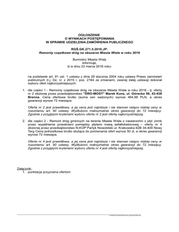 OGŁOSZENIE O WYNIKACH POSTĘPOWANIA W SPRAWIE UDZIELENIA ZAMÓWIENIA PUBLICZNEGO RGŚ.GK.271.5.2016.JP: Remonty cząstkowe dróg na obszarze Miasta Wisła w roku 2016 Burmistrz Miasta Wisły informuje, iż w dniu 23 marca 2016 roku: na podstawie art. 91 ust. 1 ustawy z dnia 29 stycznia 2004 roku ustawy Prawo zamówień publicznych (t.j. Dz. U. z 2015 r. poz. 2164 ze zmianami, zwanej dalej ustawą) dokonał wyboru ofert najkorzystniejszych: 1. dla części 1 - Remonty cząstkowe dróg na obszarze Miasta Wisła w roku 2016 - tj. oferty nr 2 złożonej przez przedsiębiorstwo "DRO-MOST" Marek Kunz, ul. Górecka 56, 43-438 Brenna. Cena ofertowa brutto (suma cen ważonych) wynosi 464,99 PLN, a okres gwarancji wynosi 72 miesiące. Oferta nr 2 jest prawidłowa, a jej cena jest najniższa i nie stanowi rażąco niskiej ceny w rozumieniu art. 90 ustawy. Wydłużono maksymalnie okres gwarancji do 72 miesięcy. Zgodnie z przyjętymi kryteriami wyboru oferta nr 2 jest ofertą najkorzystniejszą. 2. dla części 2 - Remont dróg gminnych na terenie Miasta Wisła o nawierzchni z płyt Jomb przez wypełnienie przestrzeni pomiędzy płytami masą asfaltobetonową – oferty nr 4 złożonej przez przedsiębiorstwo N-KOP Partyk Nowobilski ul. Krakowska 62B 34-400 Nowy Targ Cena jednostkowa brutto służąca do porównania ofert wynosi 50 zł, a okres gwarancji wynosi 72 miesiące. Oferta nr 4 jest prawidłowa, a jej cena jest najniższa i nie stanowi rażąco niskiej ceny w rozumieniu art. 90 ustawy. Wydłużono maksymalnie okres gwarancji do 72 miesięcy. Zgodnie z przyjętymi kryteriami wyboru oferta nr 4 jest ofertą najkorzystniejszą. Załącznik: 1. punktacja przyznana ofertom [J:\INWESTYCJE\2016\GK\remonty cząstkowe\WYNIKI.odt] Załącznik: 1. punktacja przyznana ofertom Dla części 1 L p . Firma Adres Cena ofertowa służąca porównaniu ofert 94% Eurovia Polska 1 SA Bielany Wrocławskie ul. 666,05 zł Szwedzka 5 55-040 Kobierzyce Okres gwarancji Łączna punktacja Ilość punktó w 6% Ilość punktów 65,62 72 miesiące 6 71,62 2 Dro-Most Marek ul. Górecka 56 43Kunz 438 Brenna 464,99 zł 94,00 72 miesiące 6 100,00 5 Auto-Trans ul. Ks. Roboty 80 547,66 zł Asfalty Sp z o.o. 44-186 Gierałtowice 79,81 60 miesięcy 4 83,81 Dla części 2 L p . Firma Adres Cena ofertowa służąca porównaniu ofert Okres gwarancji Łączna punktacja 94% Ilość punktó w 6% Ilość punktów 51,66 zł 90,98 72 miesiące 6 96,98 58,97 zł 79,70 72 miesiące 6 85,70 Firma Handlowo Kaszów 599 32-060 3 Usługowa 65,00 zł Liszki Piekara Adam 72,31 72 miesiące 6 78,31 Eurovia Polska 1 SA 2 Bielany Wrocławskie ul. Szwedzka 5 55-040 Kobierzyce Dro-Most Marek ul. Górecka 56 43Kunz 438 Brenna 4 N-KOP Partyk Nowobilski 50,00 zł 94,00 72 miesiące 6 100,00 5 Auto-Trans ul. Ks. Roboty 80 55,35 zł Asfalty Sp z o.o. 44-186 Gierałtowice 84,91 60 miesięcy 4 88,91 ul. Krakowska 62B 34-400 Nowy Targ [J:\INW ESTYCJE\2016\GK\remonty cząstkowe\WYNIKI.odt]