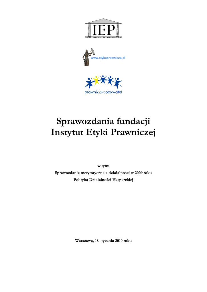 Sprawozdania fundacji Instytut Etyki Prawniczej w tym: Sprawozdanie merytoryczne z działalności w 2009 roku Polityka Działalności Eksperckiej Warszawa, 18 stycznia 2010 roku Sprawozdanie merytoryczne z działalności fundacji Instytut Etyki Prawniczej w 2009 roku Instytut Etyki Prawniczej w 2009 roku realizował zarówno projekty stałe (redagowanie serwisu internetowego etyki prawniczej i zawodów prawniczych www.etykaprawnicza.pl, edycja książkowej serii wydawniczej Biblioteka Etyki Prawniczej), jak i prowadził bieżącą działalność (organizacja i udział w konferencjach, wsparcie projektów Studenckiego Stowarzyszenia Etyki Prawniczej). Instytut Etyki Prawniczej podejmował w 2009 roku następujące działania: 1. Redagowanie serwisu internetowego www.etykaprawnicza.pl Wortal www.etykaprawnicza.pl został uruchomiony na początku czerwca 2007 roku. W 2009 kontynuował on swoją działalność poprzez codzienne aktualizacje. W 2009 roku w skład redakcji wchodziły trzy osoby. Na wortal składają się przygotowywane przez jego redakcję następujące informacje: bieżące wiadomości z zakresu debaty publicznej dotyczącej zawodów prawniczych i etyki prawniczej obejmujące między innymi wypowiedzi organów władzy publicznej, samorządów i stowarzyszeń zawodowych oraz osób aktywnych w środowisku prawniczym, projekty i teksty aktów normatywnych oraz uchwały dotyczące problematyki zawodów prawniczych i wymiaru sprawiedliwości, zapowiedzi i sprawozdania z konferencji i seminariów dotyczących problematyki wortalu, w których uczestniczyły osoby związane z Instytutem, recenzje sporządzane zgodnie z wytycznymi Annotated Bibliography dla Cornell University Library. Od momentu powstania można obserwować pozytywne tendencje w zakresie popularności wortalu, co przejawia się nie tylko we wzroście liczby odwiedzin, lecz także we wzroście liczby stałych gości serwisu oraz średnim czasie spędzonym na jego stronach. Źródło: GoogleAnalytics Źródło: GoogleAnalytics Koszty funkcjonowania Wortalu w 2009 roku: Koszty wynagrodzeń Hosting i domena Razem 4.032,00 292,80 4.324,80 2. Edycja serii wydawniczej Biblioteka Etyki Prawniczej Seria wydawnicza Biblioteka Etyki Prawniczej jest z założenia otwarta na wszelkie pozycje z zakresu problematyki etyki prawniczej i zawodów prawniczych. Po rozmowach z kilkoma wydawnictwami ostatecznie partnerem Instytutu w tym zakresie zostało Wydawnictwo LexisNexis Sp. z o.o. Pierwszą pozycję w serii stanowi praca zbiorowa „Etyka prawnicza – stanowiska i perspektywy” pod redakcją naukową Huberta Izdebskiego i Pawła Skuczyńskiego, która ukazała się w 2008 roku. Publikacja została dofinansowana przez Wydział Prawa i Administracji Uniwersytetu Warszawskiego oraz Fundację Uniwersytetu Warszawskiego na łączną kwotę 8.000 zł. Drugą pozycję serii stanowi „Etyka sytuacyjna prawnika” autorstwa Marcina Pieniążka, która ukazała się w 2008 roku, będąca skróconą wersją obronionej na Uniwersytecie Jagiellońskim pracy doktorskiej. Publikacja została dofinansowana przez Instytut Etyki Prawniczej kwotą 10.000 zł. Trzecią pozycję serii stanowi „Etyka w administracji publicznej” autorstwa Iwony Boguckiej i Tomasza Pietrzykowskiego, która ukazała się w 2009 roku. Publikacja została dofinansowana przez Instytut Etyki Prawniczej kwotą 8.000 zł. 3. Konferencja „Edukacja etyczna prawników – cele i metody” Konferencja „Edukacja etyczna prawników – cele i metody” odbyła się 8 czerwca 2009 roku. Jej współorganizatorem był Instytut Nauk o Państwie i Prawie Uniwersytetu Warszawskiego, a patronem Dziekan Wydziału Prawa i Administracji Uniwersytetu Warszawskiego. Punktem wyjścia był fakt, iż rozporządzeniem Ministra nauki i szkolnictwa wyższego z dnia 12 lipca 2007 r., ustanawiającego m.in. standardy kształcenia na kierunku prawo zobowiązało wydziały prawa w Polsce do umieszczenia w programach kształcenia prawniczego treści poszerzających wiedzę humanistyczną, w szczególności z zakresu etyki prawniczej – wymienionej obok filozofii, psychologii czy socjologii. W konsekwencji etyka prawnicza znalazła się w programach nauczania w zasadzie wszystkich wydziałów prawa w Polsce. Podstawowym celem konferencji „Edukacja etyczna prawników – cele i metody” była wymiana doświadczeń dotyczących dydaktyki etyki prawniczej. Dlatego też poruszone zostały zarówno zagadnienia edukacji etycznej w ogóle i jej stosunku do kształcenia z zakresu etyki zawodowej, jak i szczegółowe kwestie treści zawartych w syllabusach etyki prawniczej w naszym kraju. Osobno dyskutowane były kwestie celów edukacji etycznej prawników, a w szczególności ich minimalistycznych i maksymalistycznych ujęć oraz relatywizacji do modeli kształcenia prawniczego. Podjęte zostały także problemy metod edukacji etycznej prawników i ich efektywności, ze szczególnym uwzględnieniem kształcenia klinicznego oraz tzw. pervasive method. W obradach udział wzięli prof. dr hab. Magdalena Środa, Uniwersytet Warszawski (referat „Edukacja etyczna a etyka zawodowa”), prof. dr hab. Hubert Izdebski, Uniwersytet Warszawski (referat „Syllabus etyki prawniczej - doświadczenia polskie”), dr Iwona Bogucka, Uniwersytet Śląski (referat „Minimalistyczne i maksymalistyczne cele edukacji etycznej prawników”), dr Paweł Łabieniec, Uniwersytet Łódzki (referat „Etyka prawnicza w ogólnym i wyspecjalizowanym typie kształcenia prawniczego”), dr Paweł Skuczyński, Uniwersytet Warszawski (referat „Pervasive method w edukacji etycznej a kierunki badań w etyce prawniczej”) oraz mgr Łukasz Bojarski, Helsińska Fundacja Praw Człowieka (referat „Etyka prawnicza w praktyce na przykładzie edukacji klinicznej”). Do druku przygotowywana jest pokonferencyjna publikacja. 4. Seminarium badawcze „Granice działalności prawnika na rzecz klienta” W roku 2009 kontynuowane było organiz