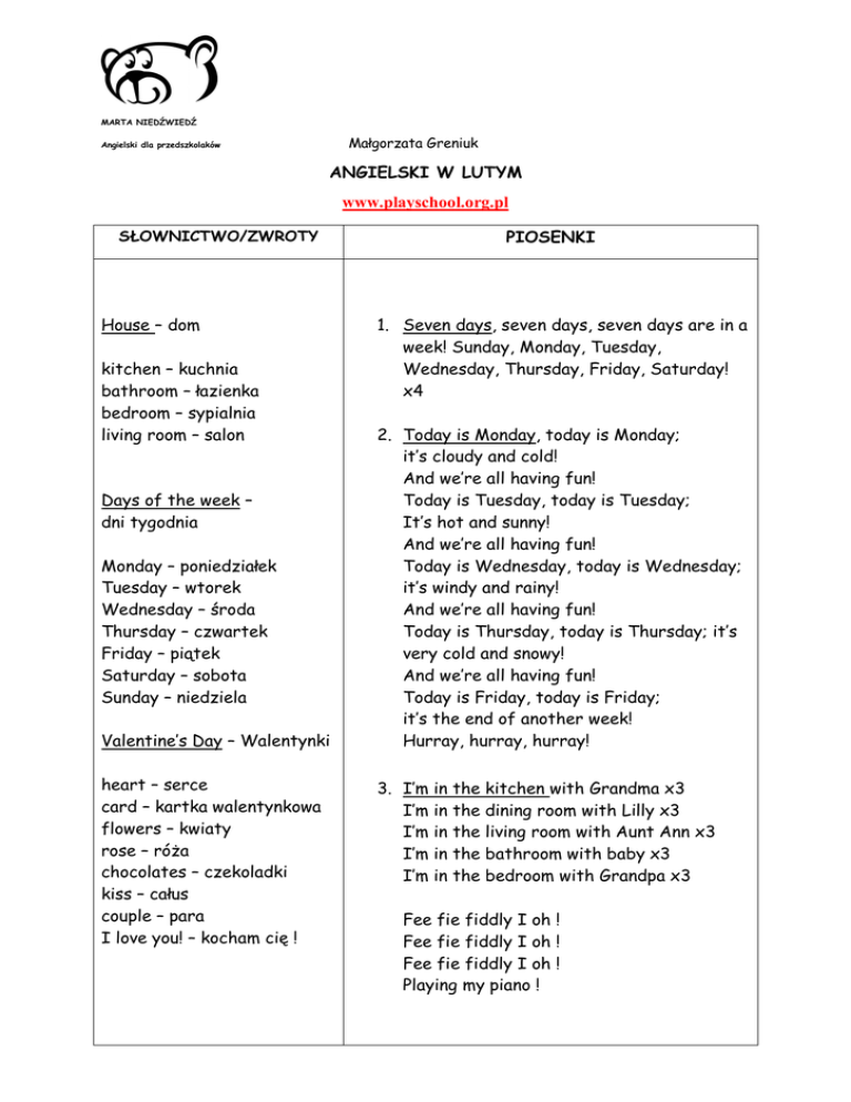 MARTA NIEDŹWIEDŹ Małgorzata Greniuk Angielski dla przedszkolaków ANGIELSKI W LUTYM www.playschool.org.pl SŁOWNICTWO/ZWROTY House – dom kitchen – kuchnia bathroom – łazienka bedroom – sypialnia living room – salon Days of the week – dni tygodnia Monday – poniedziałek Tuesday – wtorek Wednesday – środa Thursday – czwartek Friday – piątek Saturday – sobota Sunday – niedziela Valentine’s Day – Walentynki heart – serce card – kartka walentynkowa flowers – kwiaty rose – róża chocolates – czekoladki kiss – całus couple – para I love you! – kocham cię ! PIOSENKI 1. Seven days, seven days, seven days are in a week! Sunday, Monday, Tuesday, Wednesday, Thursday, Friday, Saturday! x4 2. Today is Monday, today is Monday; it’s cloudy and cold! And we’re all having fun! Today is Tuesday, today is Tuesday; It’s hot and sunny! And we’re all having fun! Today is Wednesday, today is Wednesday; it’s windy and rainy! And we’re all having fun! Today is Thursday, today is Thursday; it’s very cold and snowy! And we’re all having fun! Today is Friday, today is Friday; it’s the end of another week! Hurray, hurray, hurray! 3. I’m I’m I’m I’m I’m in the kitchen with Grandma x3 in the dining room with Lilly x3 in the living room with Aunt Ann x3 in the bathroom with baby x3 in the bedroom with Grandpa x3 Fee fie fiddly I oh ! Fee fie fiddly I oh ! Fee fie fiddly I oh ! Playing my piano !