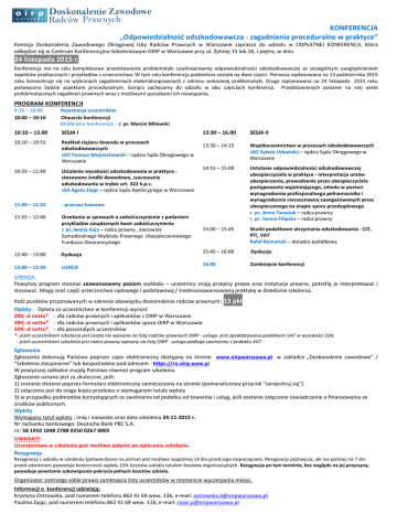KONFERENCJA „Odpowiedzialność odszkodowawcza - zagadnienia proceduralne w praktyce” Komisja Doskonalenia Zawodowego Okręgowej Izby Radców Prawnych w Warszawie zaprasza do udziału w ODPŁATNEJ KONFERENCJI, która odbędzie się w Centrum Konferencyjno-Szkoleniowym OIRP w Warszawie przy ul. Żytniej 15 lok.16, I piętro, w dniu 24 listopada 2015 r. Konferencja ma na celu kompleksowe przedstawienie problematyki cywilnoprawnej odpowiedzialności odszkodowawczej ze szczególnym uwzględnieniem aspektów praktycznych i przykładów z orzecznictwa. W tym celu konferencja podzielona została na dwie części. Pierwsza zaplanowana na 13 października 2015 roku koncentruje się na wybranych zagadnieniach materialnoprawnych z zakresu wskazanej problematyki. Druga zaplanowana na 24 listopada 2015 roku poświęcona będzie aspektom proceduralnym. Gorąco zachęcamy do udziału w obu częściach konferencji. Przedstawionych zostanie na niej wiele problematycznych zagadnień prawnych wraz z możliwymi sposobami ich rozwiązania. PROGRAM KONFERENCJI 9:30 – 10:00 10:00 – 10:10 Rejestracja uczestników Otwarcie konferencji Moderator konferencji - r. pr. Marcin Milewski 10:10 – 13.00 SESJA I 10:10 – 10:55 Rozkład ciężaru dowodu w procesach odszkodowawczych sSO Tomasz Wojciechowski – sędzia Sądu Okręgowego w Warszawie 10:55 – 11:40 Ustalanie wysokości odszkodowania w praktyce stosowane środki dowodowe, szacowanie odszkodowania w trybie art. 322 k.p.c. sSA Agata Zając – sędzia Sądu Apelacyjnego w Warszawie 11:40 – 11:55 - przerwa kawowa 11:55 – 12:40 Orzekanie w sprawach o zadośćuczynienie z podaniem przykładów zasądzonych kwot zadośćuczynienia r. pr. Iwona Kaja – radca prawny , kierownik Samodzielnego Wydziału Prawnego Ubezpieczeniowego Funduszu Gwarancyjnego 12:40 – 13:00 Dyskusja 13:00 – 13:30 LUNCH 13:30 – 16.00 SESJA II 13:30 – 14:15 Współuczestnictwo w procesach odszkodowawczych sSO Sylwia Urbańska – sędzia Sądu Okręgowego w Warszawie 14:15 – 15:00 Ustalanie odpowiedzialności odszkodowawczej ubezpieczyciela w praktyce - interpretacja umów ubezpieczenia, prowadzenie przez ubezpieczyciela postępowania wyjaśniającego, szkoda w postaci wynagrodzenia profesjonalnego pełnomocnika i wynagrodzenia rzeczoznawcy zaangażowanych przez ubezpieczonego na etapie sporu przedsądowego r. pr. Anna Tarasiuk – radca prawny r. pr. Iwona Filipska – radca prawny 15:00 – 15:45 Skutki podatkowe otrzymania odszkodowania - CIT, PIT, VAT Rafał Romański – doradca podatkowy 15:45 – 16:00 Dyskusja 16.00 Zamknięcie konferencji UWAGA: Powyższy program stanowi zaawansowany poziom wykładu – uczestnicy znają przepisy prawa oraz instytucje prawne, potrafią je interpretować i stosować. Mogą znać część orzecznictwa sądowego i podstawową / średniozaawansowaną praktykę w dziedzinie szkolenia. .\ Ilość punktów przyznawanych w zakresie obowiązku doskonalenia radców prawnych: 13 pkt Opłaty: Opłata za uczestnictwo w konferencji wynosi: 290,-zł netto* - dla radców prawnych i aplikantów z OIRP w Warszawie 490,-zł netto* - dla radców prawnych i aplikantów spoza OIRP w Warszawie 599,-zł netto* - dla pozostałych uczestników *- jeżeli uczestnikiem szkolenia jest osoba nie wpisana na listę radców prawnych OIRP - usługa jest opodatkowana podatkiem VAT w wysokości 23% - jeżeli uczestnikiem szkolenia jest radca prawny wpisany na listę OIRP - usługa podlega zwolnieniu z podatku VAT Zgłoszenia Zgłoszenia dokonują Państwo poprzez zapis elektroniczny dostępny na stronie www.oirpwarszawa.pl w zakładce „Doskonalenie zawodowe” / ”Szkolenia stacjonarne” lub bezpośrednio pod adresem https://ro.oirp.waw.pl W powyższej zakładce znajdą Państwo również program szkolenia. Zgłoszenie uznane jest za skuteczne, jeśli: 1) zostanie złożone poprzez formularz elektroniczny zamieszczony na stronie (pomarańczowy przycisk "zarejestruj się") 2) załączona jest do niego kopia przelewu o wymaganym tytule wpłaty 3) w przypadku podmiotów korzystających ze zwolnienia od podatku od towarów i usług, jeśli zostanie załączone oświadczenie o finansowaniu ze środków publicznych. Wpłaty Wymagany tytuł wpłaty : imię i nazwisko oraz data szkolenia 24-11-2015 r. Nr rachunku bankowego: Deutsche Bank PBC S.A. nr: 58 1910 1048 2788 0250 0267 0005 UWAGA!!! Uczestnictwo w szkoleniu jest możliwe jedynie po opłaceniu szkolenia. Rezygnacja Rezygnacja z udziału w szkoleniu (potwierdzona na piśmie) jest możliwa najpóźniej 14 dni przed jego rozpoczęciem. Rezygnacja późniejsza, ale nie później niż 7 dni przed szkoleniem powoduje konieczność wpłaty 15% kosztów udziału tytułem kosztów organizacyjnych. Rezygnacja po tym terminie, bez względu na jej przyczynę, powoduje powstanie zobowiązania pokrycia pełnych kosztów udziału. Organizator zastrzega sobie prawo zamknięcia listy uczestników w momencie wyczerpania miejsc. Informacji o konferencji udzielają: Krystyna Ostrowska, pod numerem telefonu 862 41 69 wew. 136, e-mail: [email protected] Paulina Zając, pod numerem telefonu 862 41 69 wew. 116, e-mail: [email protected]