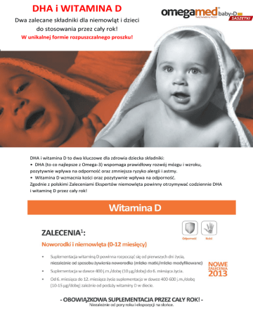 DHA i WITAMINA D Dwa zalecane składniki dla niemowląt i dzieci do stosowania przez cały rok! W unikalnej formie rozpuszczalnego proszku! DHA i witamina D to dwa kluczowe dla zdrowia dziecka składniki: • DHA (to co najlepsze z Omega-3) wspomaga prawidłowy rozwój mózgu i wzroku, pozytywnie wpływa na odporność oraz zmniejsza ryzyko alergii i astmy. • Witamina D wzmacnia kości oraz pozytywnie wpływa na odporność. Zgodnie z polskimi Zaleceniami Ekspertów niemowlęta powinny otrzymywać codziennie DHA i witaminę D przez cały rok! INNOWACJA! DHA (100 mg) i Witamina D (400 j.m.) w unikalnej formie rozpuszczalnego proszku www.omegamed.pl