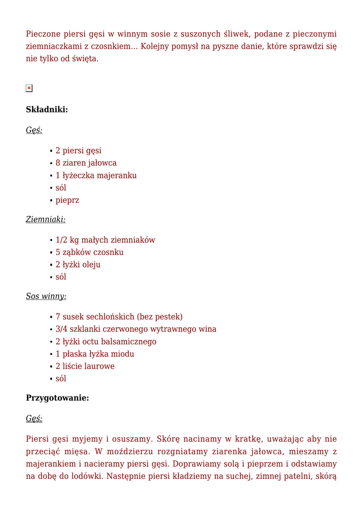 Pierś gęsi z suską sechlońską w sosie z czerwonego wina i