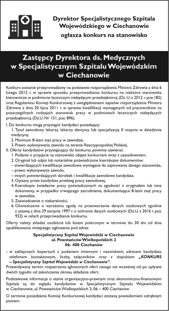Dyrektor Specjalistycznego Szpitala Wojewódzkiego w Ciechanowie ogłasza konkurs na stanowisko Zastępcy Dyrektora ds. Medycznych w Specjalistycznym Szpitalu Wojewódzkim w Ciechanowie Konkurs zostanie przeprowadzony na podstawie rozporządzenia Ministra Zdrowia z dnia 6 lutego 2012 r. w sprawie sposobu przeprowadzania konkursu na niektóre stanowiska kierownicze w podmiocie leczniczym niebędącym przedsiębiorcą (Dz. U. z 2012 r. poz.182) oraz Regulaminu Komisji Konkursowej z uwzględnieniem zapisów rozporządzenia Ministra Zdrowia z dnia 20 lipca 2011 r. w sprawie kwalifikacji wymaganych od pracowników na poszczególnych rodzajach stanowisk pracy w podmiotach leczniczych niebędących przedsiębiorcą (Dz.U. Nr 151, poz. 896). I. Do konkursu mogą przystąpić kandydaci posiadający: 1. Tytuł zawodowy lekarza, lekarza dentysty lub specjalizację II stopnia w dziedzinie medycyny, 2. Minimum 8-letni staż pracy w zawodzie, 3. Prawo wykonywania zawodu na terenie Rzeczypospolitej Polskiej. II. Oferty kandydatów przystępujący do konkursu powinny zawierać: 1. Podanie o przyjęcie na stanowisko objęte konkursem wraz z uzasadnieniem, 2. Oryginał lub odpis lub notarialnie poświadczone kserokopie dokumentów: – stwierdzających kwalifikacje zawodowe wymagane do zajmowania danego stanowiska, – prawo wykonywania zawodu, – innych potwierdzających dorobek i kwalifikacje zawodowe kandydata. 3. Opisany przez kandydata przebieg pracy zawodowej, 4. Kserokopie świadectw pracy poświadczonych za zgodność z oryginałem lub inne dokumenty, w przypadku trwającego zatrudnienia, dokumentujące 8-letni staż pracy w zawodzie, 5. Zaświadczenie o niekaralności, 6. Oświadczenie o wyrażeniu zgody na przetwarzanie danych osobowych zgodnie z ustawą z dnia 29 sierpnia 1997 r. o ochronie danych osobowych (Dz.U. z 2016 r. poz. 922) w celach przeprowadzenia konkursu. Oferty należy składać osobiście lub listem poleconym w terminie do 30 dni od dnia opublikowania niniejszego ogłoszenia pod adres: Specjalistyczny Szpital Wojewódzki w Ciechanowie ul. Powstańców Wielkopolskich 2 06- 400 Ciechanów – w zaklejonych kopertach z podaniem imiennym i nazwiskiem, adresem kandydata, telefonem kontaktowym, liczbą załączników oraz z dopiskiem „KONKURS – Specjalistyczny Szpital Wojewódzki w Ciechanowie”. Przewidywany termin rozpatrzenia zgłoszonych ofert nastąpi nie wcześniej niż po upływie dwóch tygodni od zakończenia okresu składania ofert. Podstawowe informacje o stanie organizacyjno-prawnym oraz ekonomiczno-finansowym Szpitala są do wglądu kandydatów w Specjalistycznym Szpitalu Wojewódzkim w Ciechanowie, ul. Powstańców Wielkopolskich 2; 06 – 400 Ciechanów. O terminie posiedzenia Komisji Konkursowej kandydaci zostaną powiadomieni odrębnym pismem.