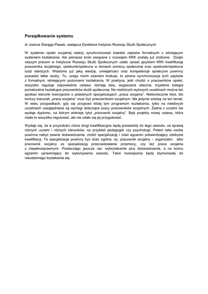 Porządkowanie systemu dr Joanna Staręga-Piasek, zastępca Dyrektora Instytutu Rozwoju Służb Społecznych W systemie opieki socjalnej należy synchronizować kwestie zapisów formalnych z istniejącym systemem kształcenia. Ale pierwsze kroki związane z rozwojem KRK zostały już zrobione. Dzięki naszym pracom w Instytucie Rozwoju Służb Społecznych udało opisać językiem KRK kwalifikację pracownika socjalnego, opiekunki/opiekuna w domach pomocy społecznej oraz opiekunki/opiekuna ludzi starszych. Wiadomo już jaką wiedzę, umiejętności oraz kompetencje społeczne powinny posiadać takie osoby. To, czego moim zdaniem brakuje, to pewna synchronizacja tych zapisów z formalnym, istniejącymi poziomami kształcenia. W praktyce, jeśli chodzi o pracowników opieki, wszystko reguluje odpowiednia ustawa. Istnieją dwa, wygaszane obecnie, trzyletnie kolegia pomaturalne kształcące pracowników służb społecznej. Na niektórych wyższych uczelniach można też spotkać kierunki licencjackie o podobnych specjalizacjach „praca socjalna”. Niekoniecznie ktoś, kto kończy kierunek „praca socjalna” musi być pracownikiem socjalnym. Ma jedynie wiedzę na ten temat. W wielu przypadkach, gdy się przyjrzeć bliżej tym programom kształcenia, tylko na niektórych uczelniach uwzględniane są wymogi dotyczące pracy pracowników socjalnych. Żadna z uczelni nie wydaje dyplomu, na którym widnieje tytuł „pracownik socjalny”. Były projekty nowej ustawy, która miała to wszystko regulować, ale nie udało się jej przygotować. Wydaje się, że w przyszłości różne drogi kwalifikacyjne będą prowadziły do tego zawodu, za sprawą różnych uczelni i różnych kierunków, na przykład pedagogiki czy psychologii. Potem taka osoba powinna nabyć pewne doświadczenie, zrobić specjalizację i zdać egzamin potwierdzający zdobycie kwalifikacji. Te specjalizacje powinny być dość ogólne, np. pracownik socjalny – organizator, albo pracownik socjalny ze specjalizacją przeciwdziałanie przemocy, czy też praca socjalna z niepełnosprawnymi. Powtarzając jeszcze raz: wykształcenie plus doświadczenie, a na końcu egzamin uprawniający do wykonywania zawodu. Takie rozwiązania będą stymulowały do nieustannego kształcenia się.