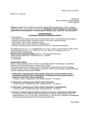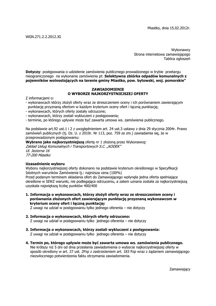 Miastko, dnia 15.02.2012r. WGN.271.2.2.2012.JG Wykonawcy Strona internetowa zamawiającego Tablica ogłoszeń Dotyczy: postępowania o udzielenie zamówienia publicznego prowadzonego w trybie przetargu nieograniczonego na wykonanie zamówienia pt: Selektywna zbiórka odpadów komunalnych z pojemników wolnostojących na terenie gminy Miastko, pow. bytowski, woj. pomorskie” ZAWIADOMIENIE O WYBORZE NAJKORZYSTNIEJSZEJ OFERTY Z informacjami o: - wykonawcach którzy złożyli oferty wraz ze streszczeniem oceny i ich porównaniem zawierającym punktację przyznaną ofertom w każdym kryterium oceny ofert i łączną punktację; - wykonawcach, których oferty zostały odrzucone; - wykonawcach, którzy zostali wykluczeni z postępowania; - terminie, po którego upływie może być zawarta umowa ws. zamówienia publicznego. Na podstawie art.92 ust.1 i 2 z uwzględnieniem art. 24 ust.3 ustawy z dnia 29 stycznia 2004r. Prawo zamówień publicznych (tj. Dz. U. z 2010r. Nr 113, poz. 759 ze zm.) zawiadamia się, że w przeprowadzonym postępowaniu: Wybrano jako najkorzystniejszą ofertę nr 1 złożoną przez Wykonawcę: Zakład Usług Komunalnych i Transportowych S.C. „KODEK” Ul. Jeziorna 16 77-200 Miastko Uzasadnienie wyboru Wyboru najkorzystniejszej oferty dokonano na podstawie kryterium określonego w Specyfikacji Istotnych warunków Zamówienia tj.: najniższa cena (100%) Przed podanym terminem składania ofert do Zamawiającego wpłynęła jedna oferta spełniająca określone w SIWZ warunki, nie podlegająca odrzuceniu, a zatem uznana została za najkorzystniejszą uzyskała największą liczbę punktów 400/400 1. Informacja o wykonawcach, którzy złożyli oferty wraz ze streszczeniem oceny i porównania złożonych ofert zawierającym punktację przyznaną wykonawcom w kryterium oceny ofert i łączną punktację: Z uwagi na udział w postępowaniu tylko jednego oferenta – nie dotyczy 2. Informacja o wykonawcach, których oferty odrzucono: Z uwagi na udział w postępowaniu tylko jednego oferenta – nie dotyczy 3. Informacja o wykonawcach, którzy zostali wykluczeni z postępowania: Z uwagi na udział w postępowaniu tylko jednego oferenta – nie dotyczy 4. Termin po, którego upływie może być zawarta umowa ws. zamówienia publicznego. Nie krótszy niż 5 dni od dnia przesłania zawiadomienia o wyborze najkorzystniejszej oferty w sposób określony w art. 27 ust. 2Pzp z zastrzeżeniem art. 183 Pzp wraz z żądaniem zamawiającego niezwłocznego potwierdzenia faktu otrzymania zawiadomienia. Zamawiający